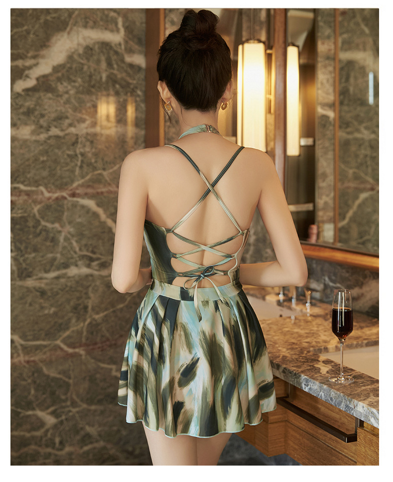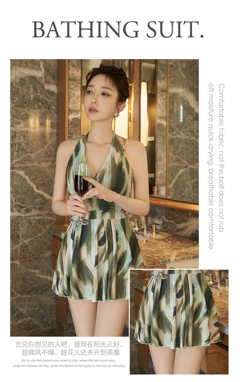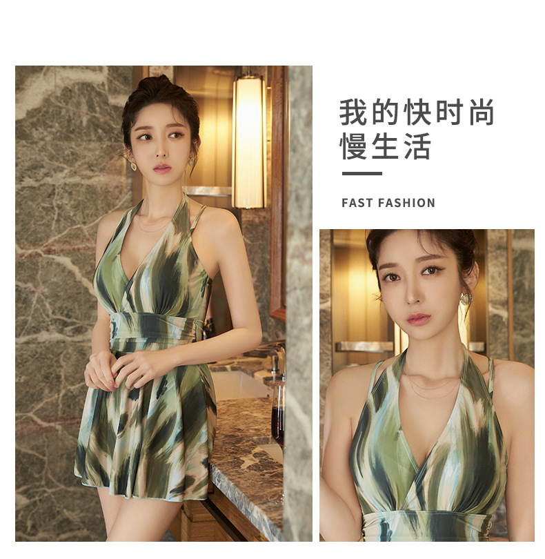 섹시한 원피스 수영복 여성의 2024 새로운 작은 가슴은 느슨한 오버 스커트 Huludao 수영복 백리스 테더 수영복을 모았습니다.