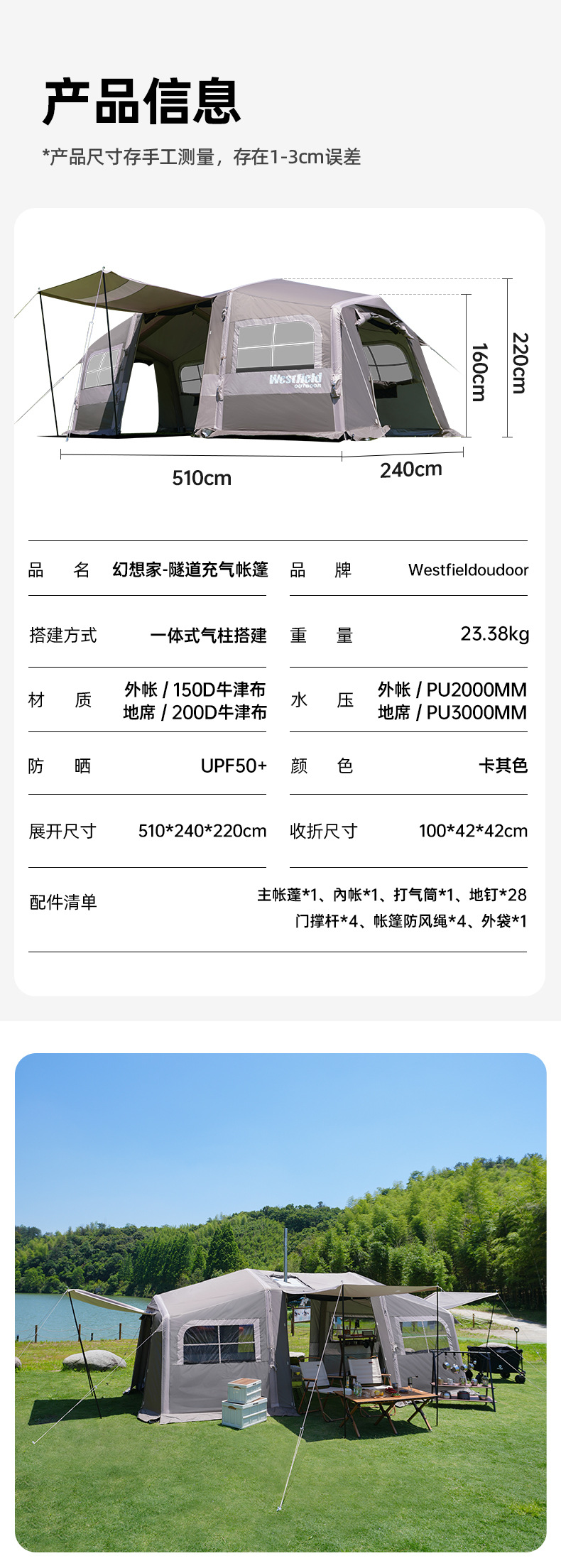 나는 팽창식 텐트를 가지고 야외에서 캠핑을 하고 싶어합니다. 두 개의 방과 거실이 있는 두꺼운 방수 텐트입니다.스토어 가기