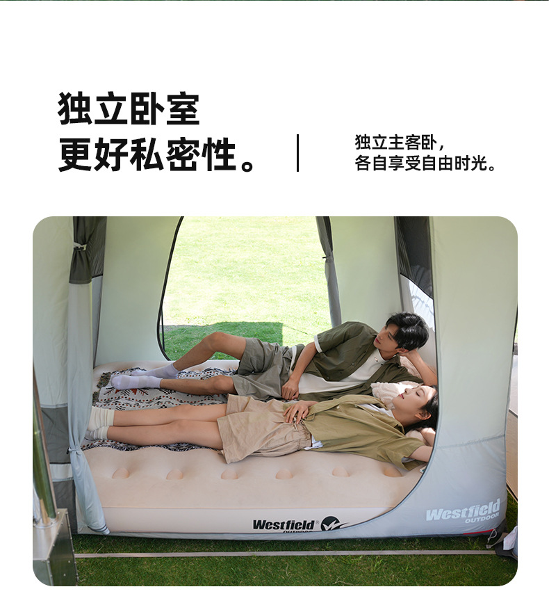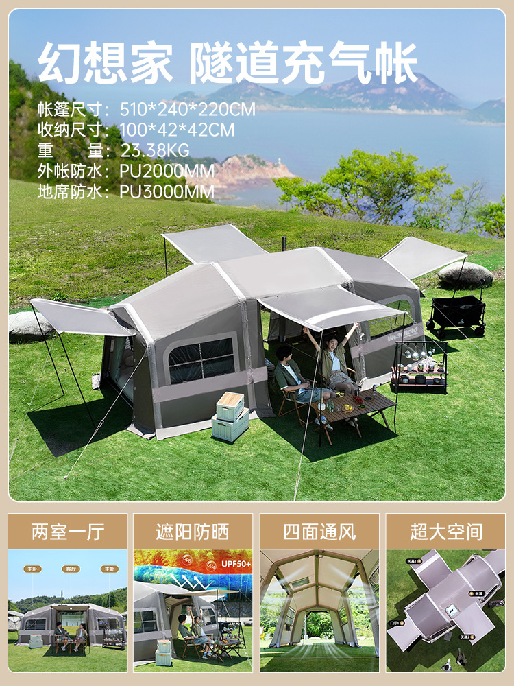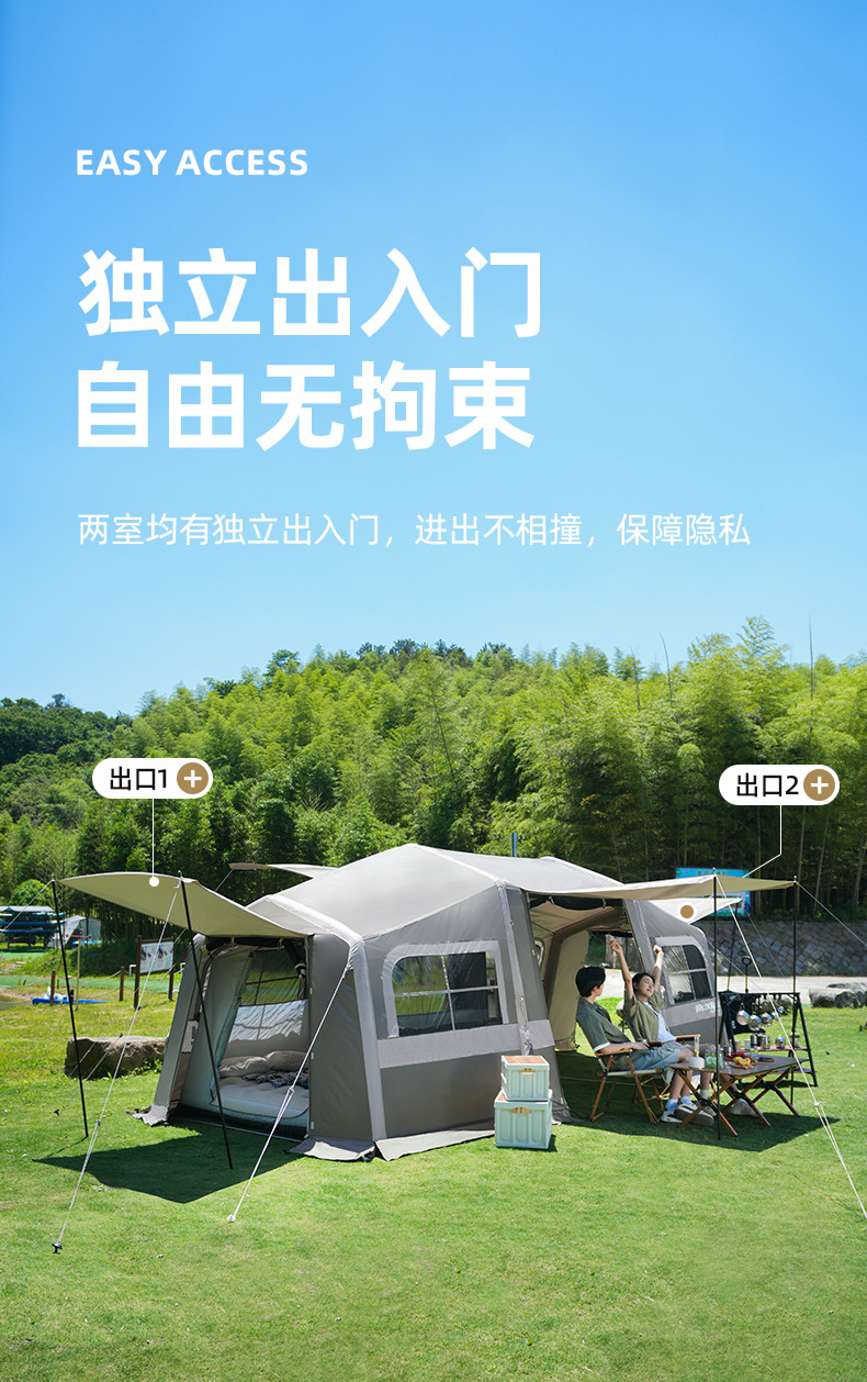 나는 팽창식 텐트를 가지고 야외에서 캠핑을 하고 싶어합니다. 두 개의 방과 거실이 있는 두꺼운 방수 텐트입니다.