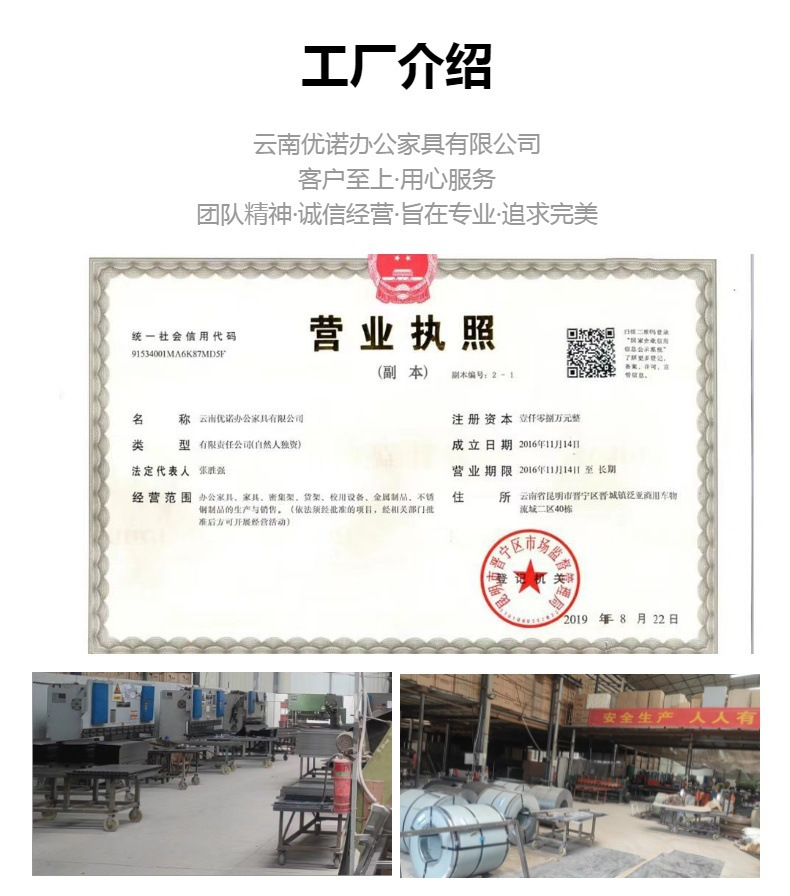 云南优诺办公家具有限公司,是一家集设计开发.产品生产.市场营销为一体的钢制家具龙头企业。我公司始终秉承“诚信求实,创新发展“的企业精神持续深耕于办公家具行业,以匠人精神做好产品与服务,致力于赢得客户与市场的认同。