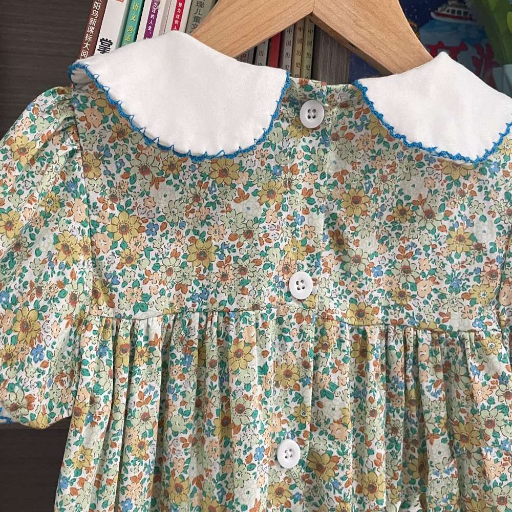 2025 스페인 여자 여름 짧은 소매 원피스 꽃 케이블 인형 칼라 아동복 도매 소녀 치마