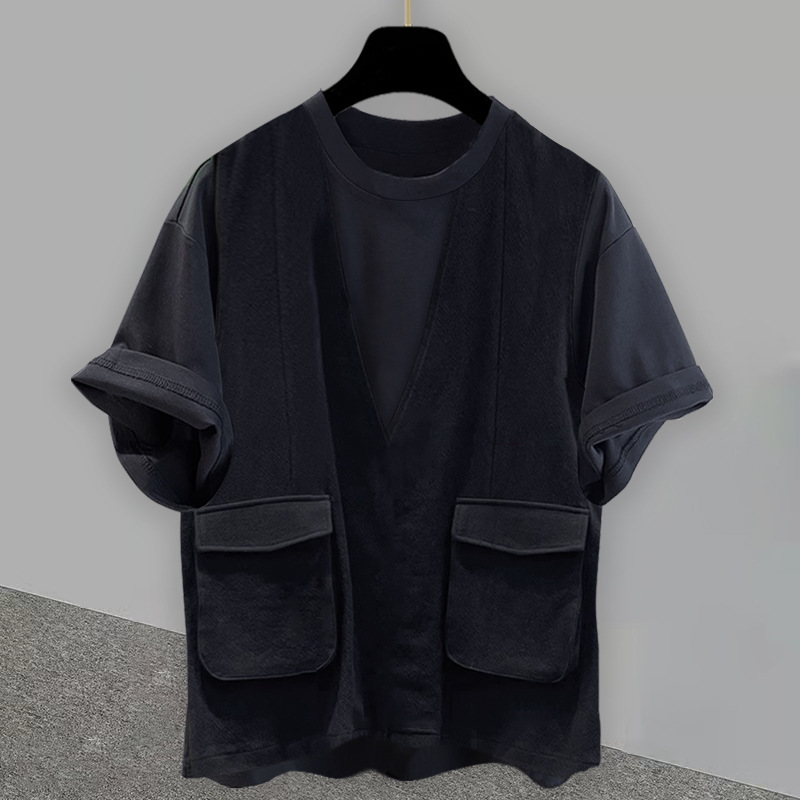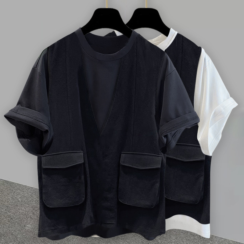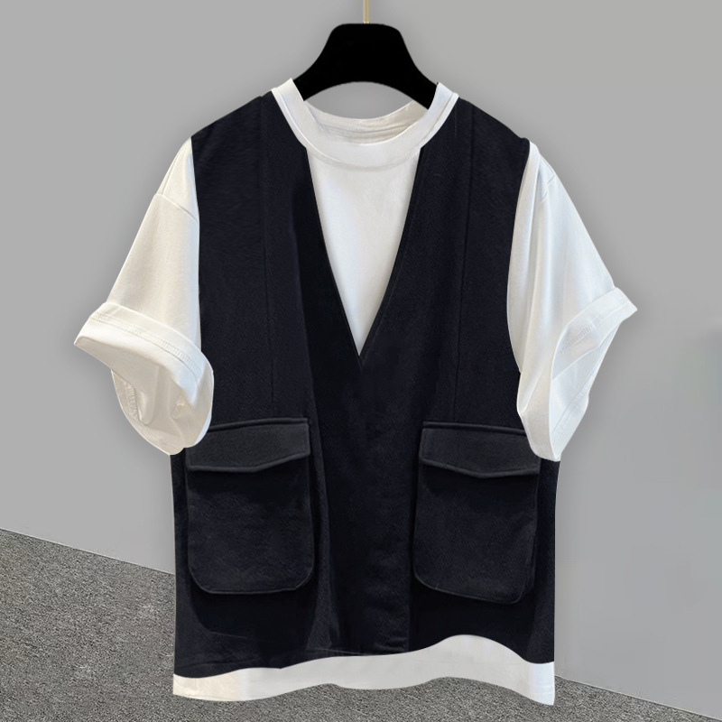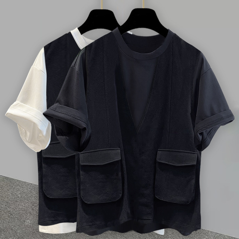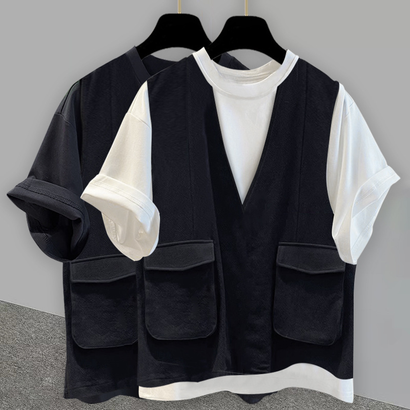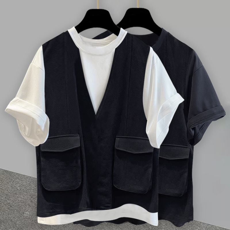 작업복 가짜 2 피스 라운드 넥 반팔 티셔츠 남성과 여성의 느슨한 트렌디 브랜드 패션 하이 엔드 센스 캐주얼 올 매치 여름 탑