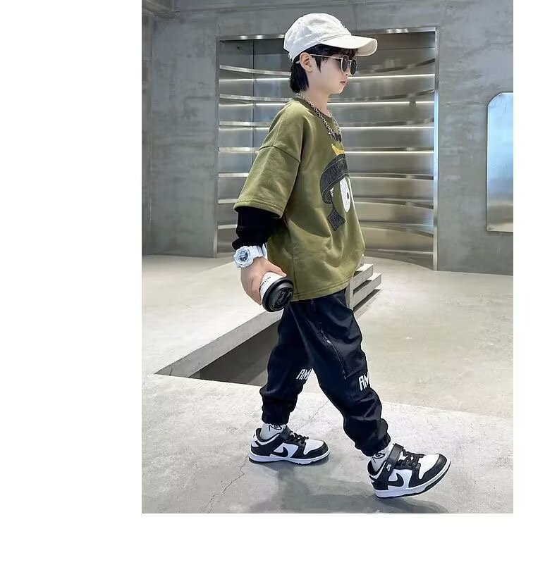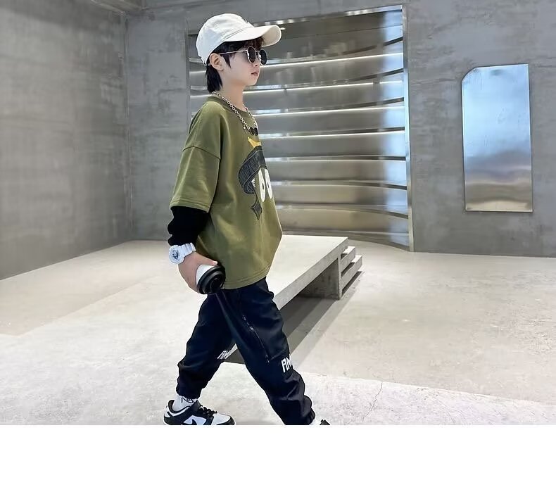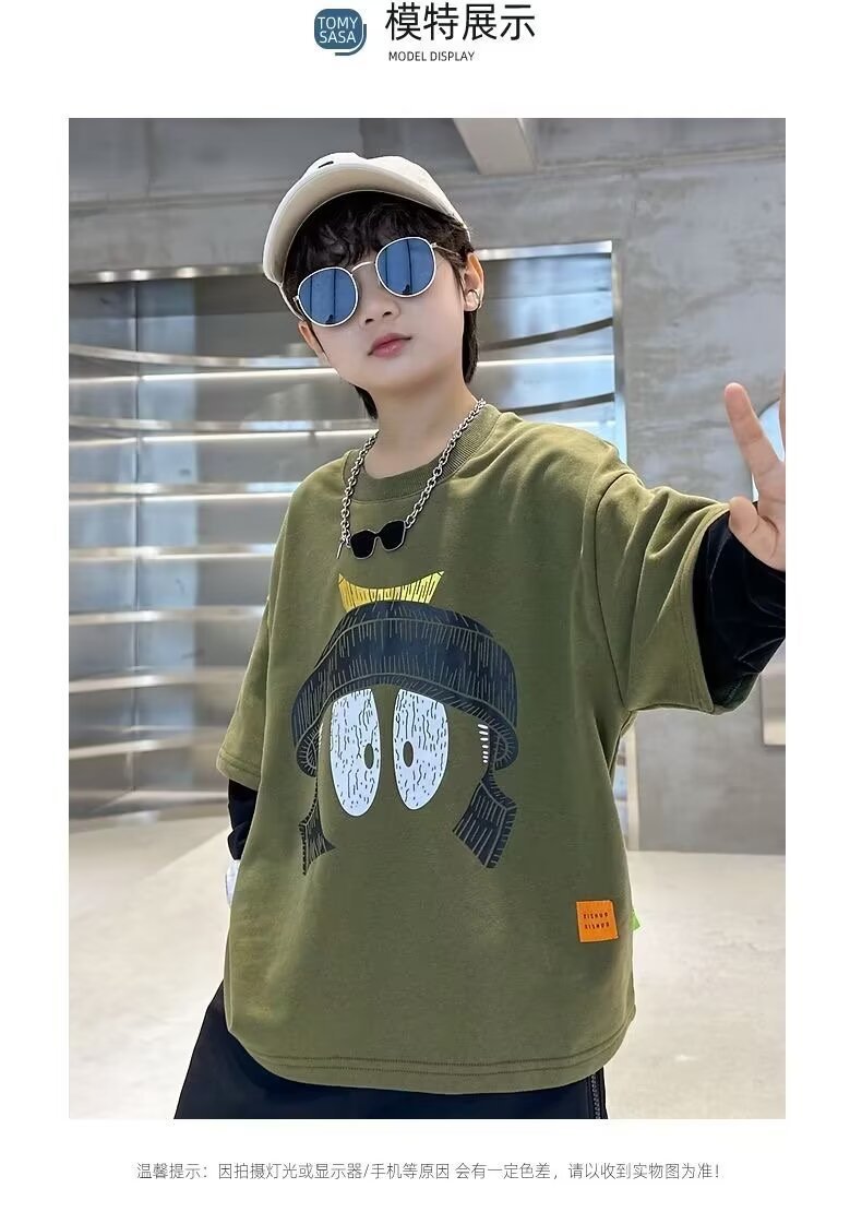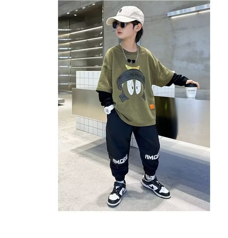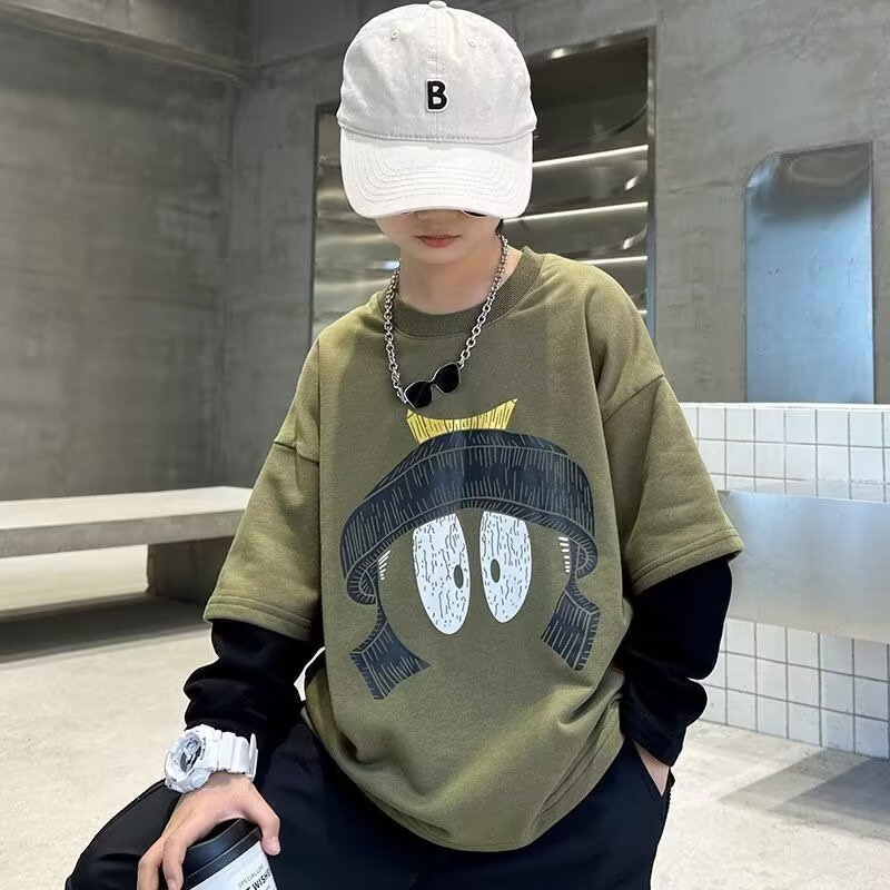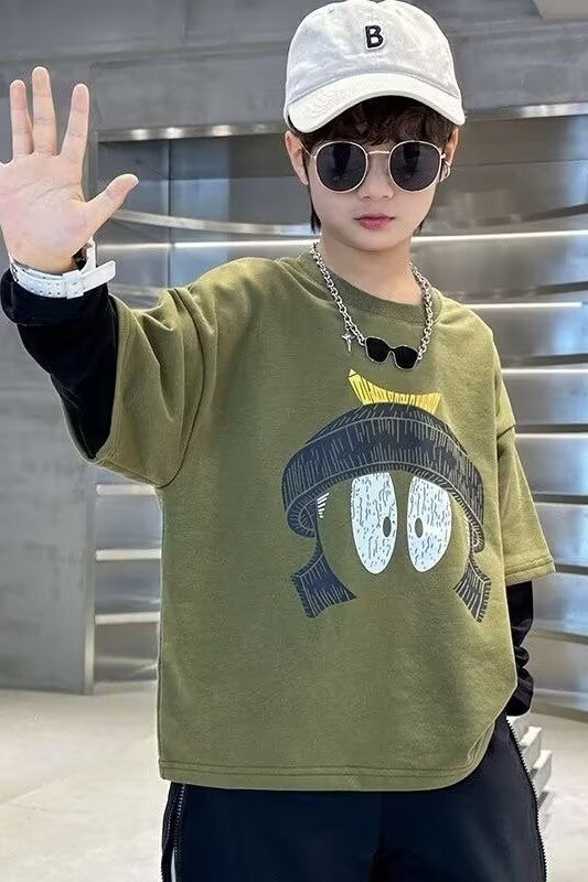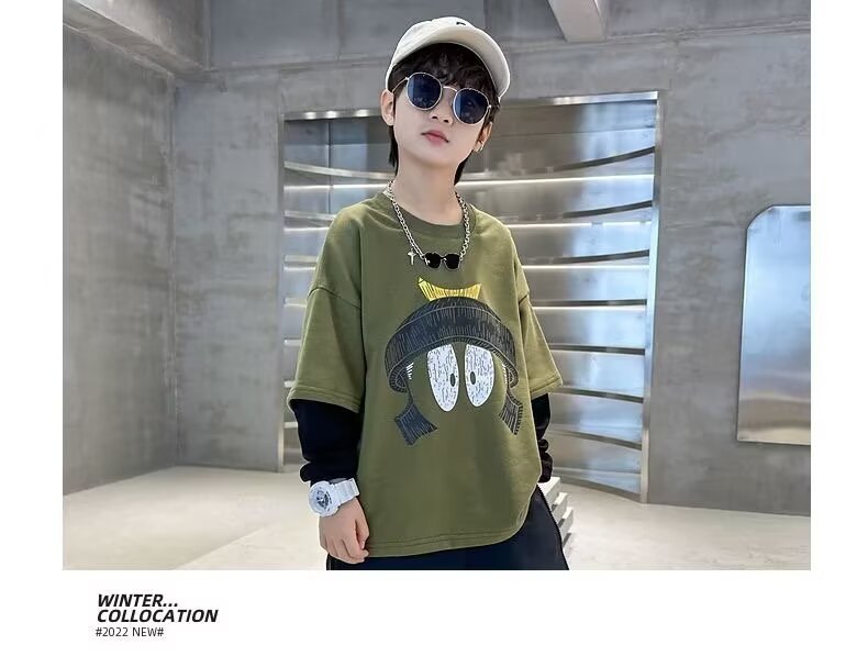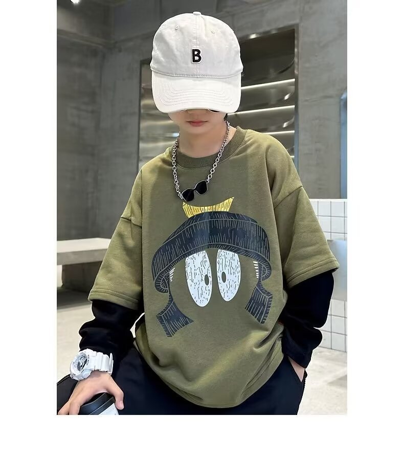 아동복 소년 스웨터 2024 봄 새로운 도착 CUHK 어린이 유행 잘 생긴 가짜 두 조각 인쇄 둥근 목베이스 셔츠스토어 가기