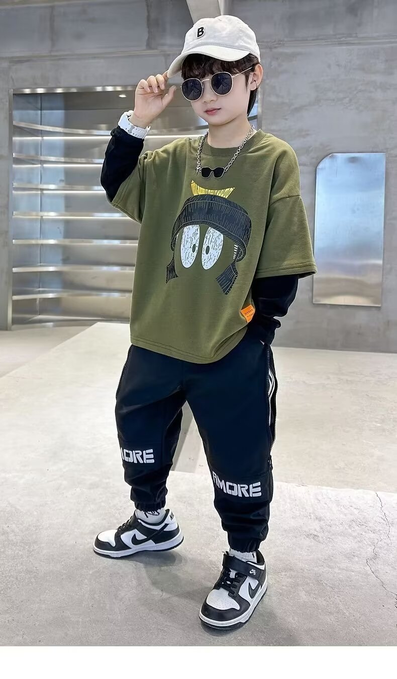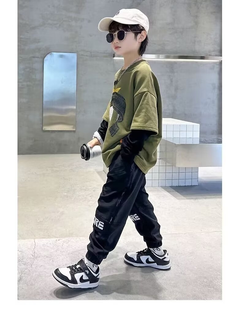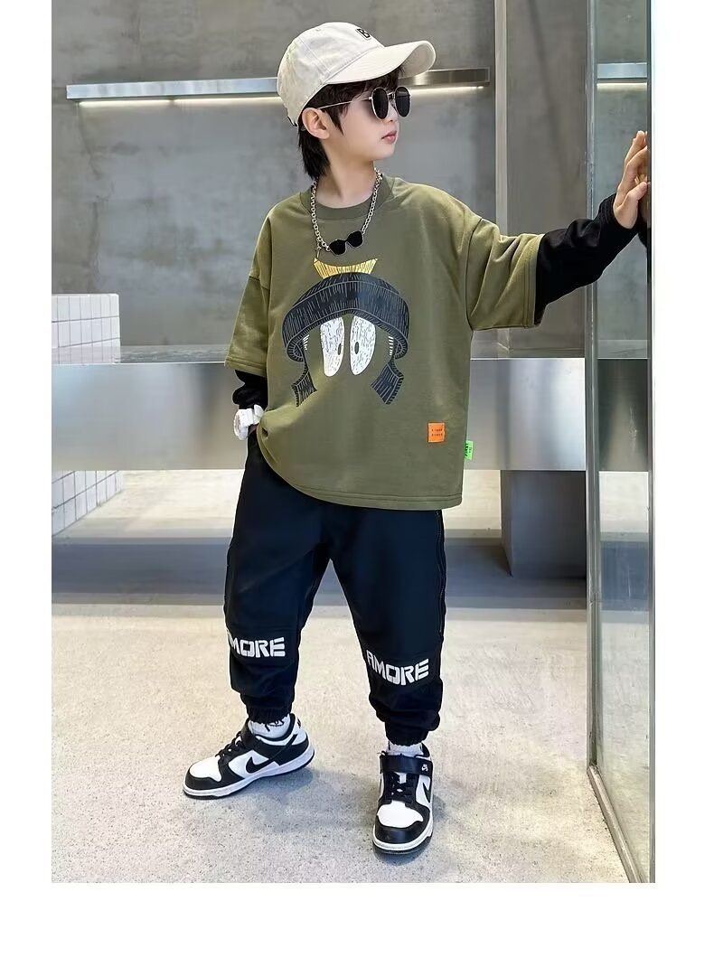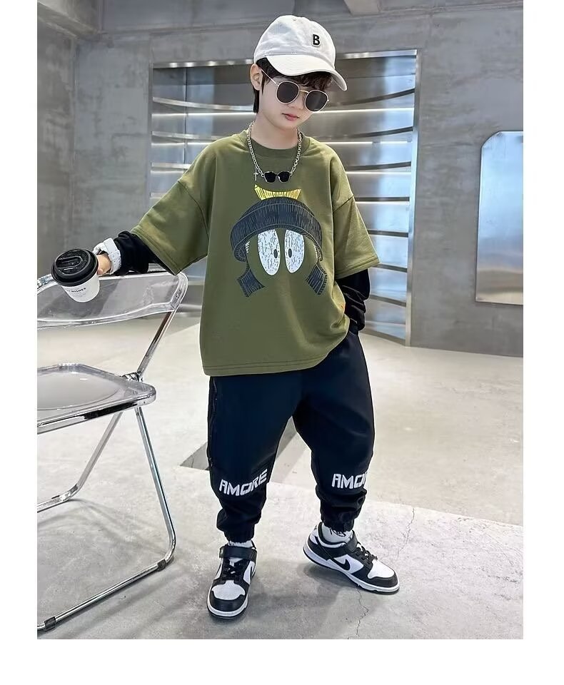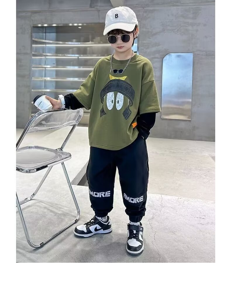 아동복 소년 스웨터 2024 봄 새로운 도착 CUHK 어린이 유행 잘 생긴 가짜 두 조각 인쇄 둥근 목베이스 셔츠스토어 가기