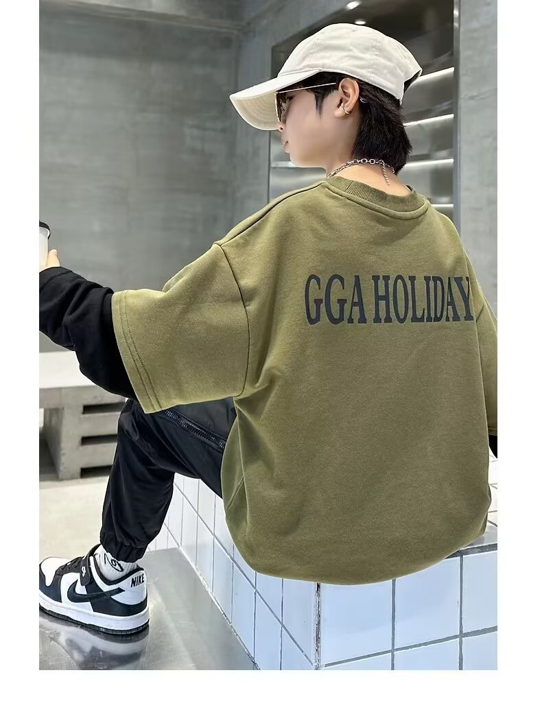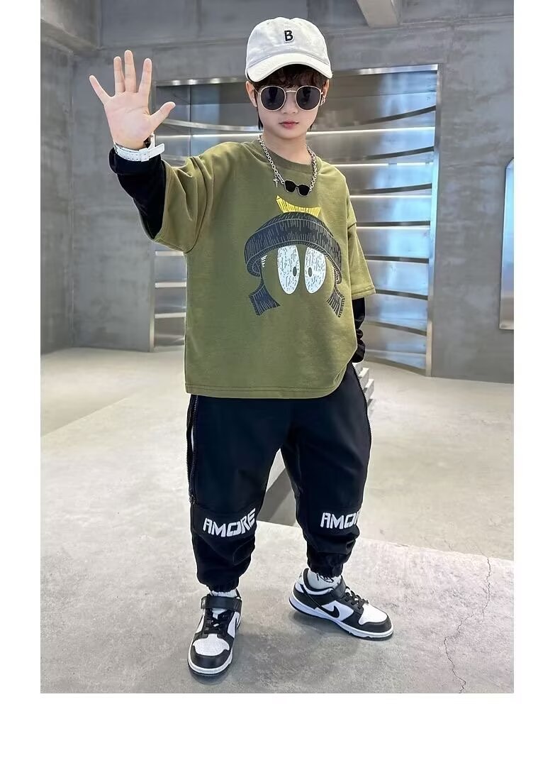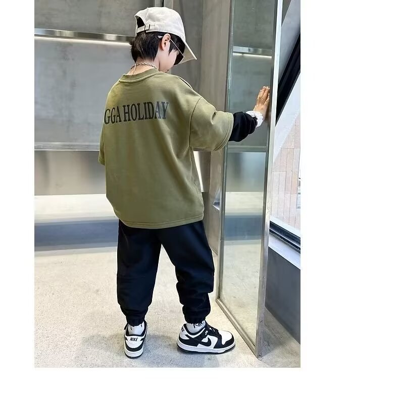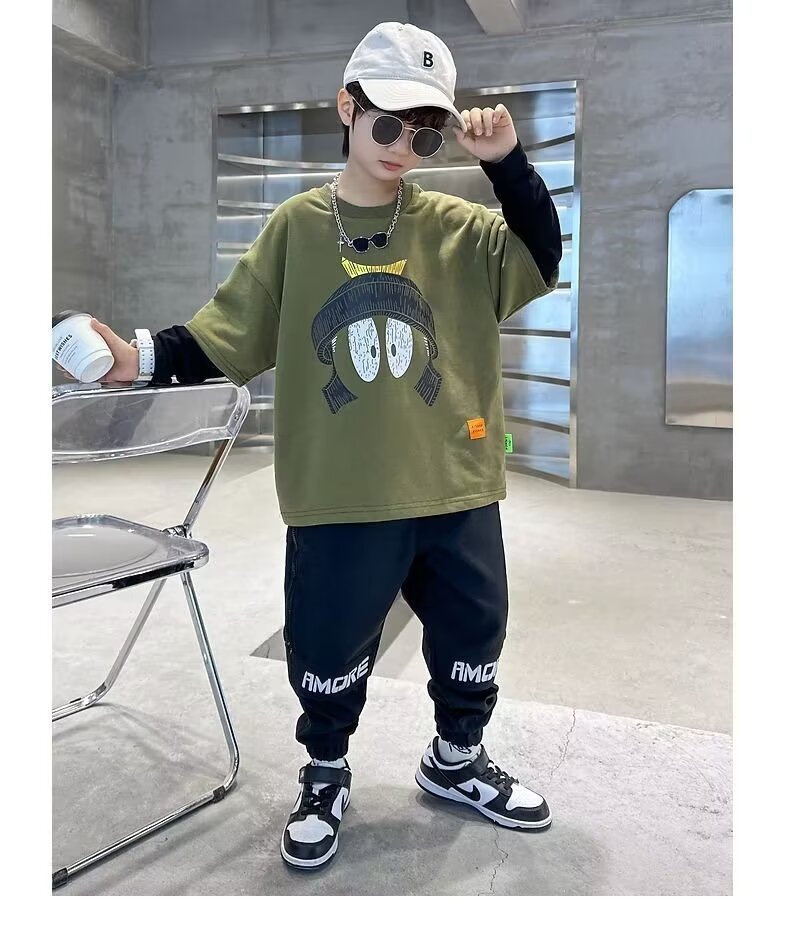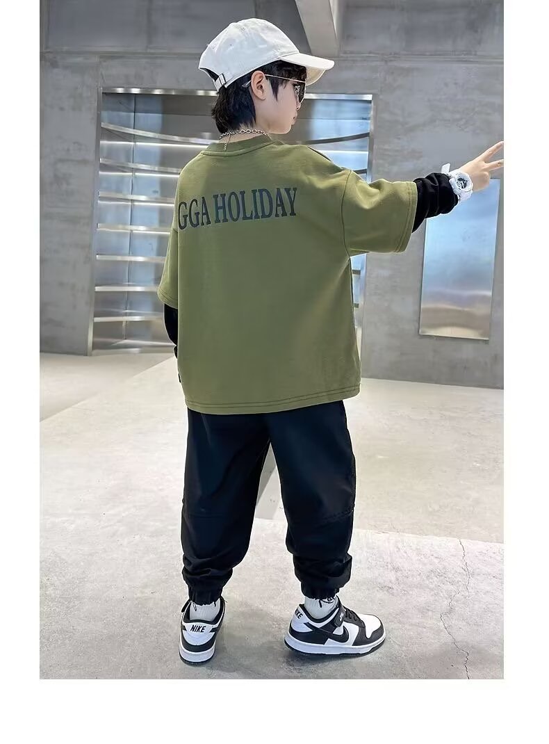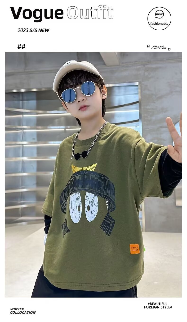 아동복 소년 스웨터 2024 봄 새로운 도착 CUHK 어린이 유행 잘 생긴 가짜 두 조각 인쇄 둥근 목베이스 셔츠스토어 가기