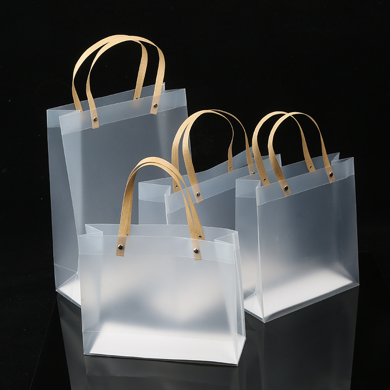 재고 도매 젖빛 플라스틱 휴대용 의류 가방 pp 투명 핸드백 휴대용 선물 웨딩 사탕 포장 가방스토어 가기