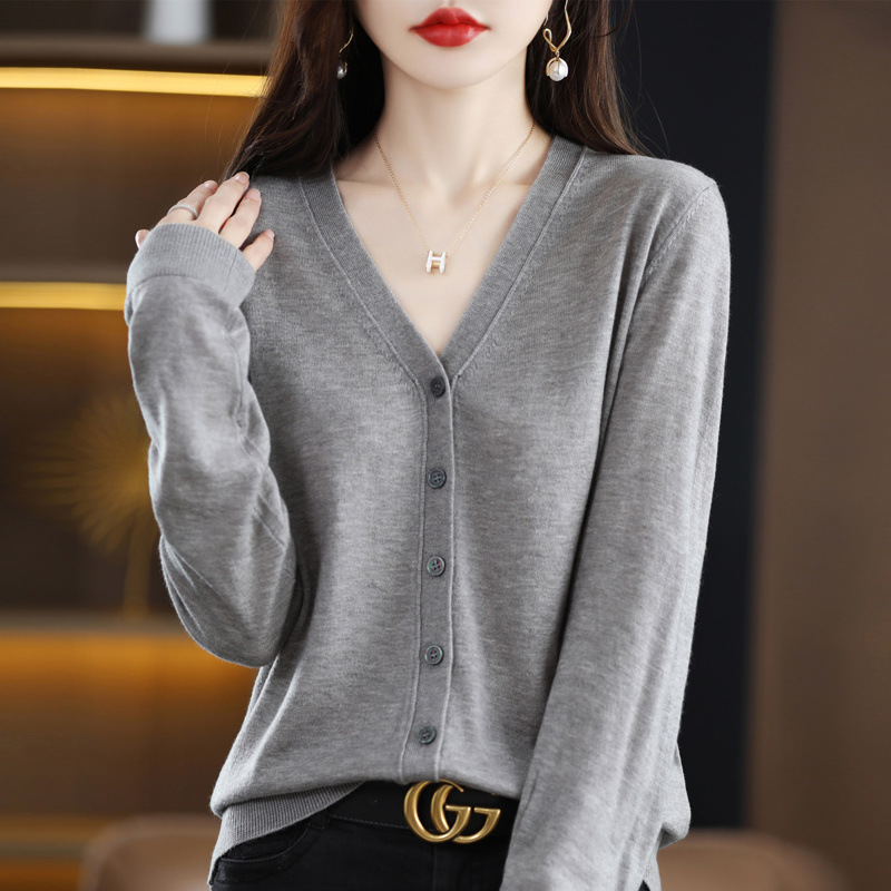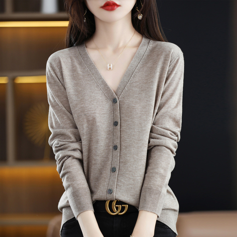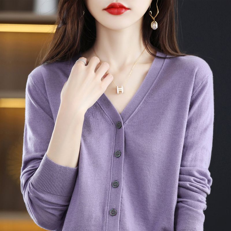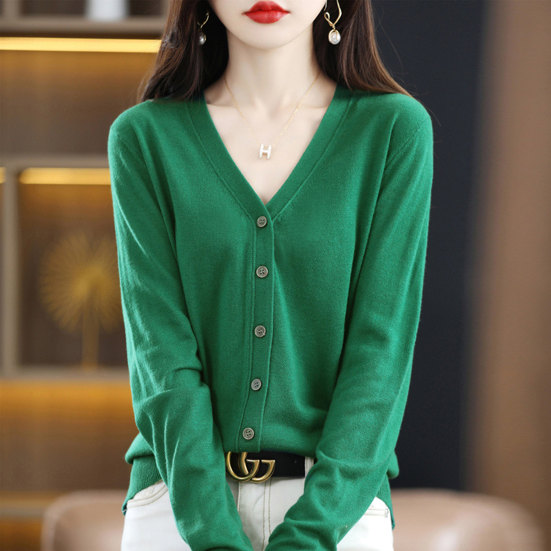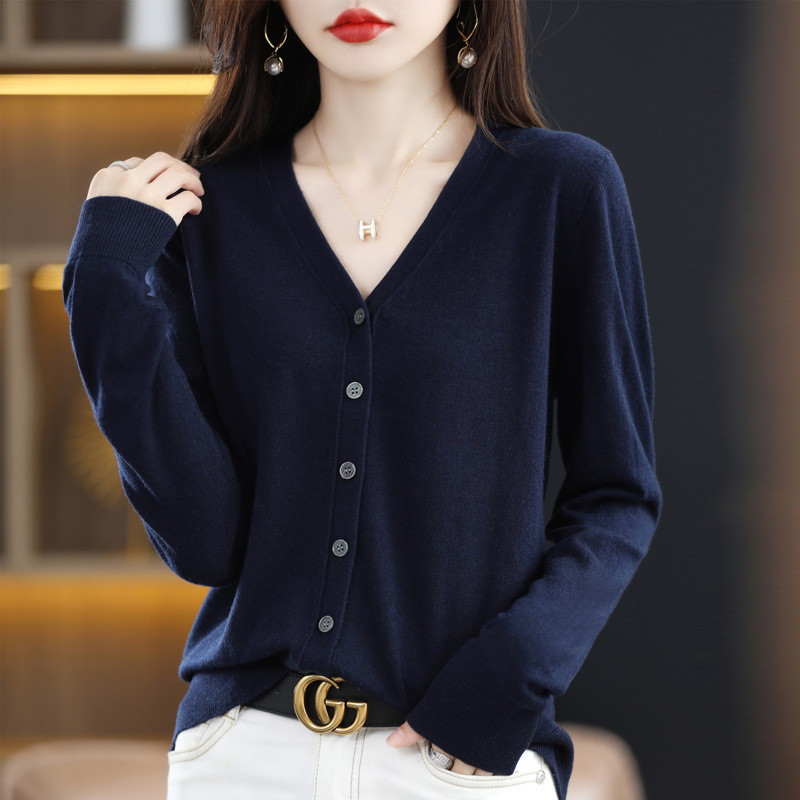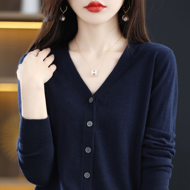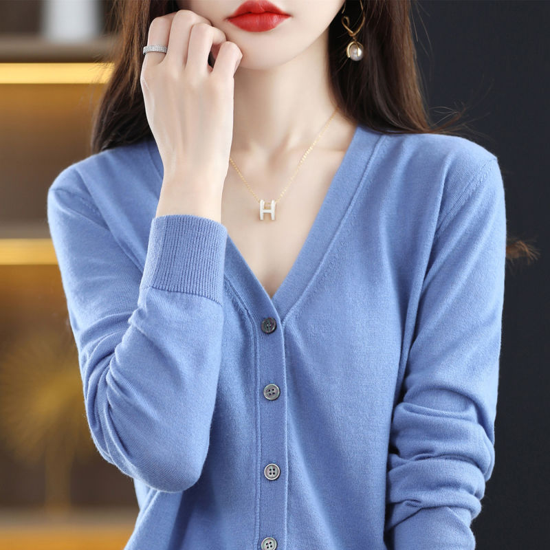 티베트 푸른 봄과 가을 양모 카디건 얇은 여성 프랑스 고급 칼라 느슨한 니트웨어 긴 소매 코트 탑