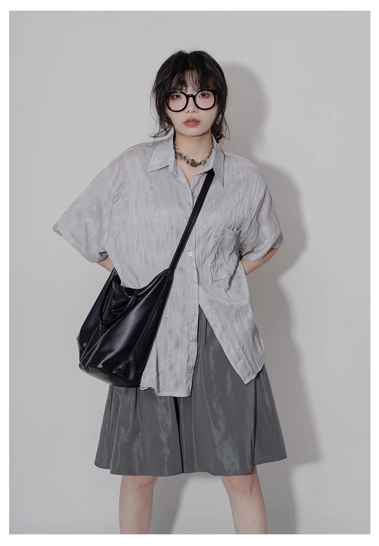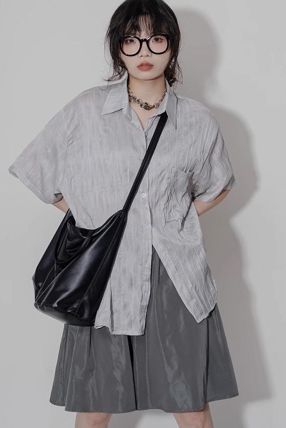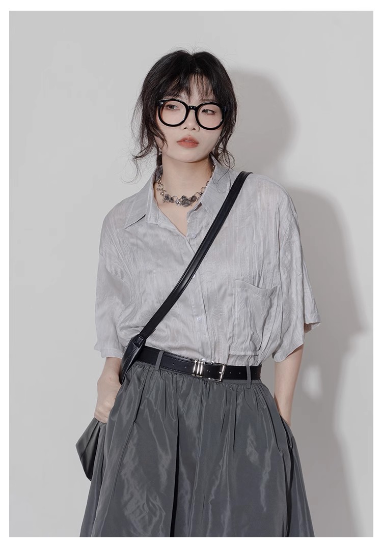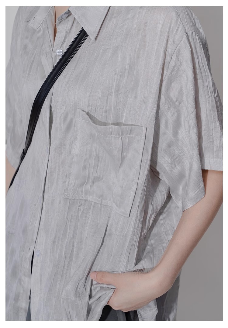 디자인 주름 반팔 셔츠 여성용 여름 질감 틈새 올매치 캐주얼 비대칭 세련된 셔츠
