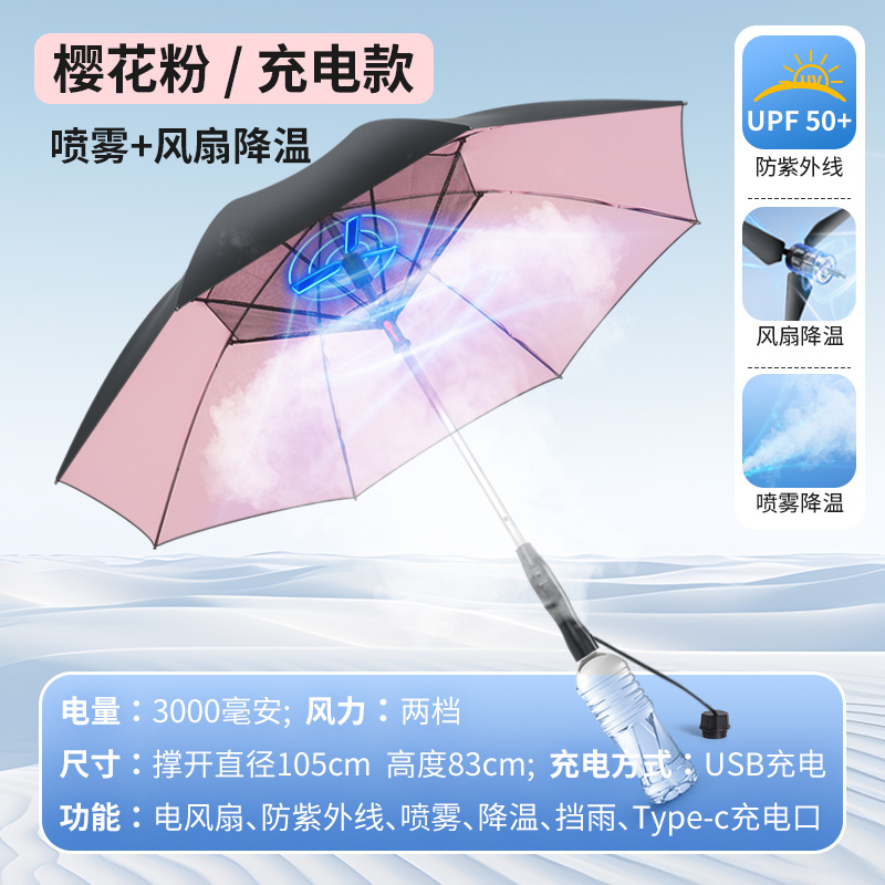 第一种:三折风扇伞,它只有风扇,没有喷雾。轻巧便携,折叠起来不占空间,是您日常出行的清爽伴侣。