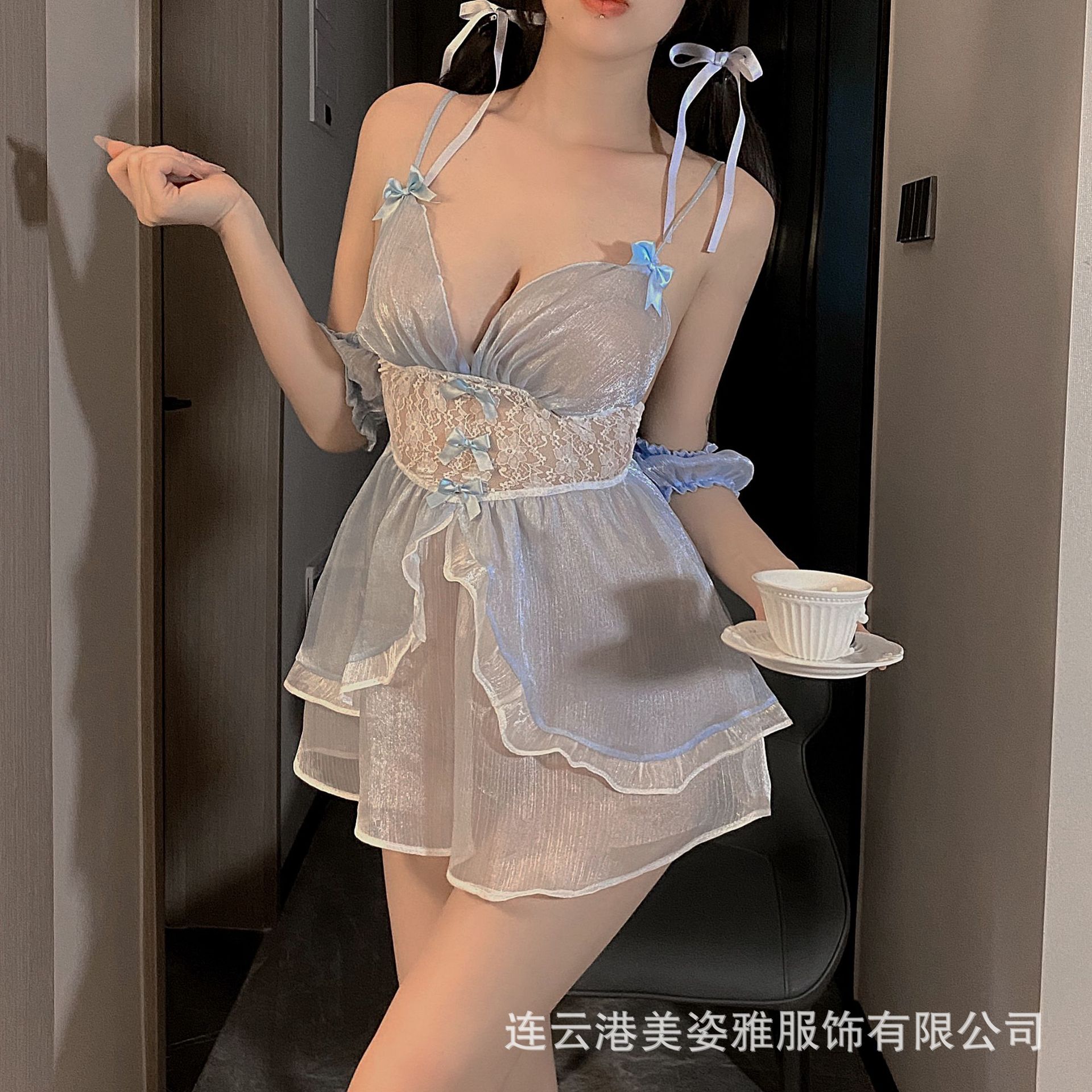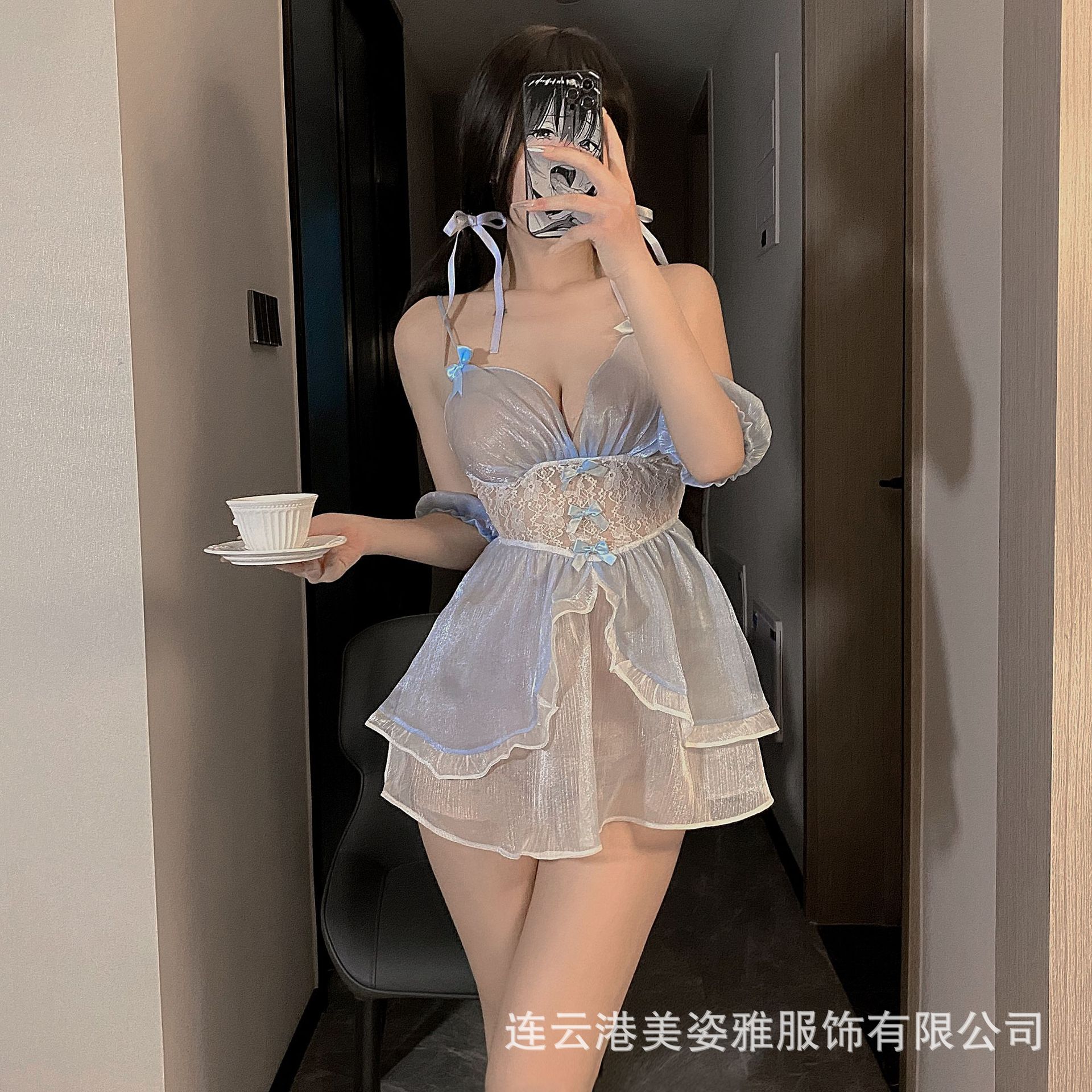 섹시한 깊은 V 슬링 짧은 치마 귀여운 스타일 진주 빛 부드러운 원사 달콤한 마이크로 투명 공주 스타일 잠옷 섹스 순수 스타일 여성스토어 가기