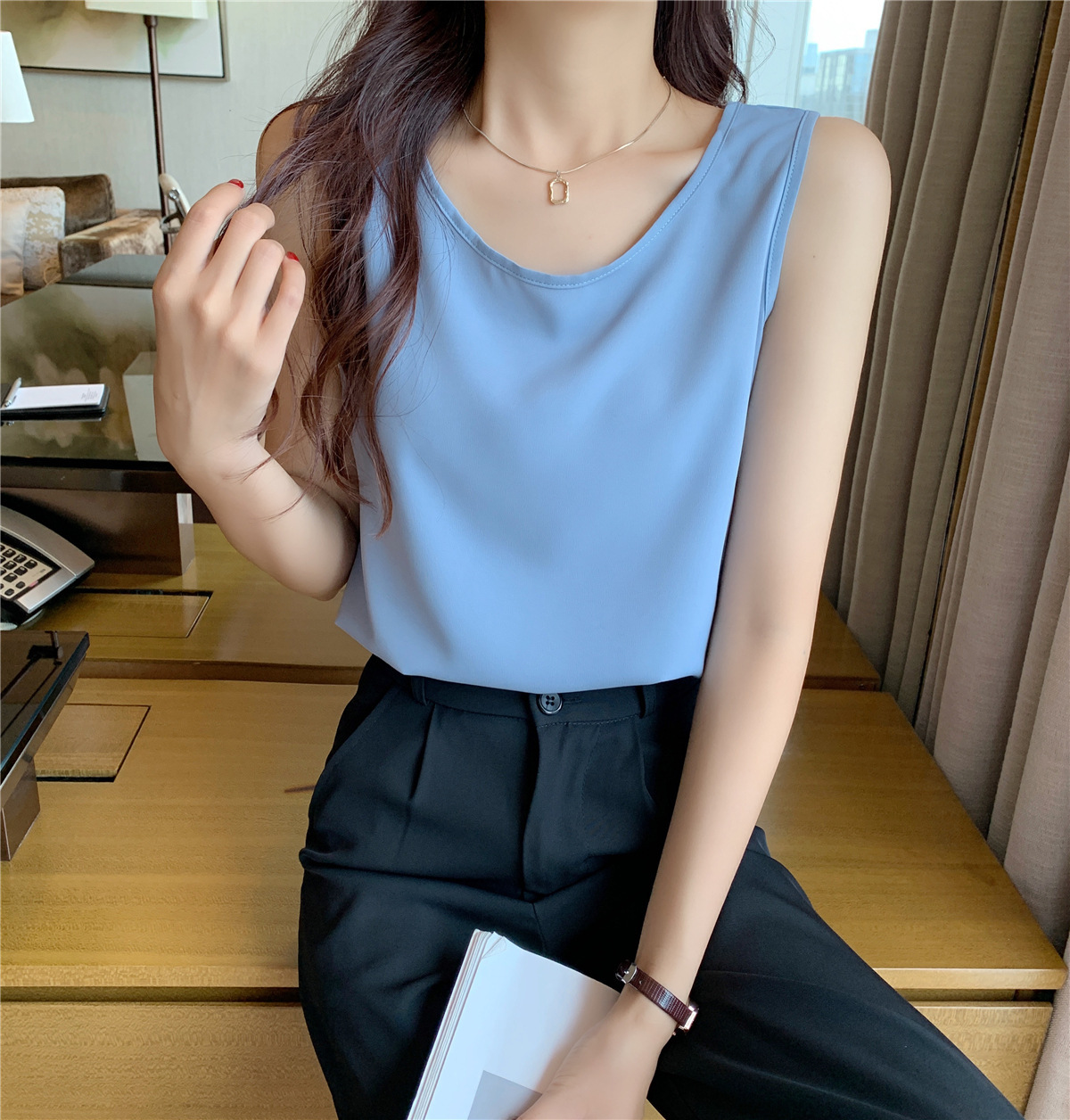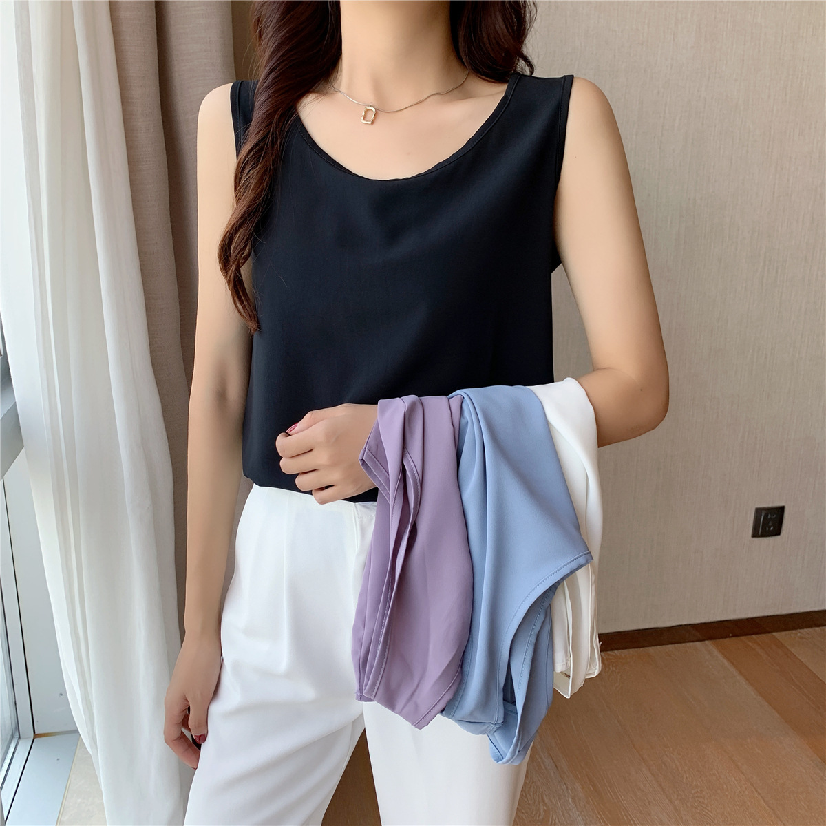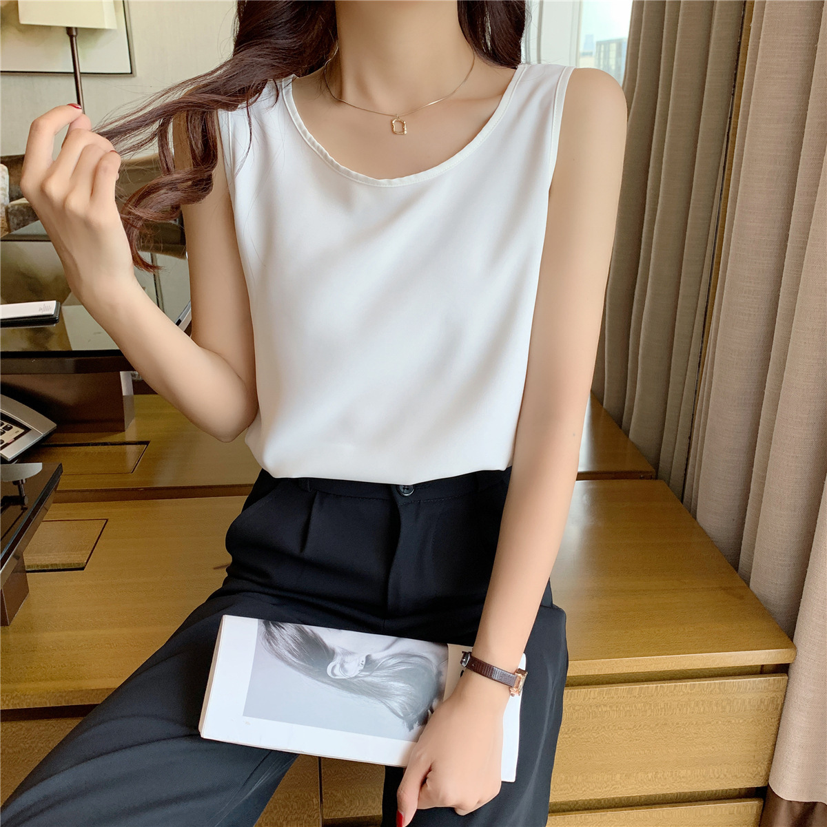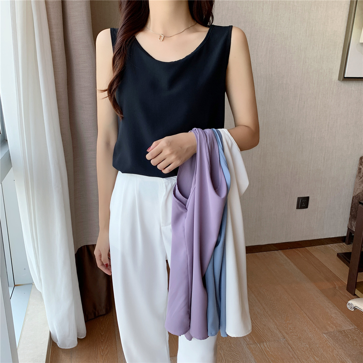 리얼 샷 2024 시폰 카미 솔 여성용 루즈 크루 넥 아우터베이스 셔츠 작은 세트 내부 민소매 탑스토어 가기
