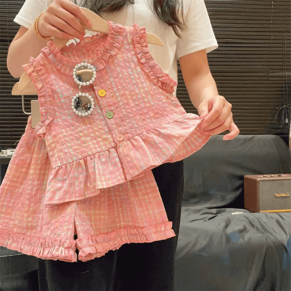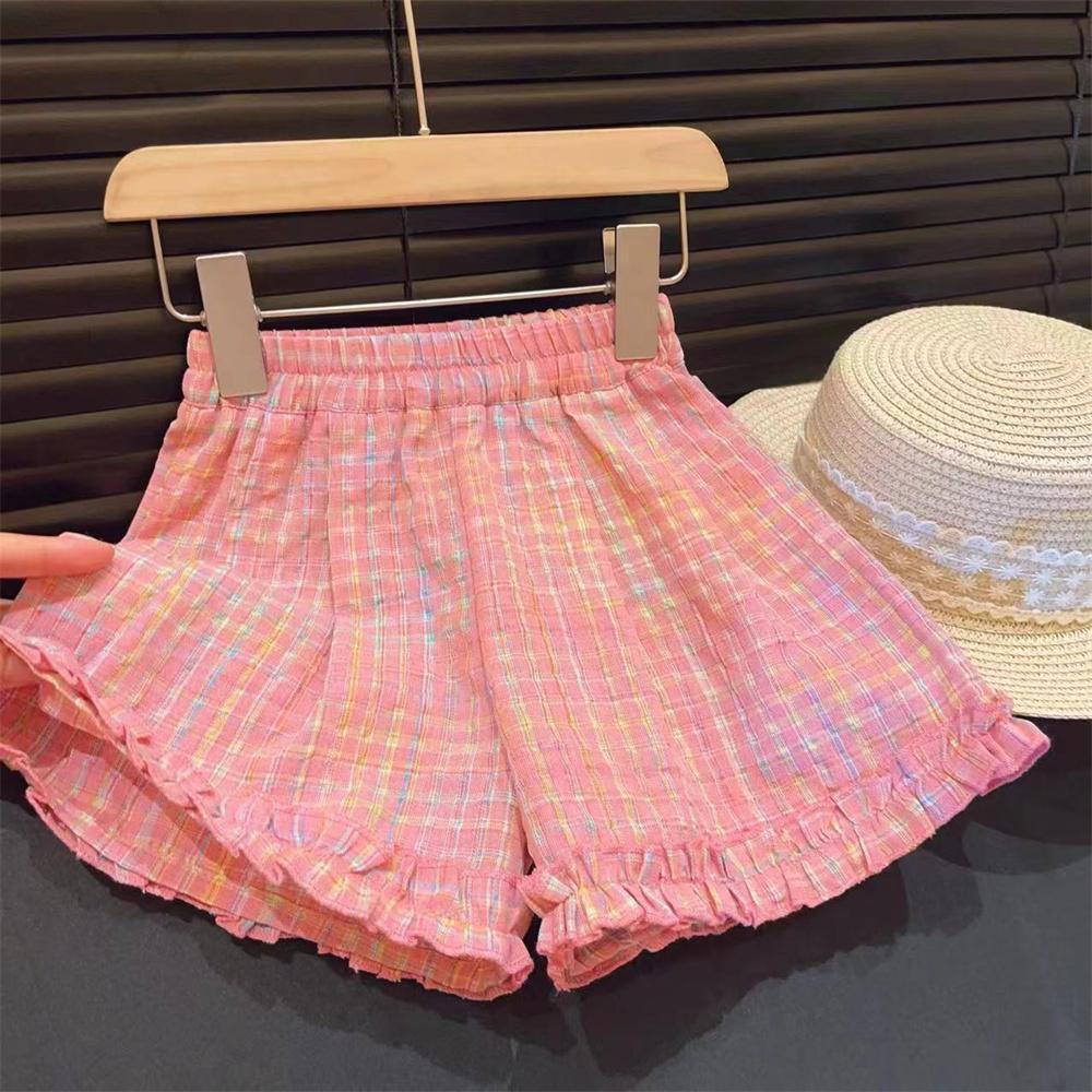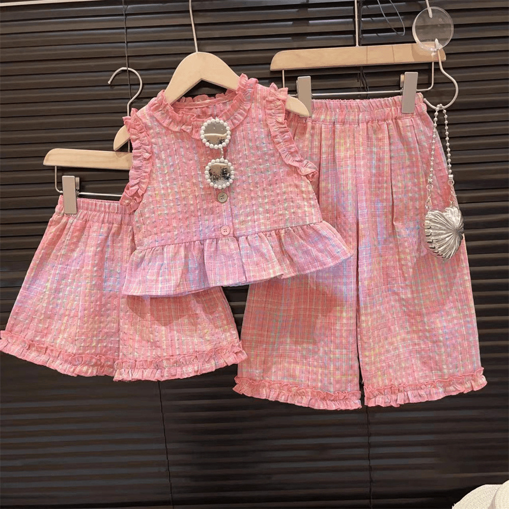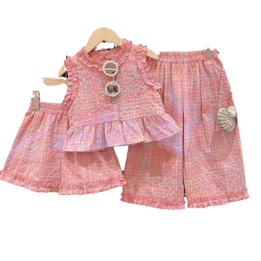 소녀 여름 레이스 대비 격자 무늬 조끼 넓은 다리 바지 서양식 투피스 여름 투피스 55297스토어 가기