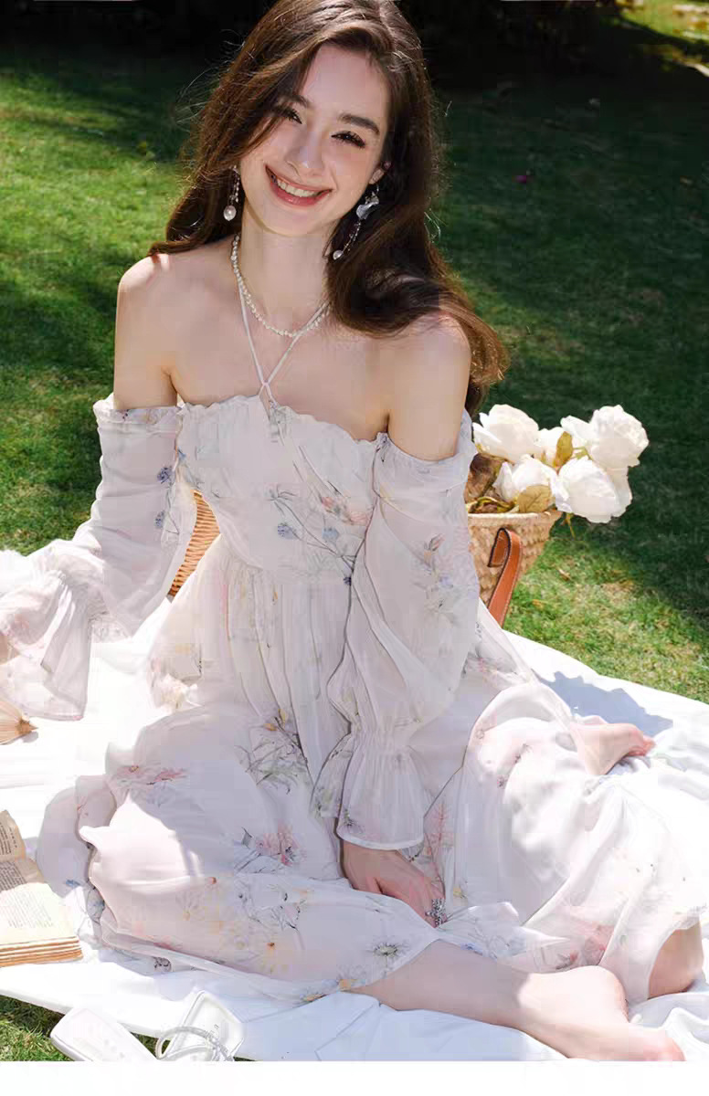 프렌치 티 브레이크 드레스 2024 봄과 여름 새로운 랜턴 슬리브 기질 요정 롱 스커트 허리 꽃 드레스 여성