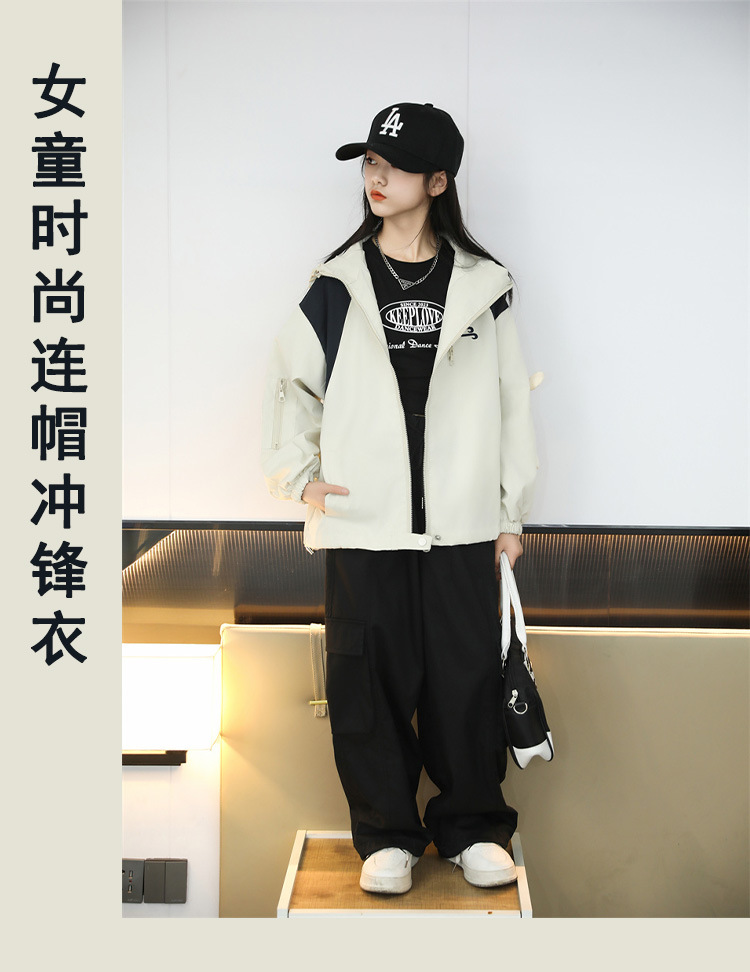 소녀 2024 봄과 가을 어린이 코트 얇은 후드 방수 느슨한 충전 의류 큰 어린이를위한 유행스토어 가기