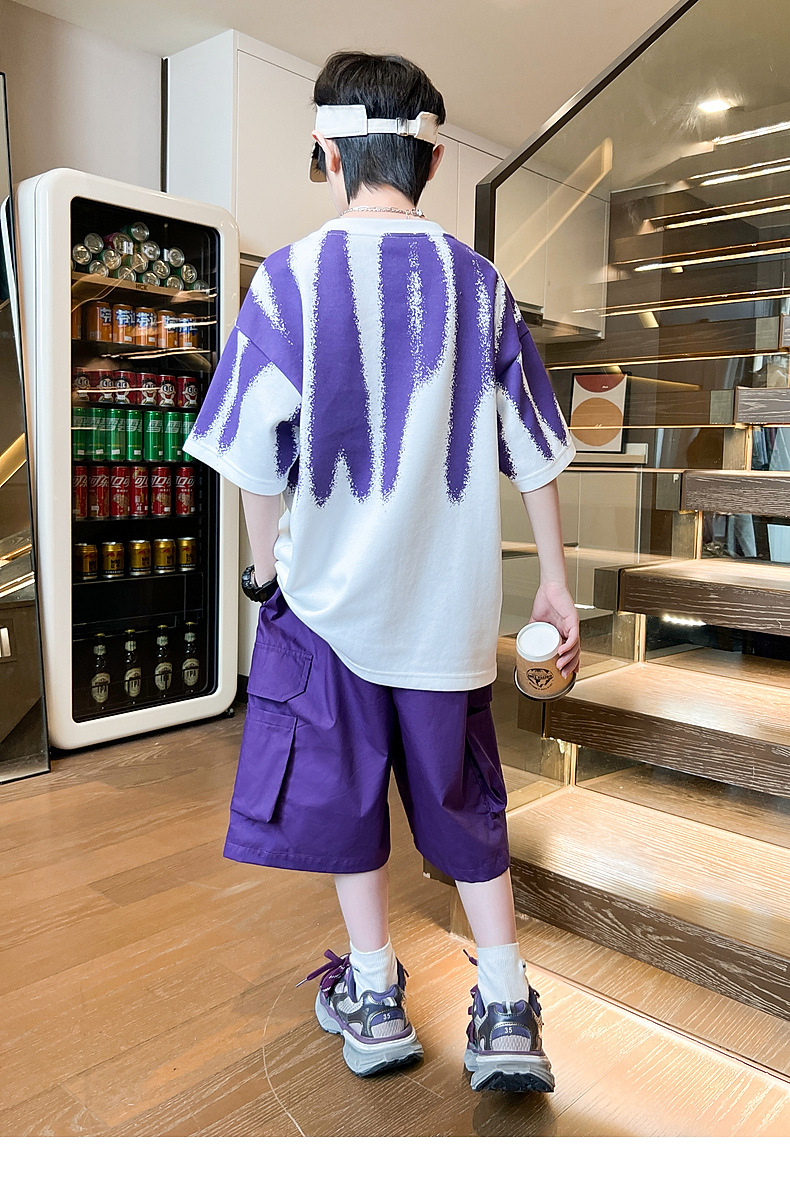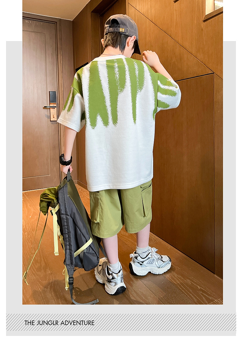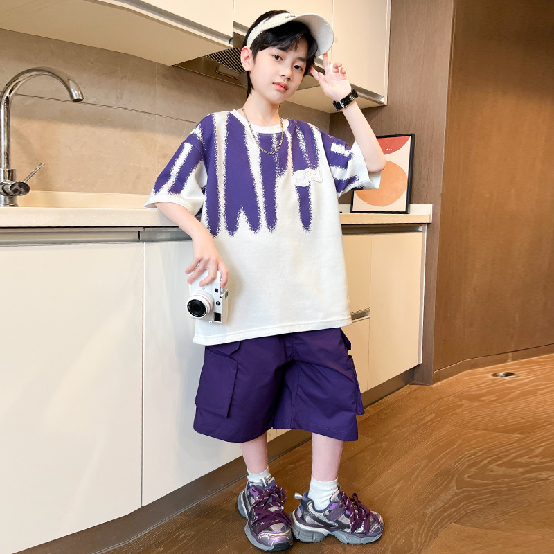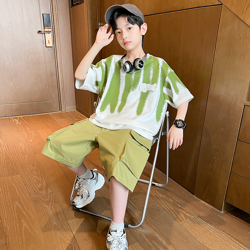 아동복 소년의 여름 착용 세트 2024 새로운 반팔 큰 소년의 얇은 더피 핸섬 스포츠 투피스 세트