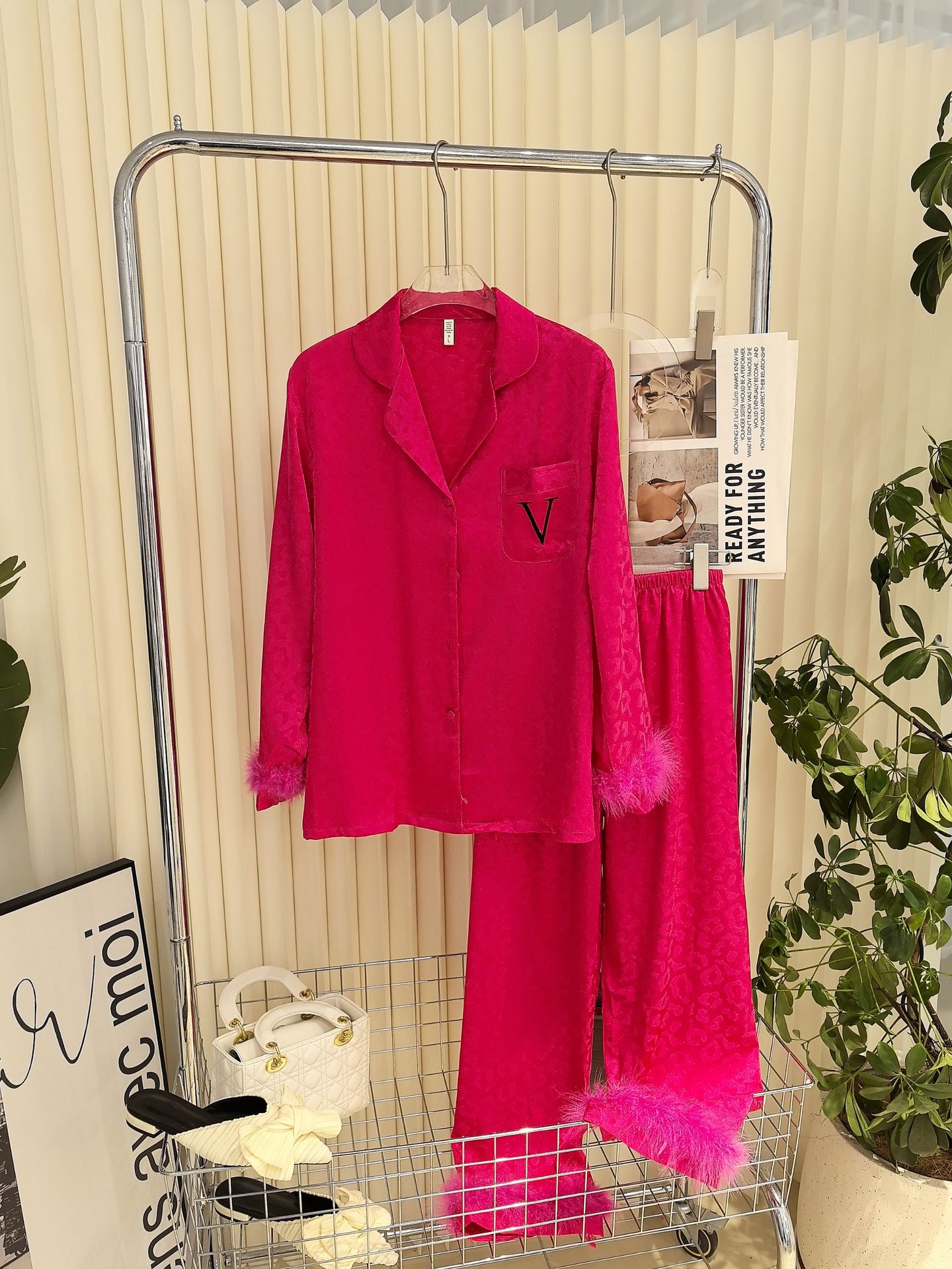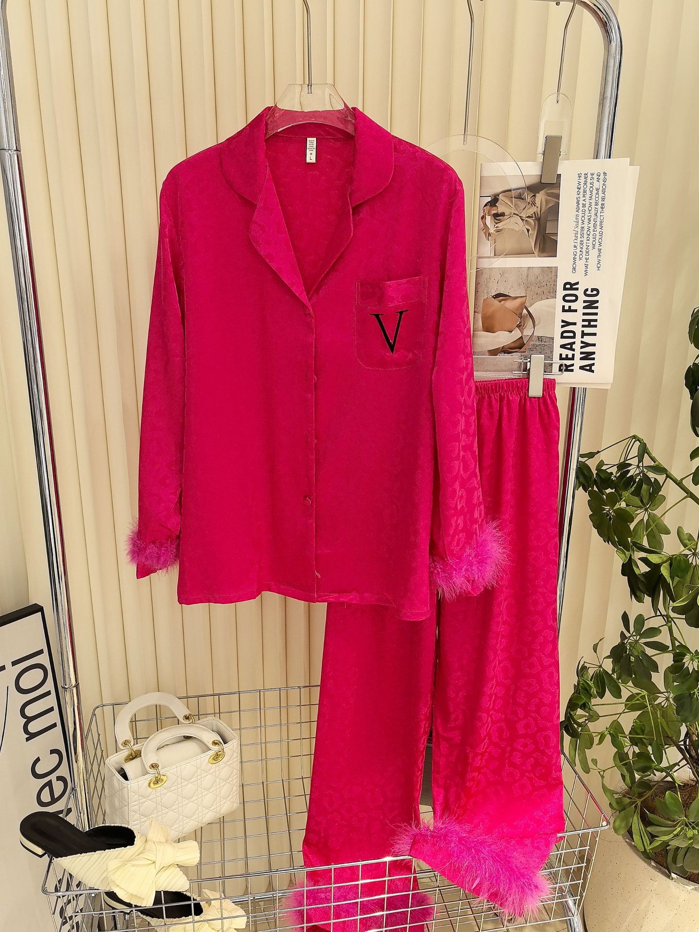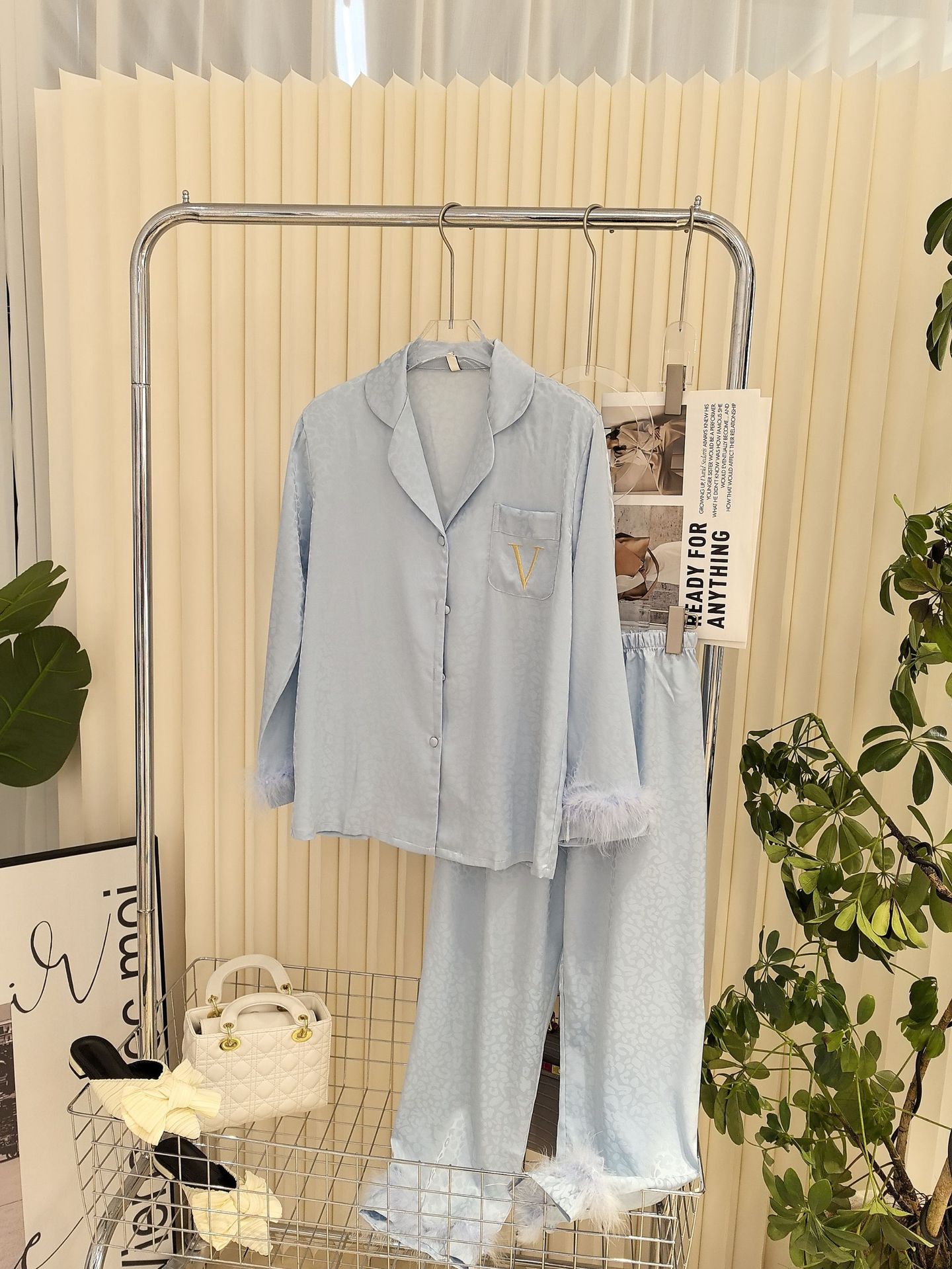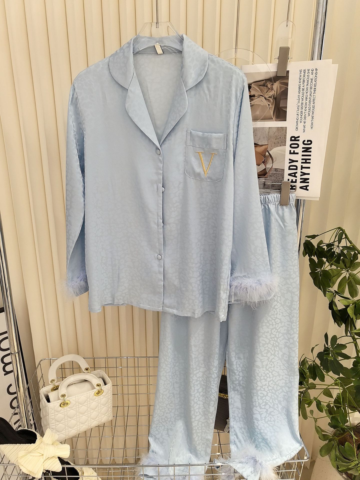 아이스 실크 잠옷 여성의 봄과 여름 플러스 사이즈 얇은 느슨한 표범 깃털 긴 소매 바지 달콤한 세트 입을 수 있습니다