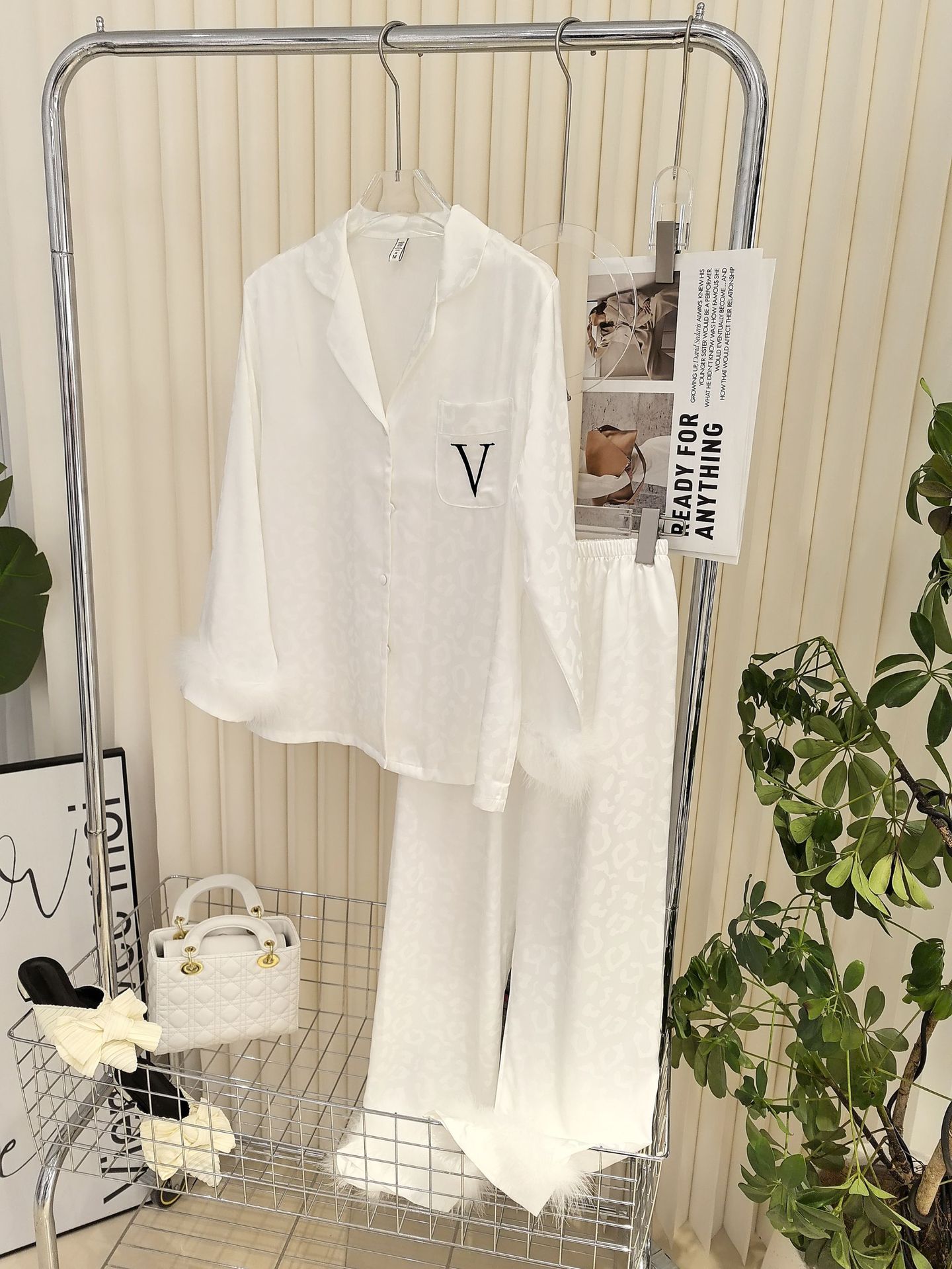 아이스 실크 잠옷 여성의 봄과 여름 플러스 사이즈 얇은 느슨한 표범 깃털 긴 소매 바지 달콤한 세트 입을 수 있습니다스토어 가기