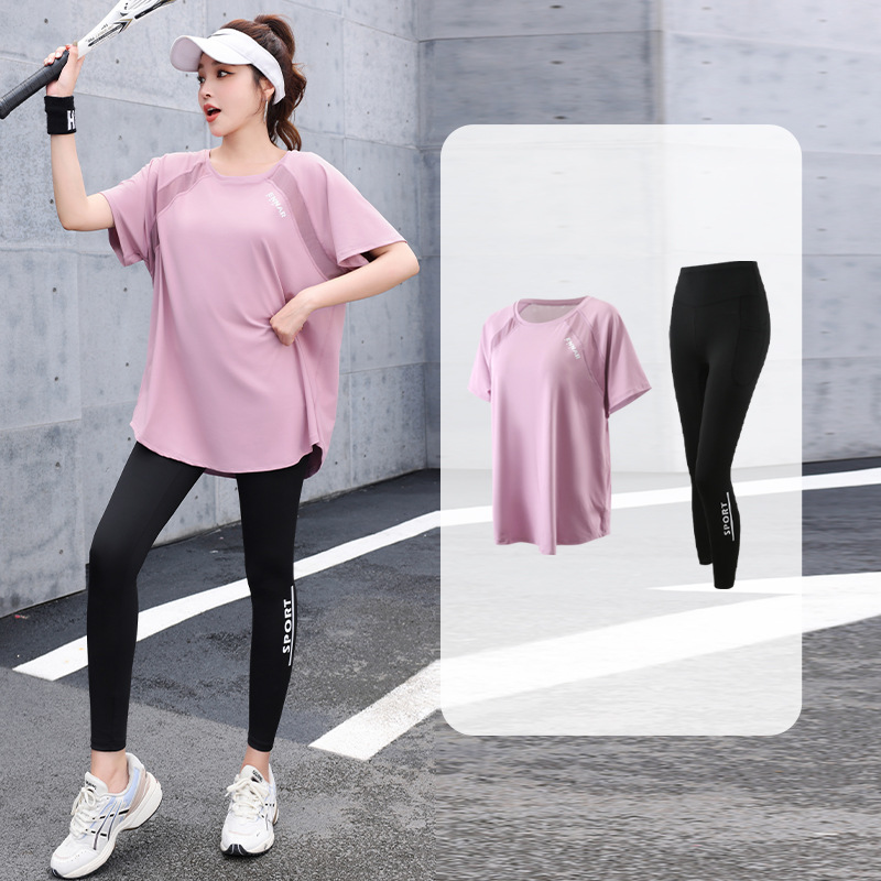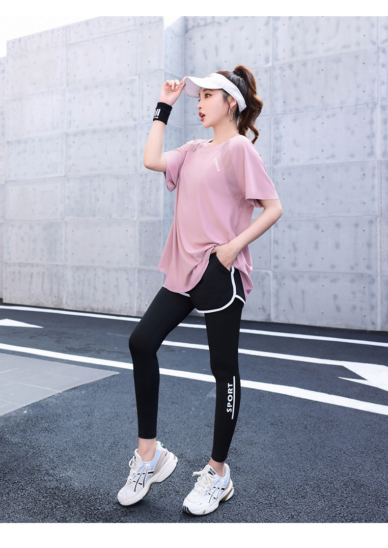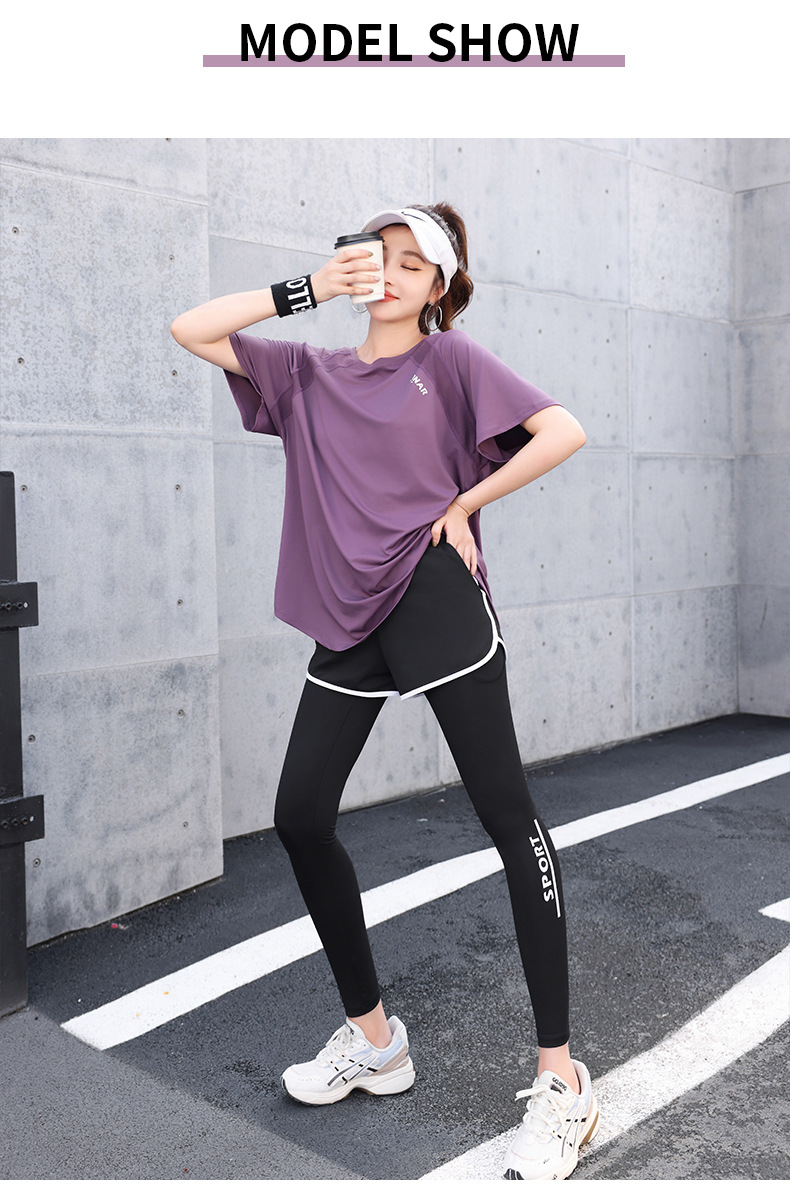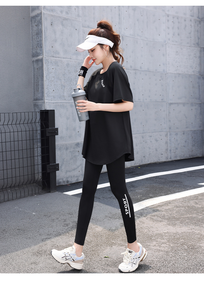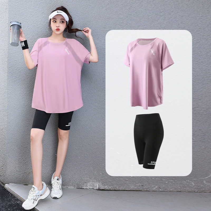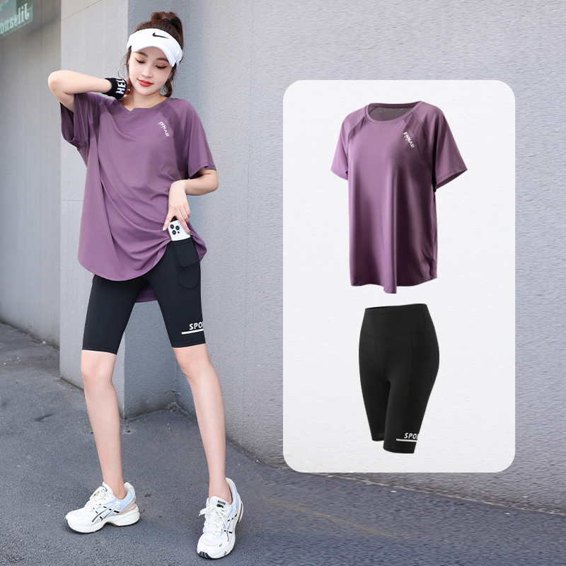 여름 새로운 반팔 티셔츠 느슨한 통기성 배꼽 커버 엉덩이 슬리밍 긴 반바지 스포츠 세트 피트니스 옷