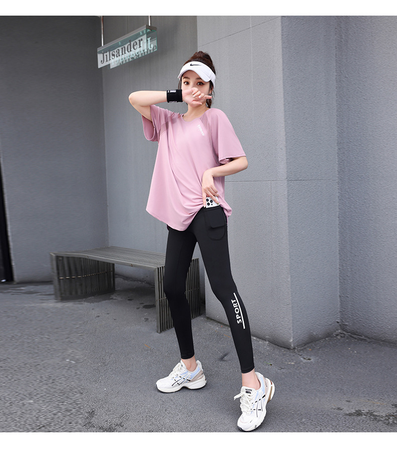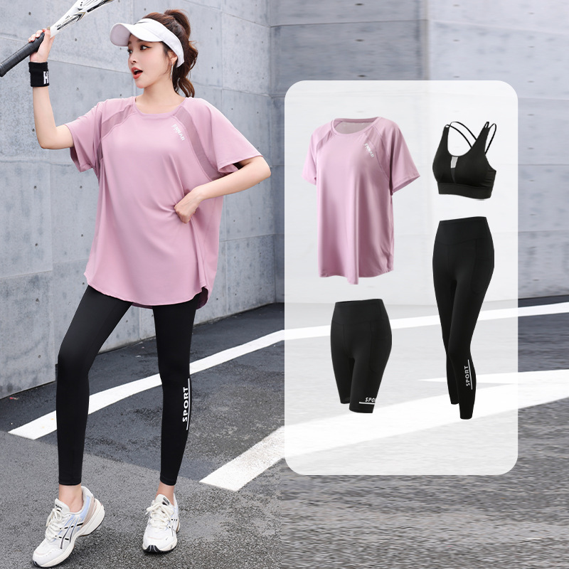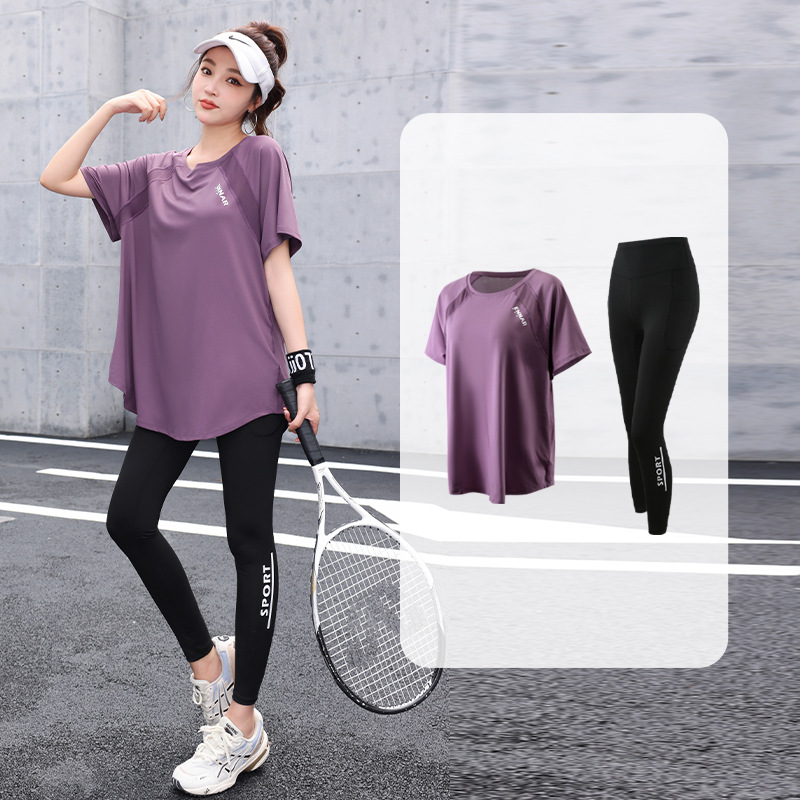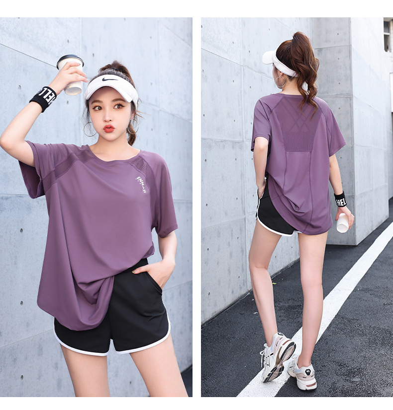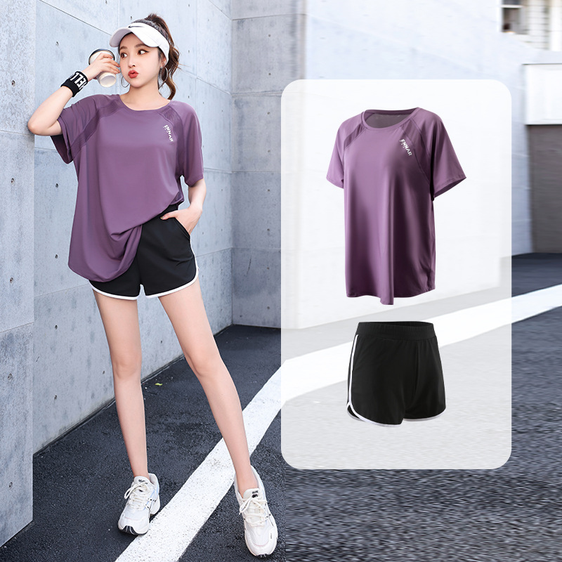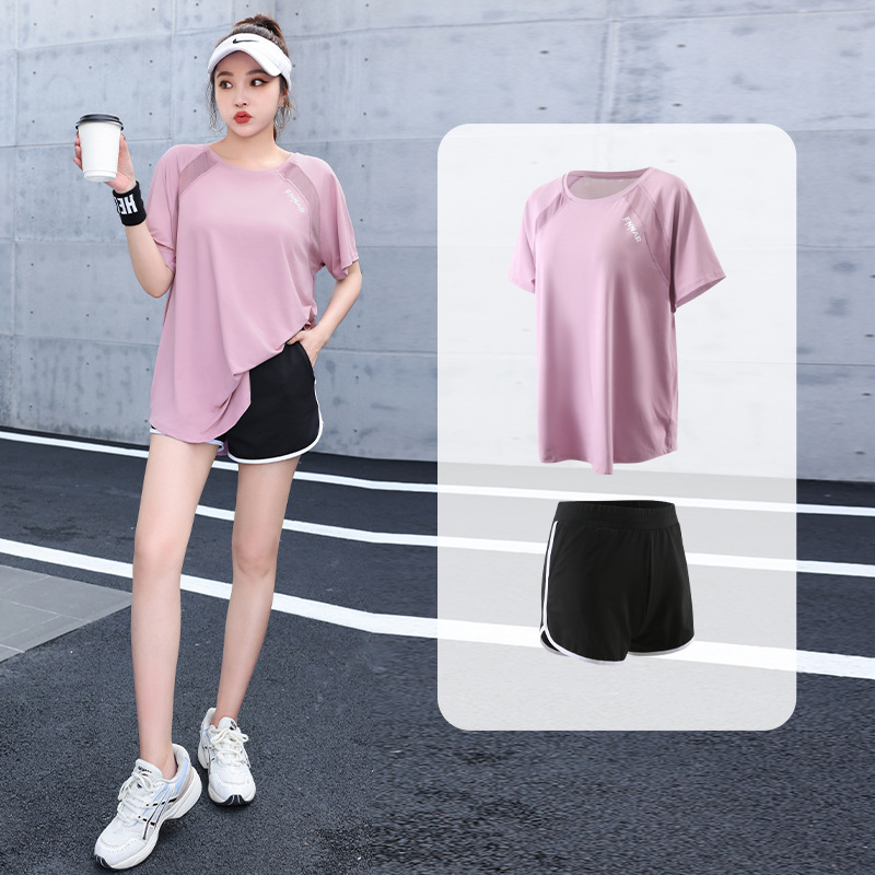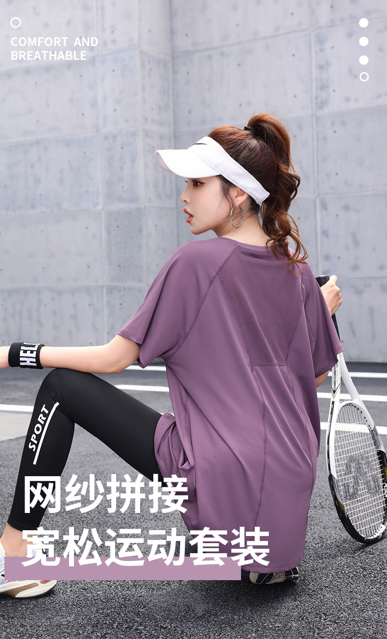 여름 새로운 반팔 티셔츠 느슨한 통기성 배꼽 커버 엉덩이 슬리밍 긴 반바지 스포츠 세트 피트니스 옷