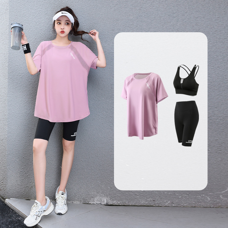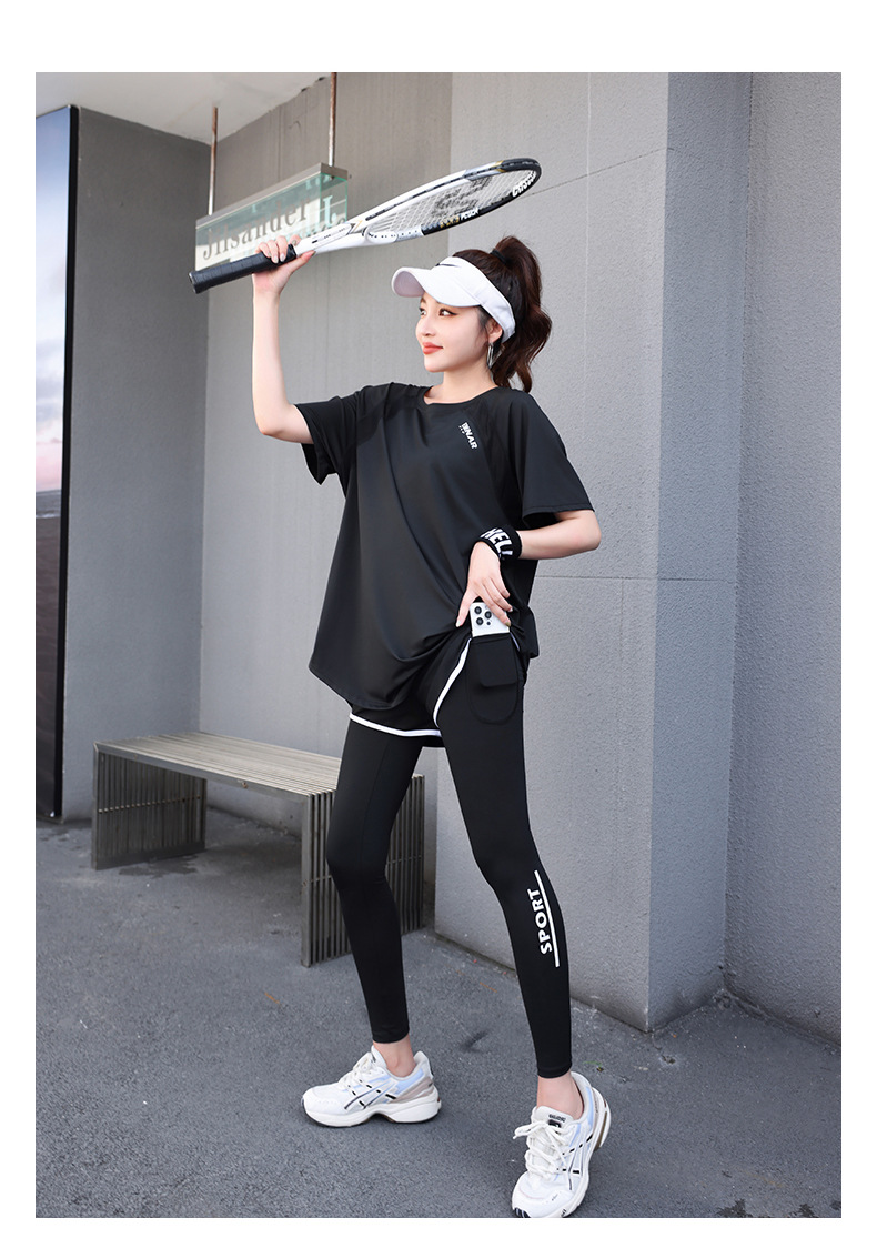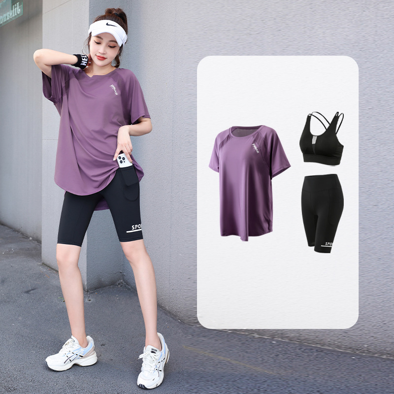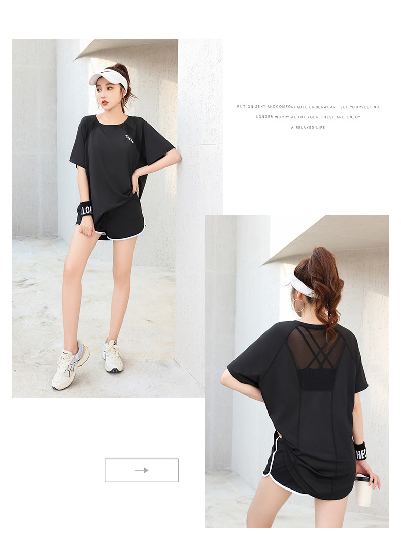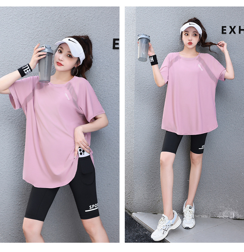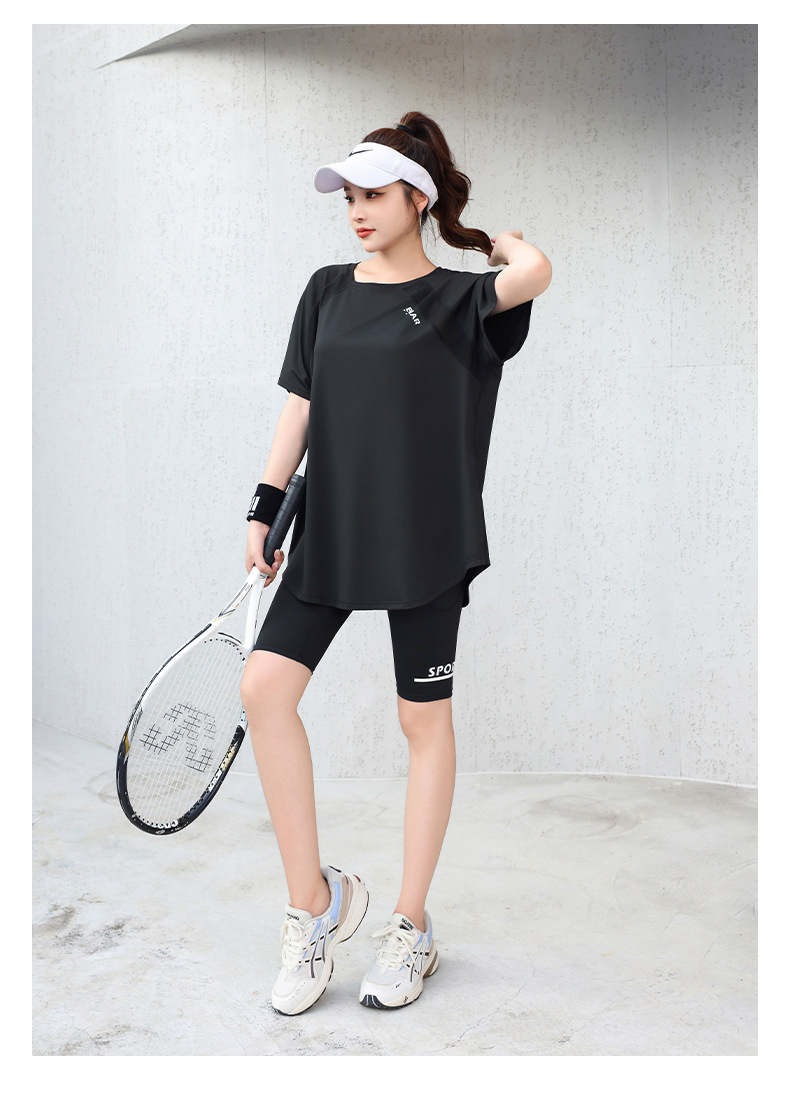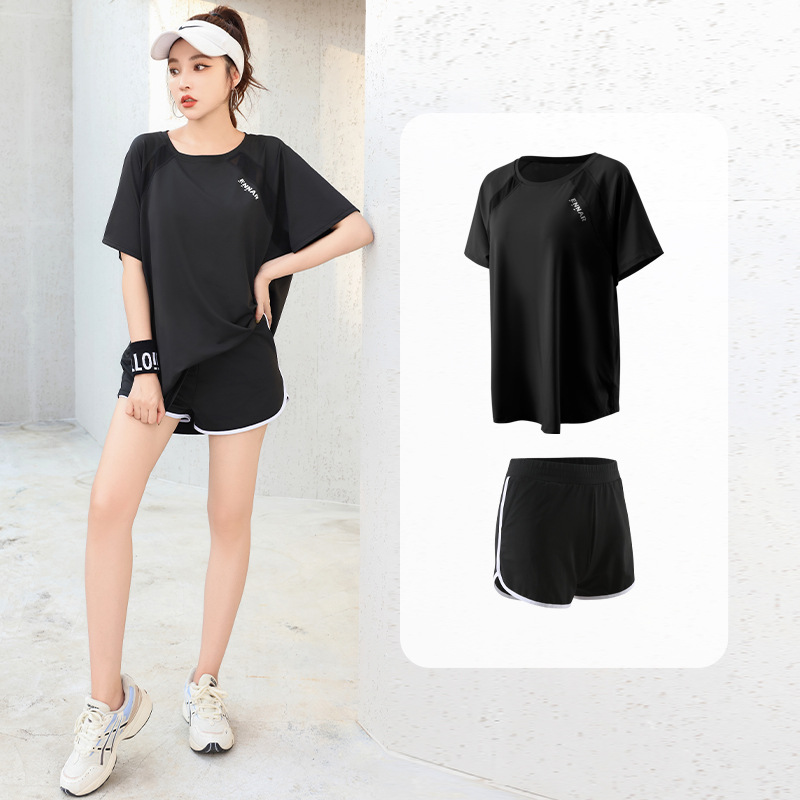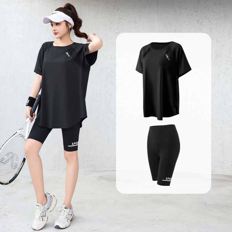 여름 새로운 반팔 티셔츠 느슨한 통기성 배꼽 커버 엉덩이 슬리밍 긴 반바지 스포츠 세트 피트니스 옷스토어 가기