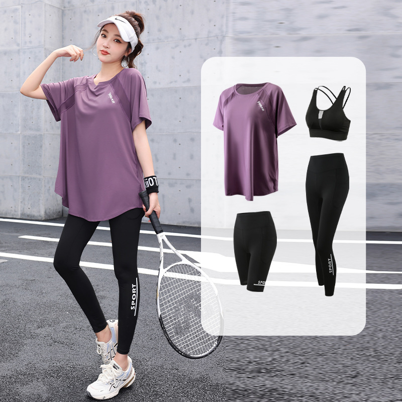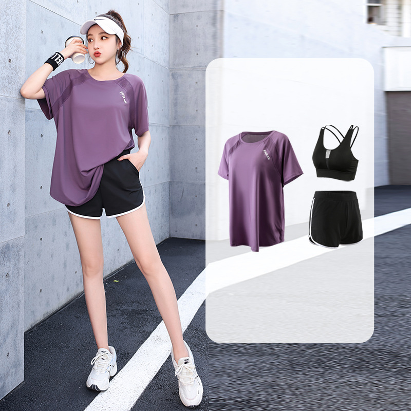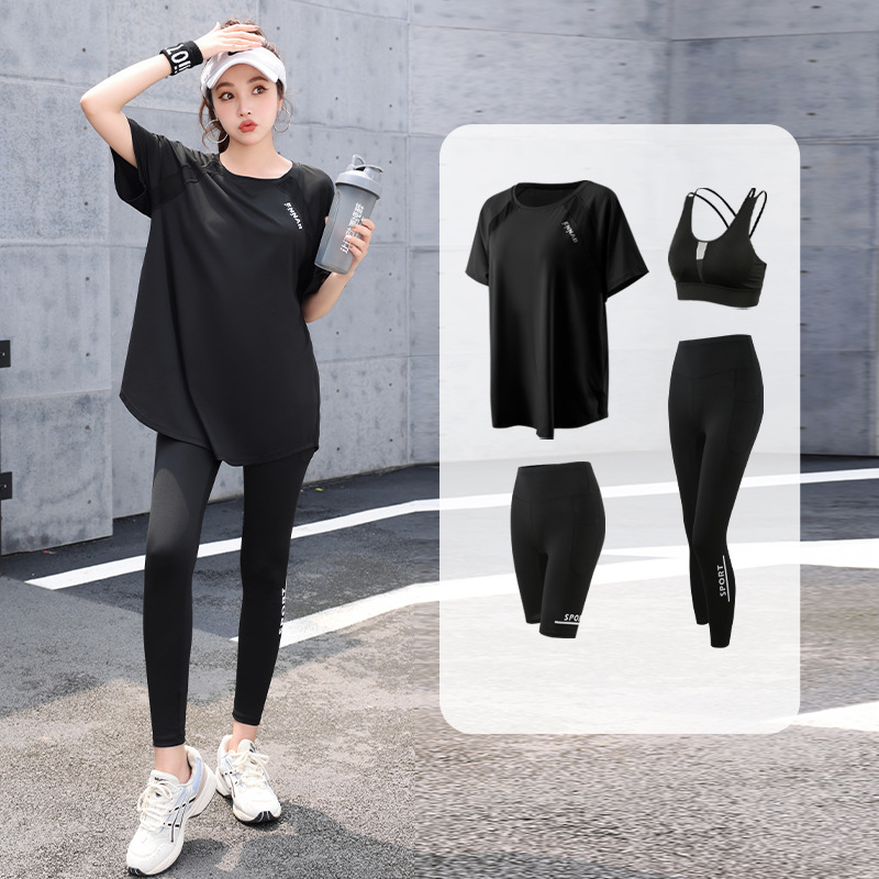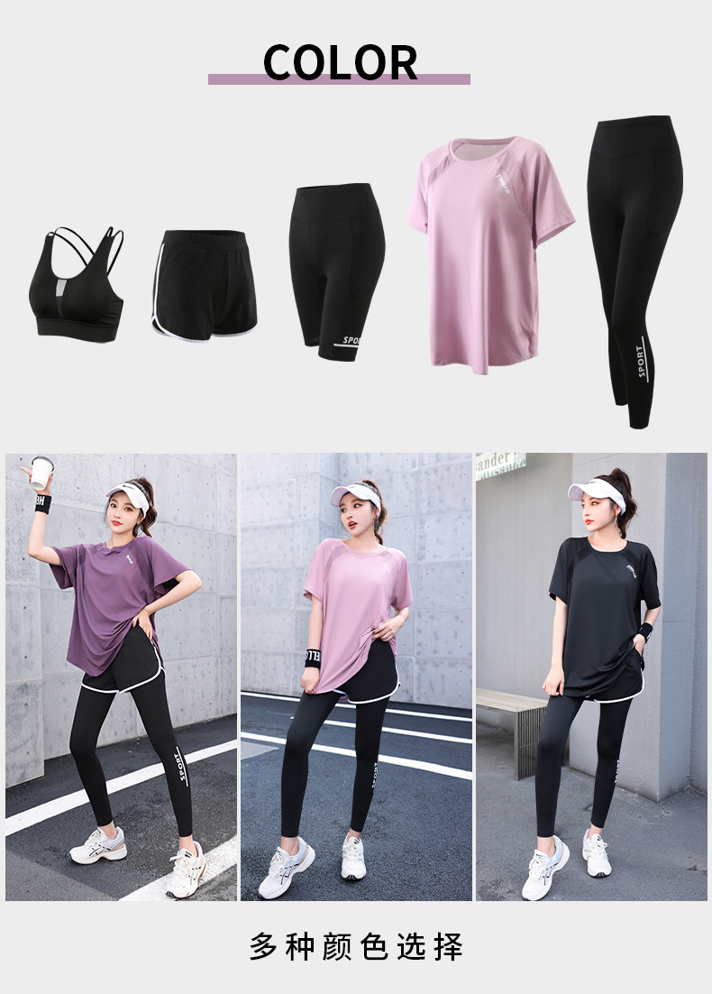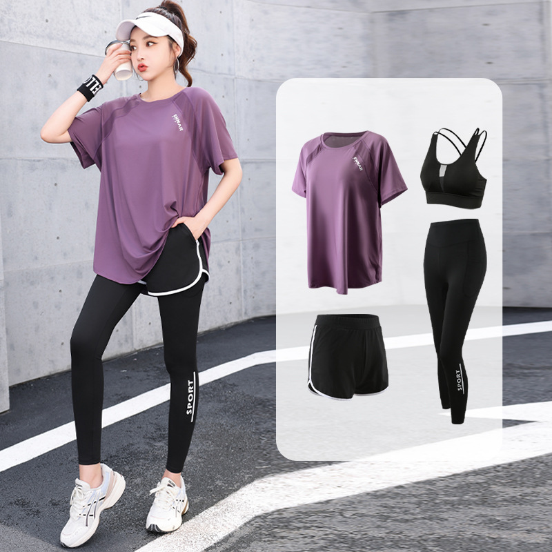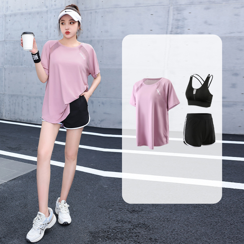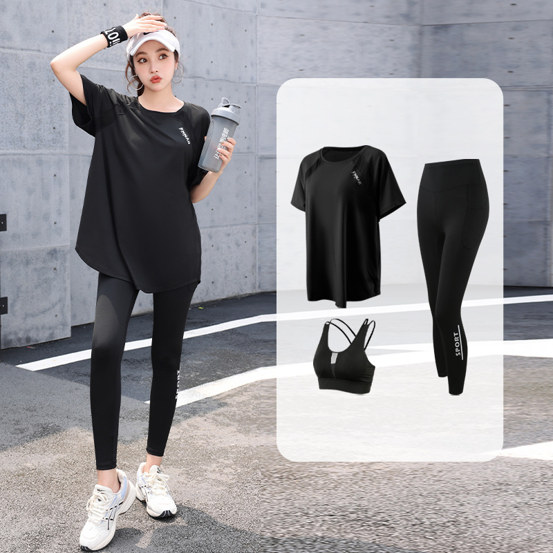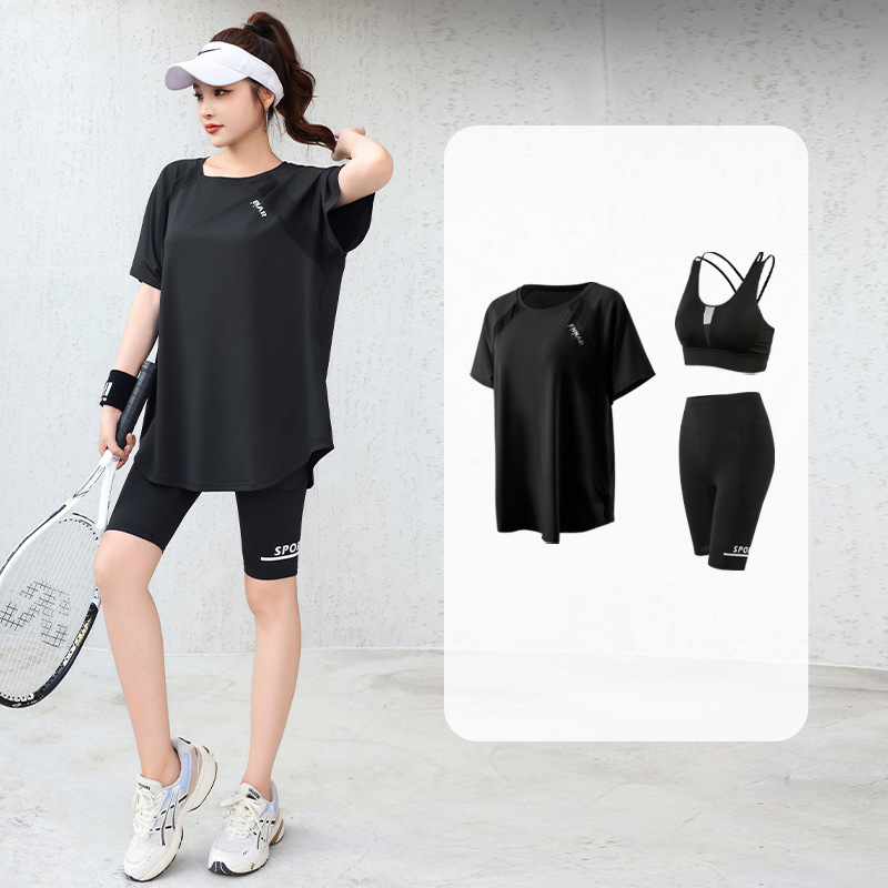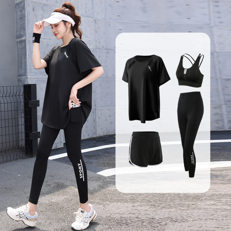 여름 새로운 반팔 티셔츠 느슨한 통기성 배꼽 커버 엉덩이 슬리밍 긴 반바지 스포츠 세트 피트니스 옷스토어 가기