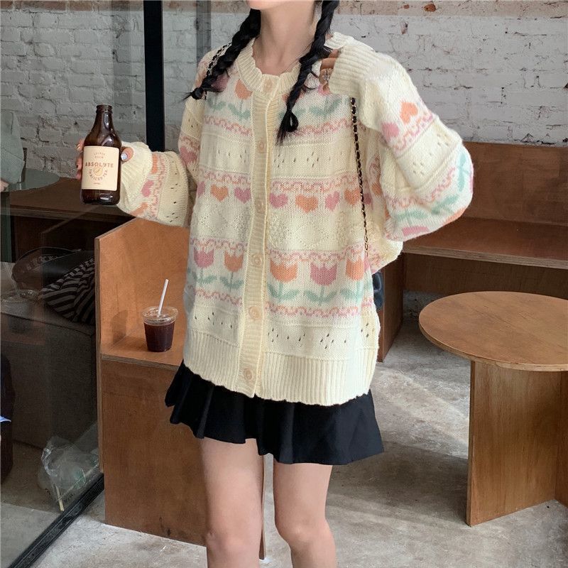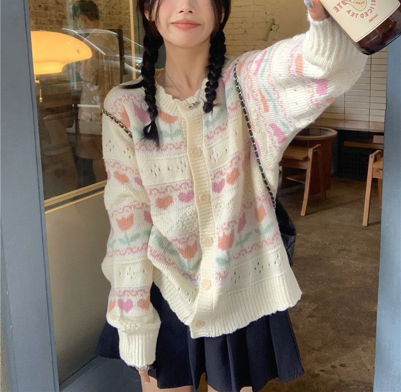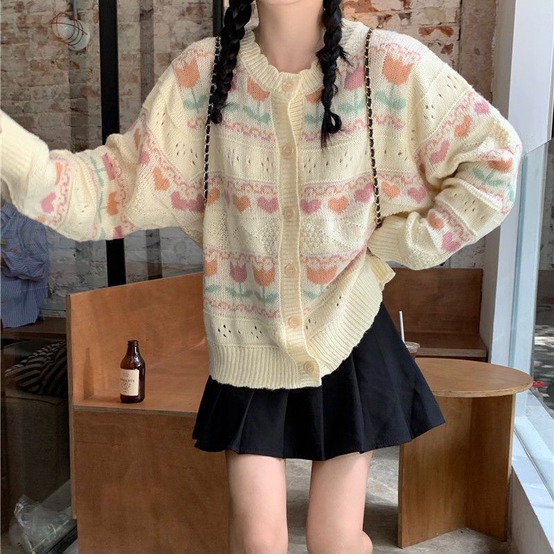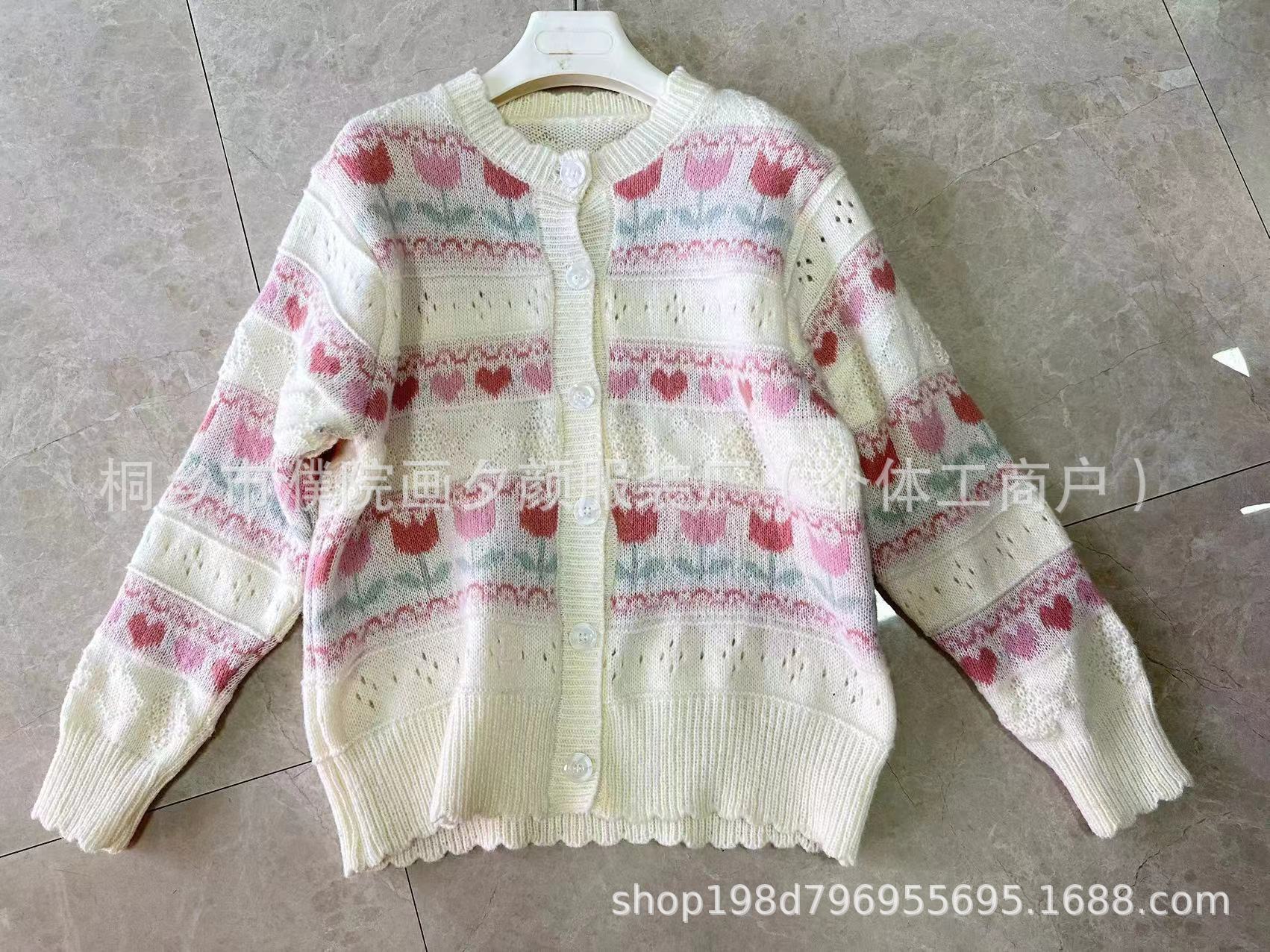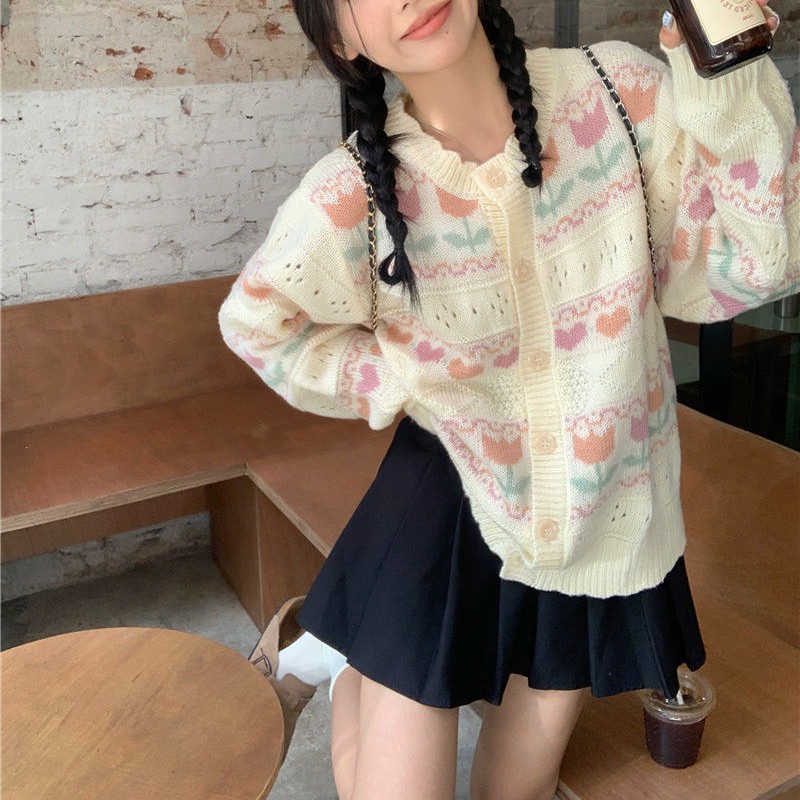일본 색상 대비 꽃 부드러운 왁스 스웨터 코트 여성의 2024 가을 및 겨울 새로운 달콤한 자카드 올 매치 니트 카디건스토어 가기