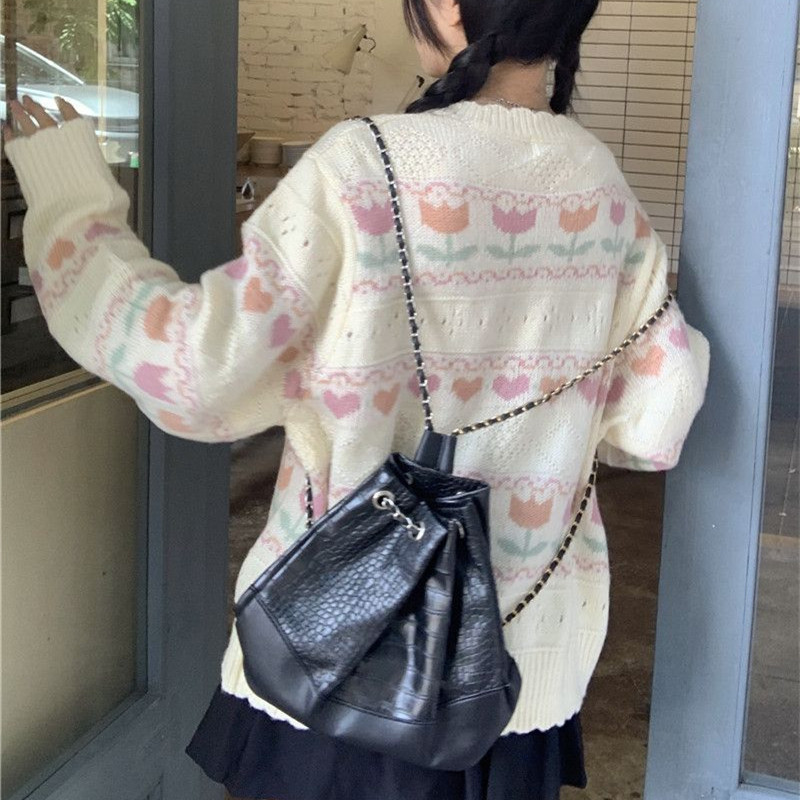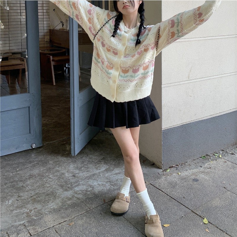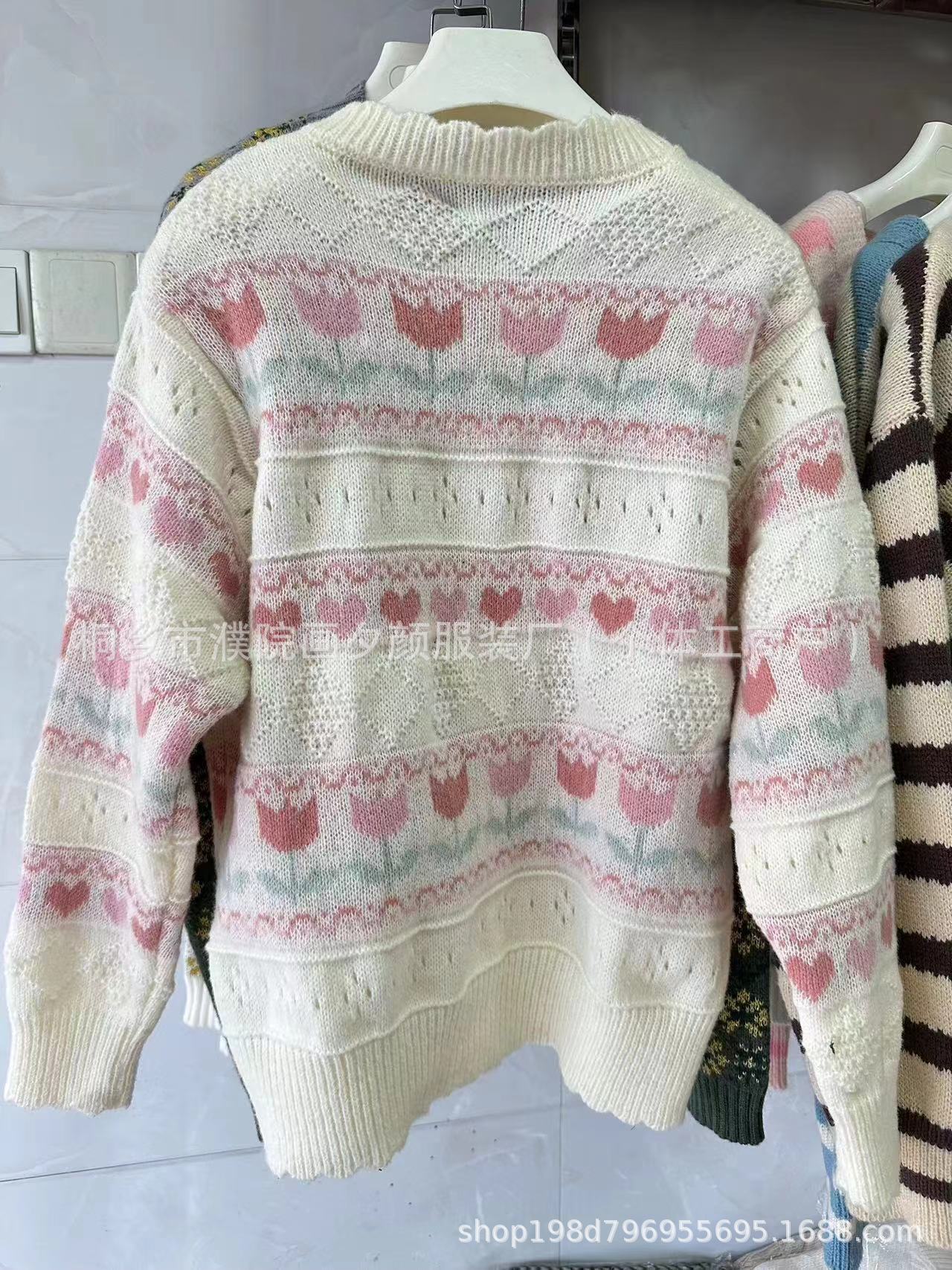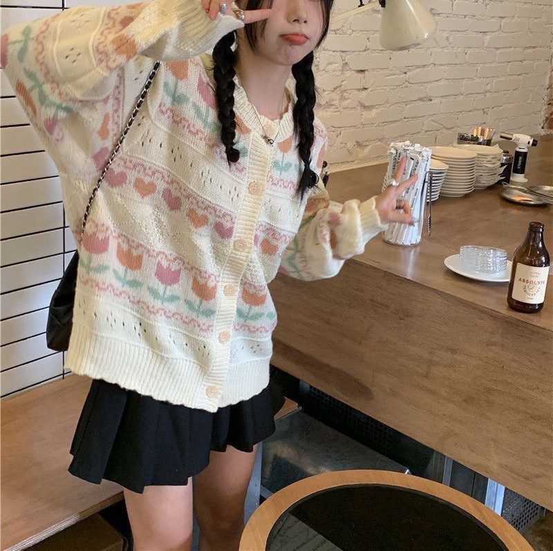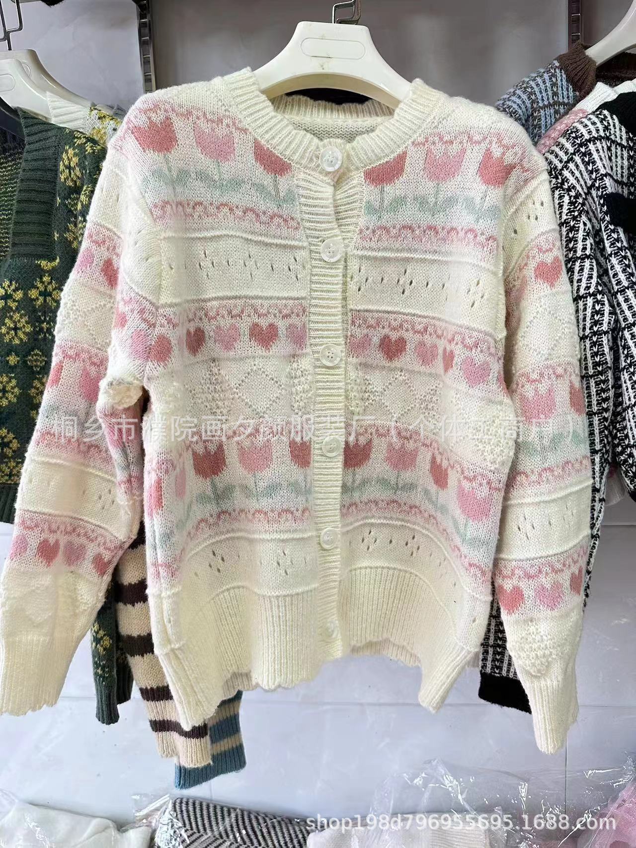 일본 색상 대비 꽃 부드러운 왁스 스웨터 코트 여성의 2024 가을 및 겨울 새로운 달콤한 자카드 올 매치 니트 카디건스토어 가기