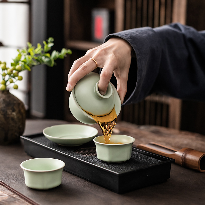 • 定窑梅子青一盖碗二杯+六角窗花黑盘✦