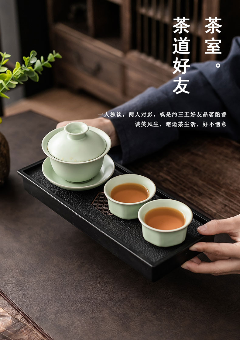 • 青瓷一盖碗二杯+六角窗花黑盘✦