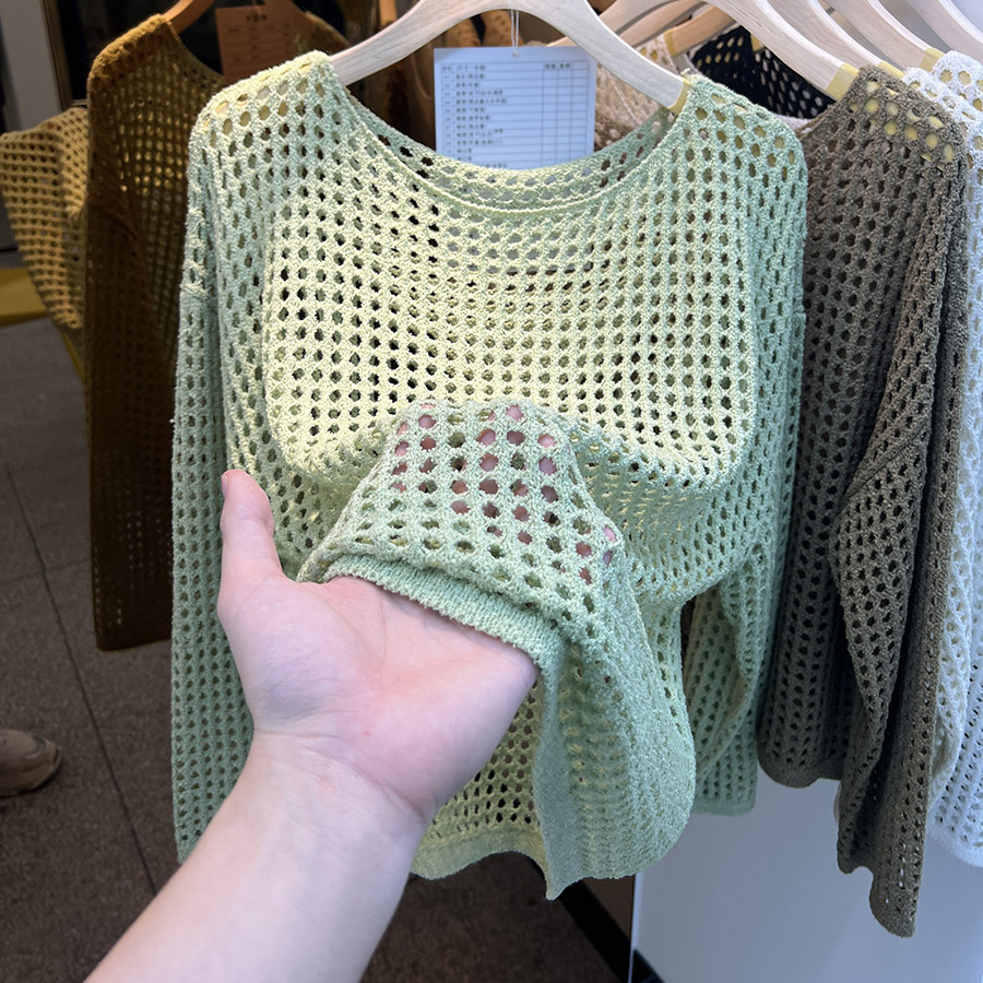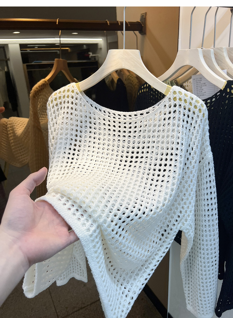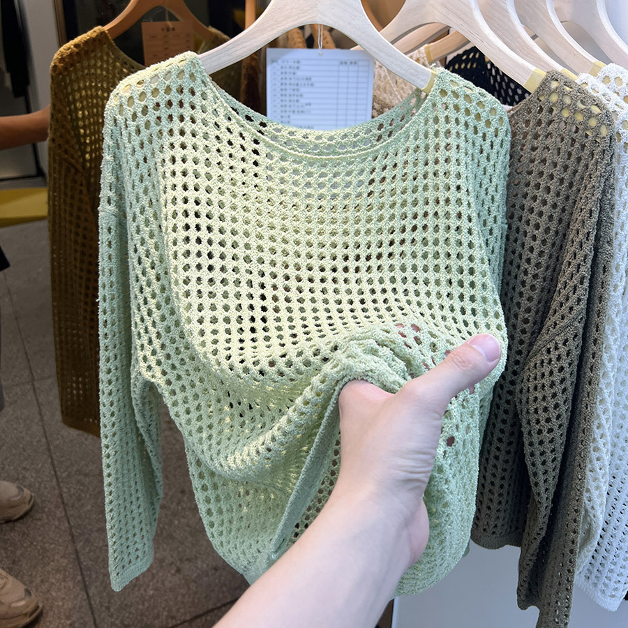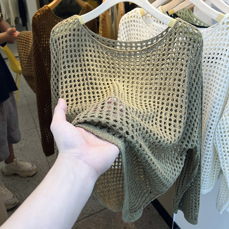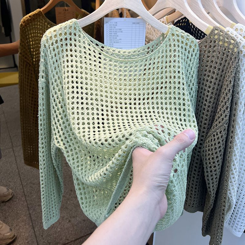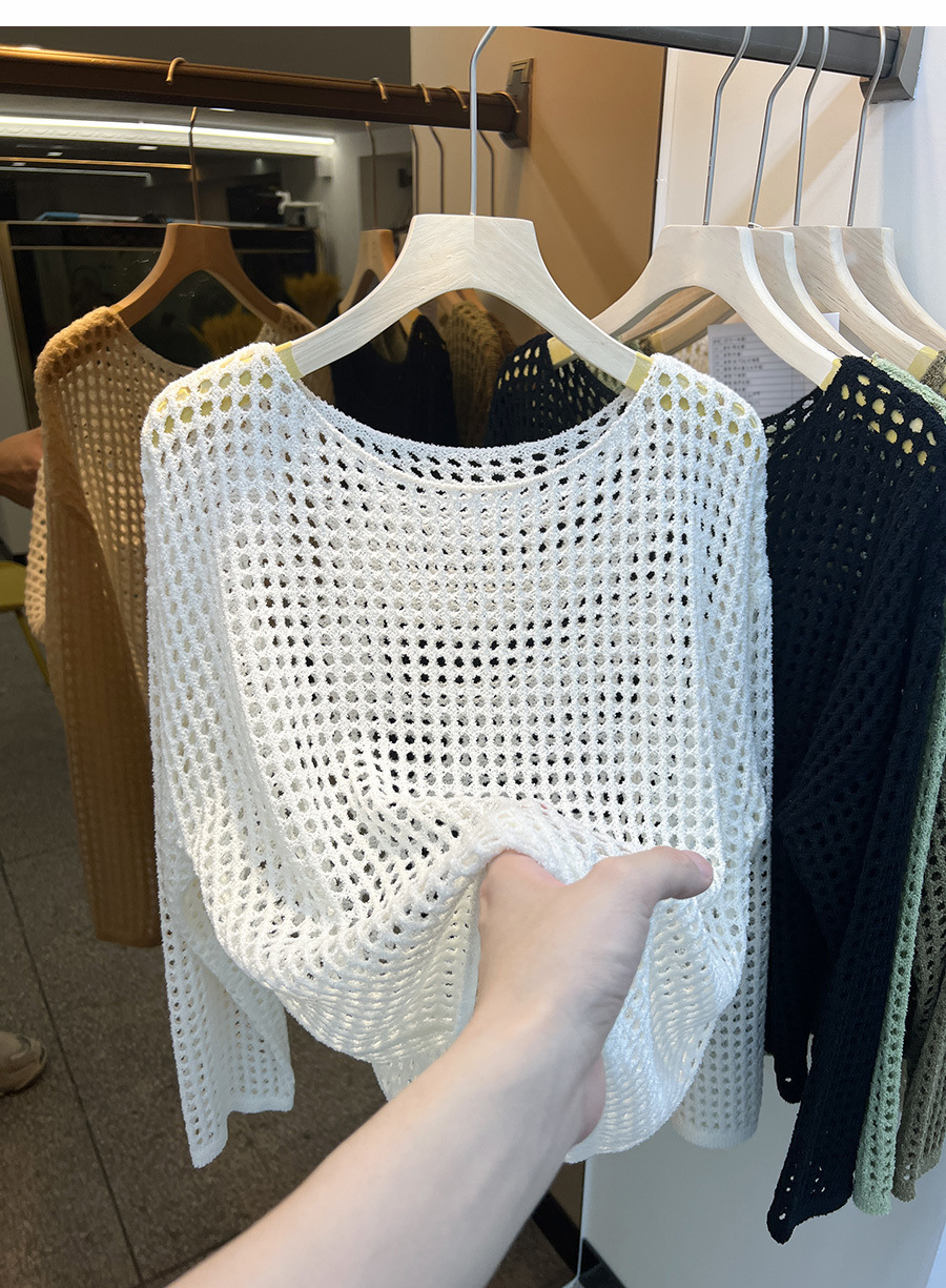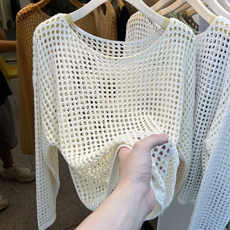 비스코스 섬유 화이트 블라우스 여성용 니트 탑 여름 얇은 긴팔 빈 스웨터 메쉬 셔츠 외부 풀오버