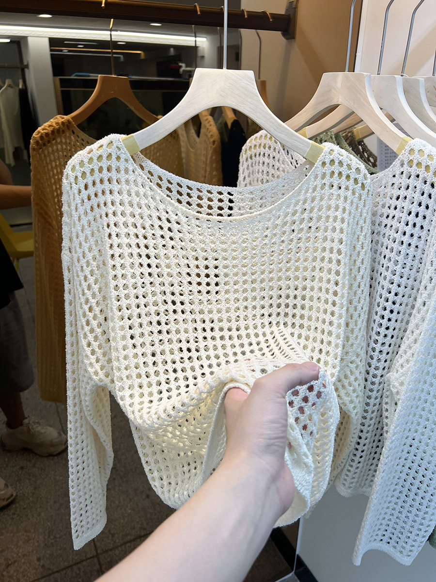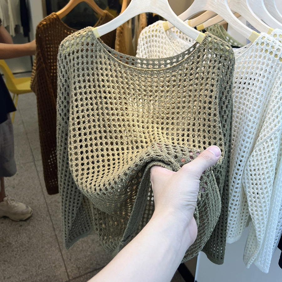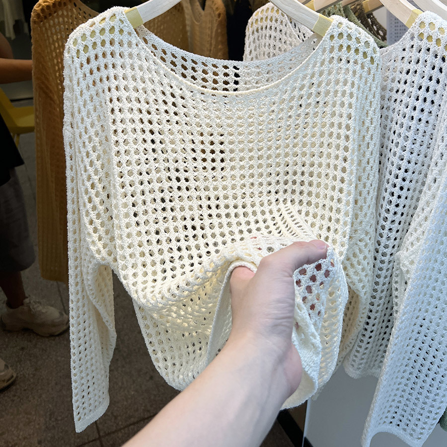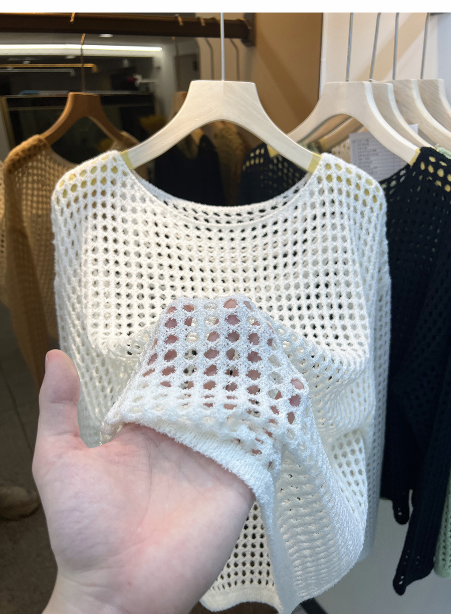비스코스 섬유 화이트 블라우스 여성용 니트 탑 여름 얇은 긴팔 빈 스웨터 메쉬 셔츠 외부 풀오버스토어 가기