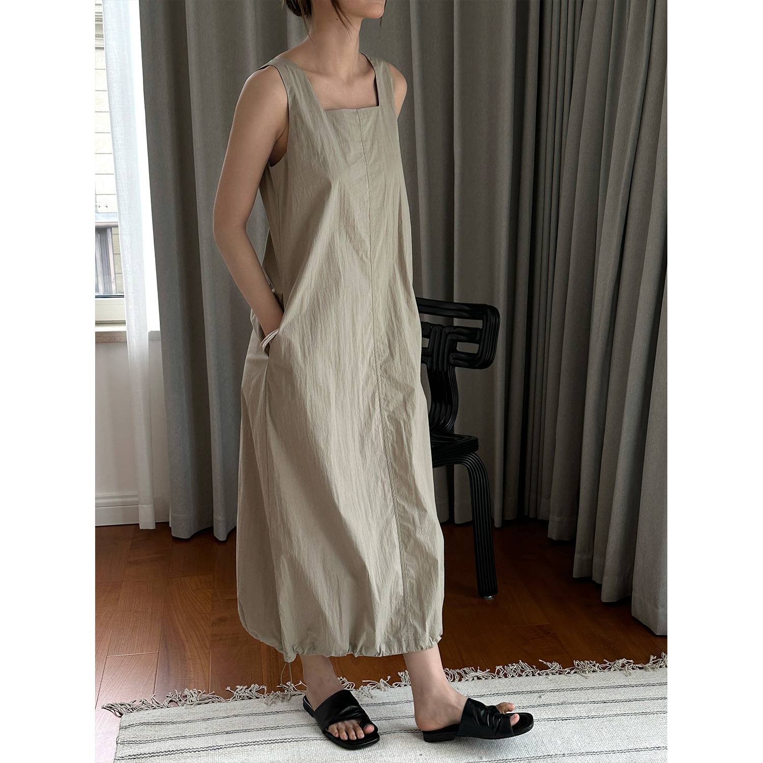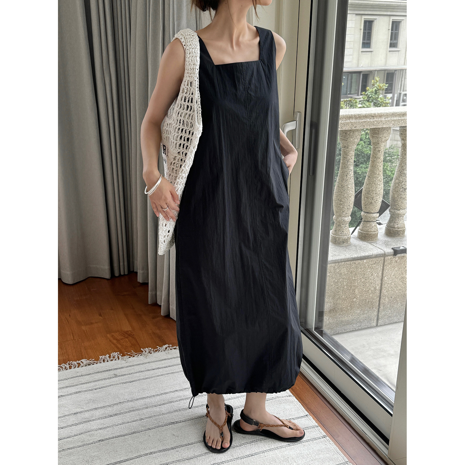 Lvu 여름 새로운 한국 스타일 간단한 스퀘어 칼라 민소매 원피스 모양 시원한 느낌 편안한 피부 친화적 인 캐주얼 긴 원피스