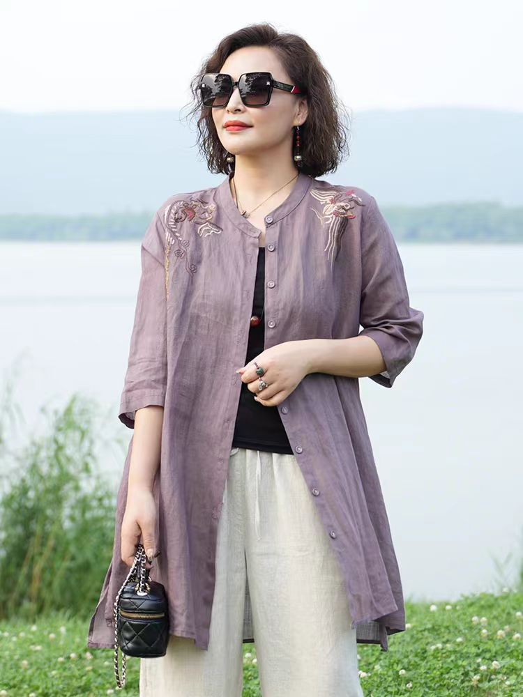 예술적 복고풍 자수 중장 셔츠 여성용 외부 얇은 면화 및 리넨 선스크린 카디건