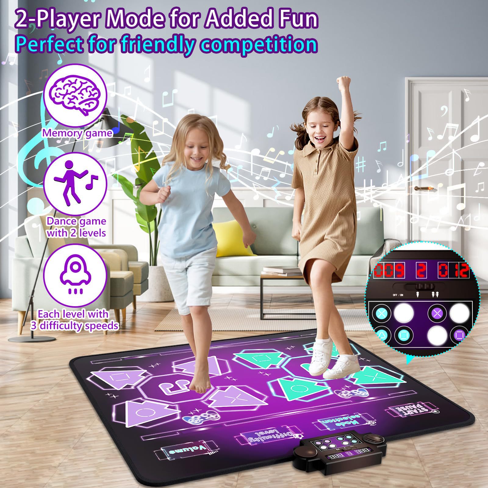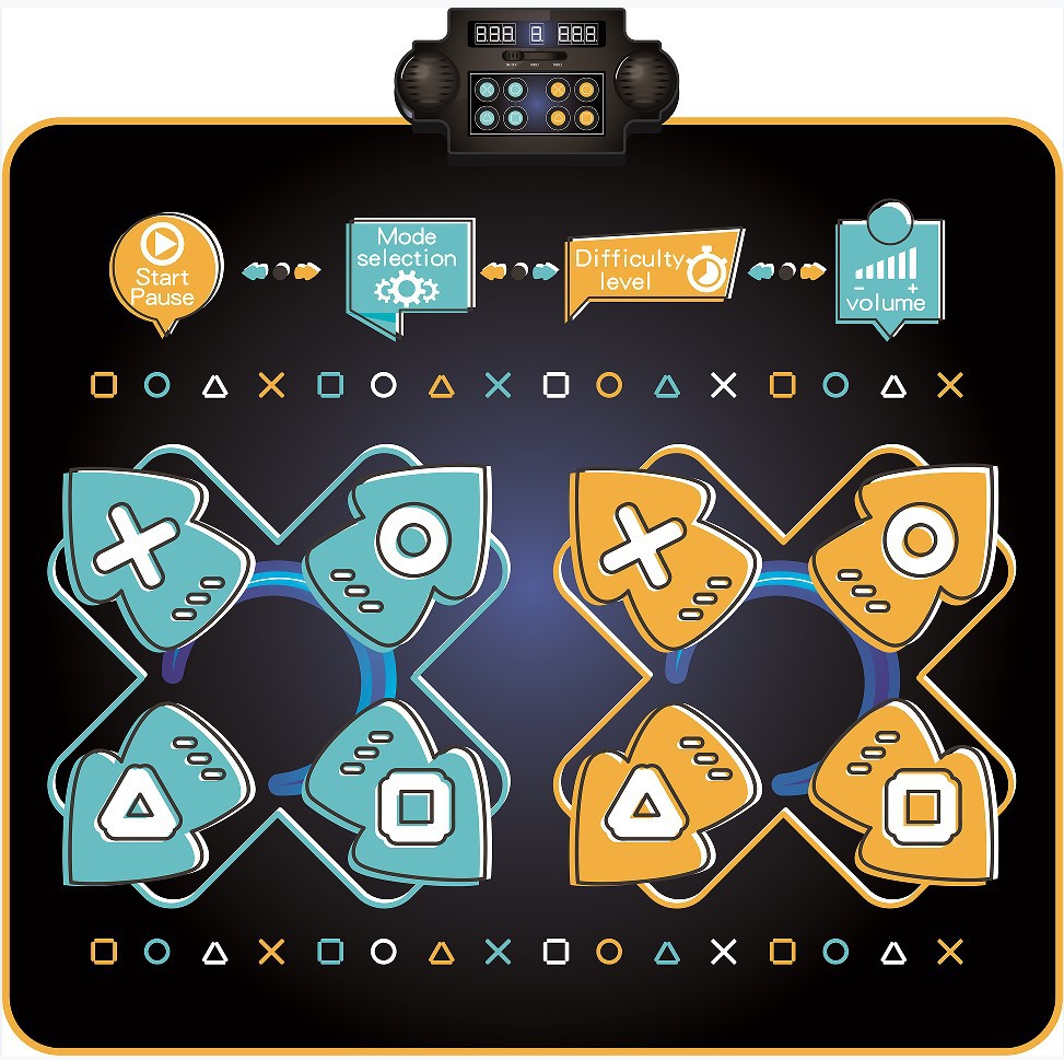 双人款跳舞毯,表面防水PE+OPP复合膜,底布PEVA防滑底布,环保材质可过测试,毯面图案、功能和IC都可定制,欢迎咨询。