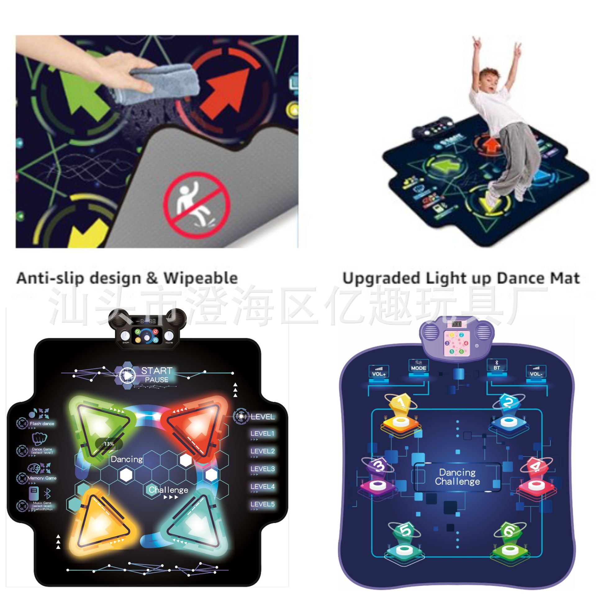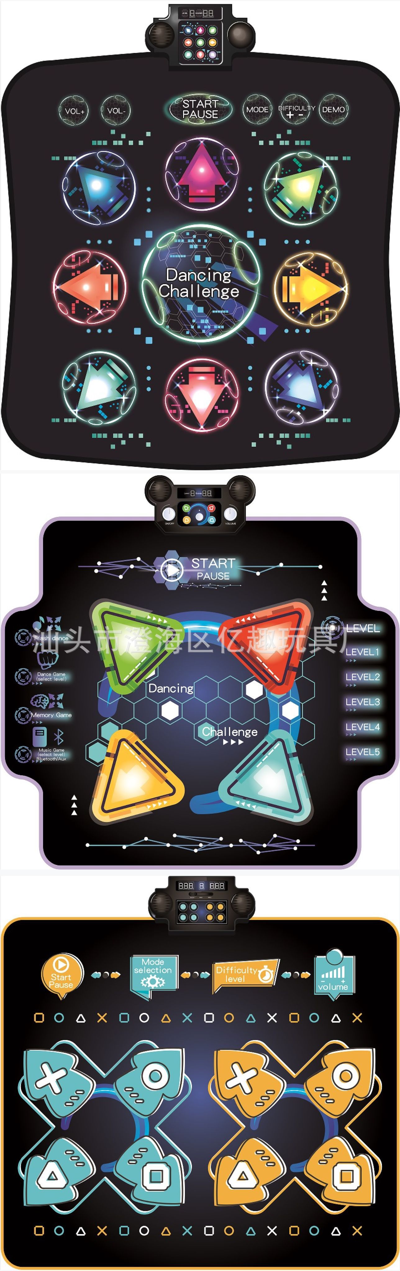 蓝牙灯光跳舞毯,表面防水PE+OPP复合膜,底布PEVA防滑底布,环保材质可过测试,毯面图案、功能和IC都可定制,欢迎咨询。