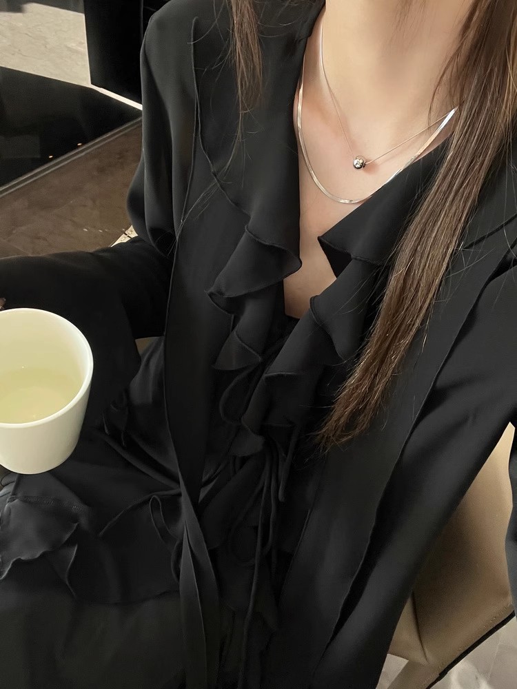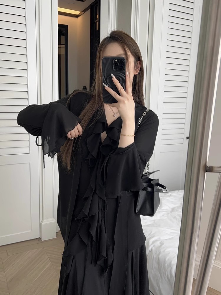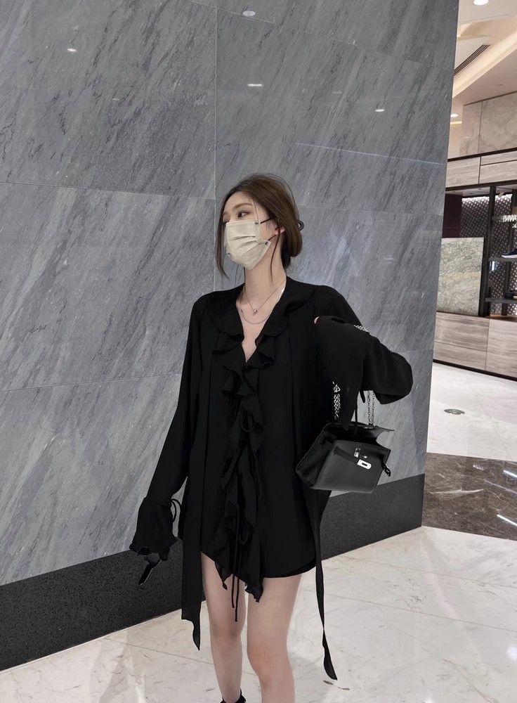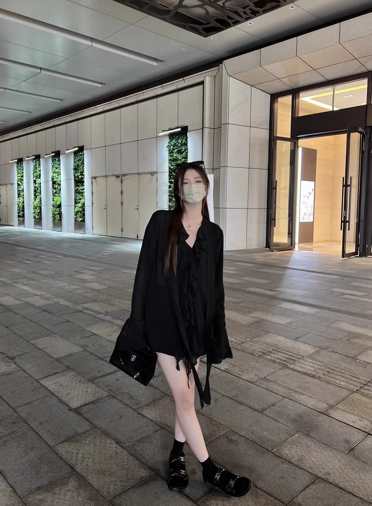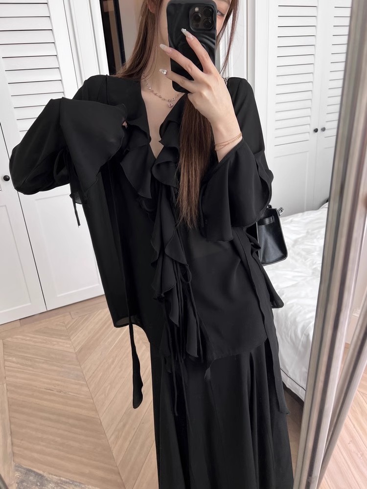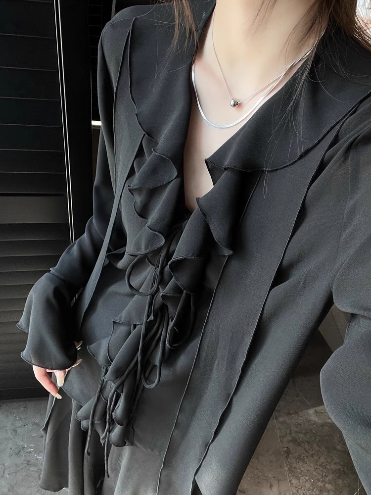 게으른 스타일 선 스크린 블라우스 틈새 고급 블랙 V 넥 불규칙한 프랑스 러플 쉬폰 셔츠