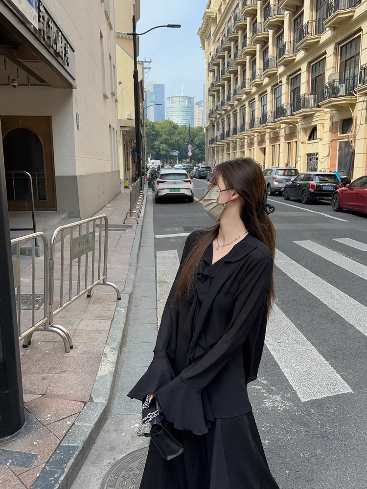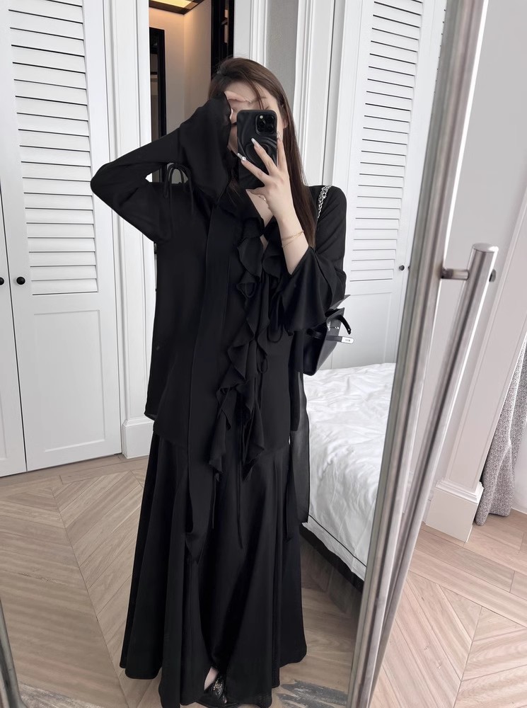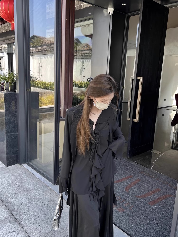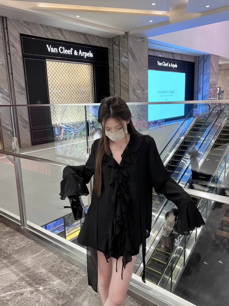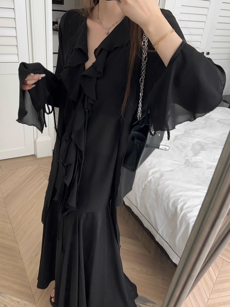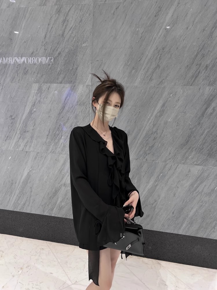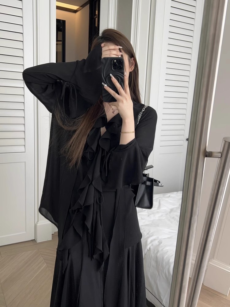 게으른 스타일 선 스크린 블라우스 틈새 고급 블랙 V 넥 불규칙한 프랑스 러플 쉬폰 셔츠