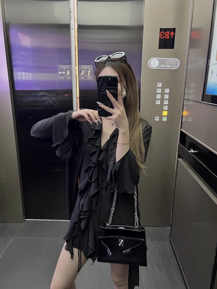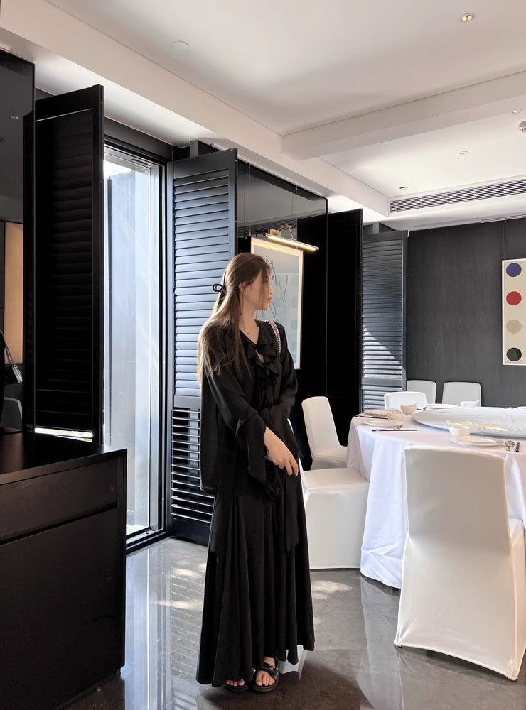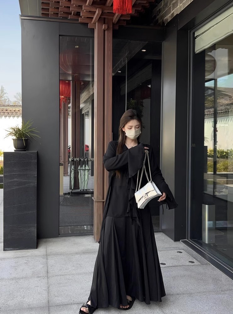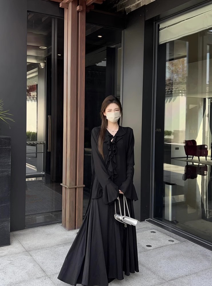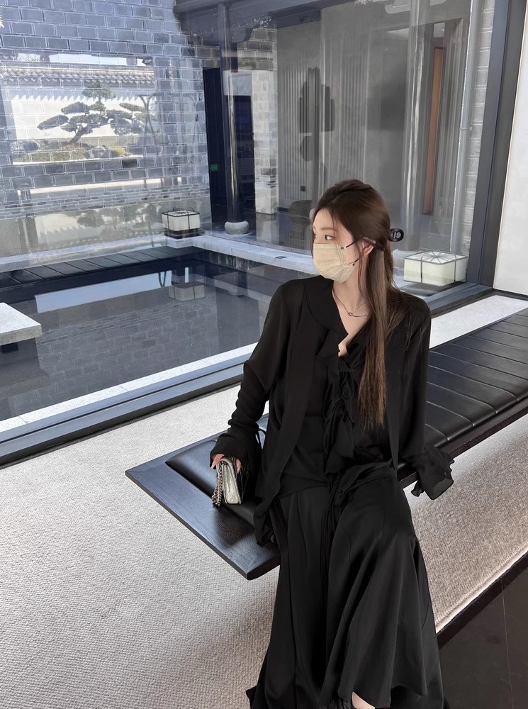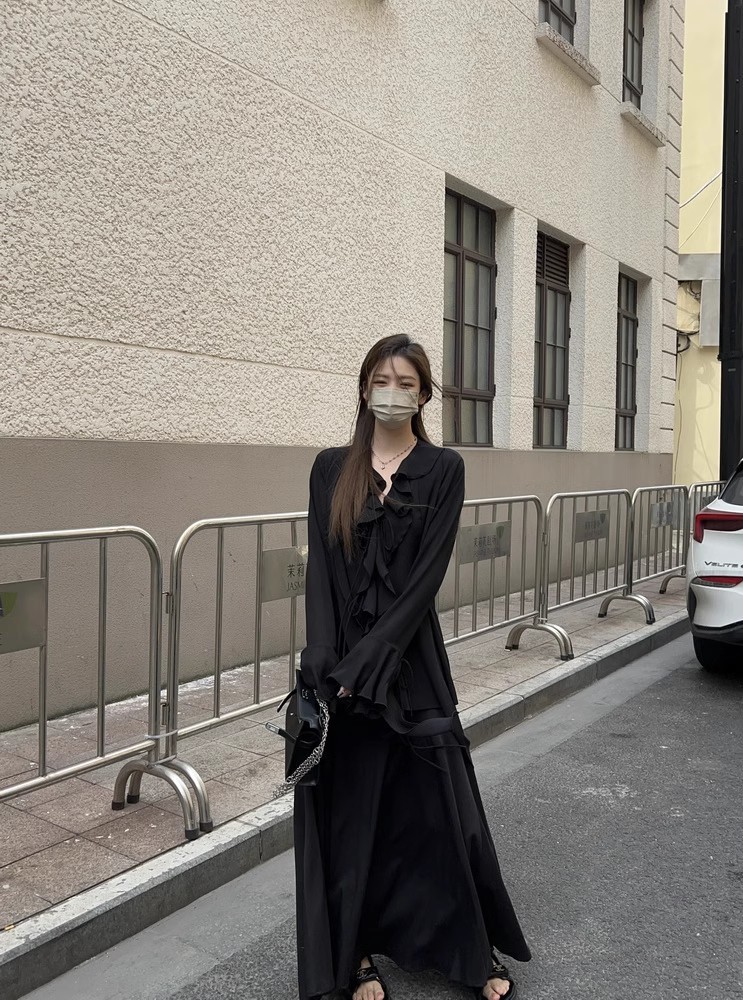 게으른 스타일 선 스크린 블라우스 틈새 고급 블랙 V 넥 불규칙한 프랑스 러플 쉬폰 셔츠
