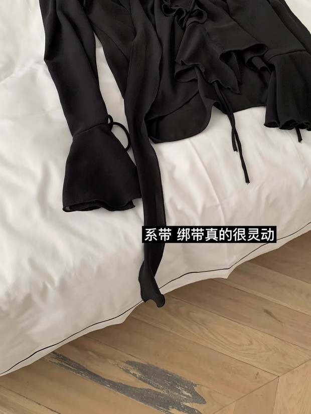 게으른 스타일 선 스크린 블라우스 틈새 고급 블랙 V 넥 불규칙한 프랑스 러플 쉬폰 셔츠스토어 가기