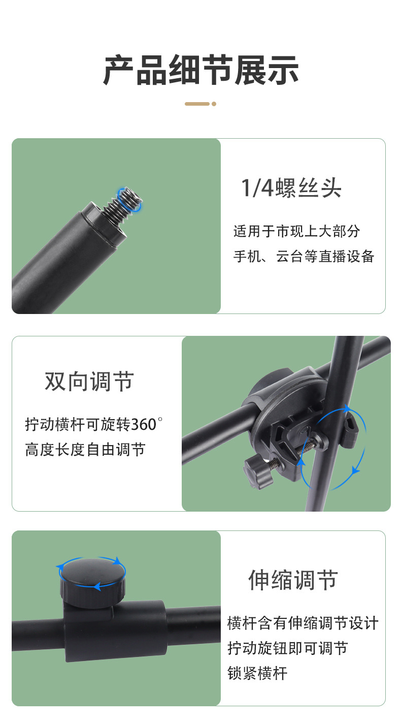 라이브 스트리밍 휴대폰 홀더, 마이크 크로스바, 텔레스코픽 마이크 클립, 오버헤드 촬영 삼각대, 보조 조명, 셀카 촬영