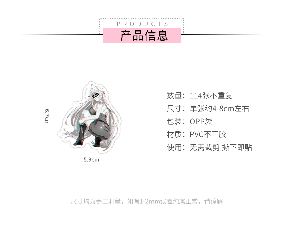 产品采用防水材质,进口海德堡高清印刷、覆膜,贴纸按形状模切完好,不用担心自己裁剪地歪歪扭扭