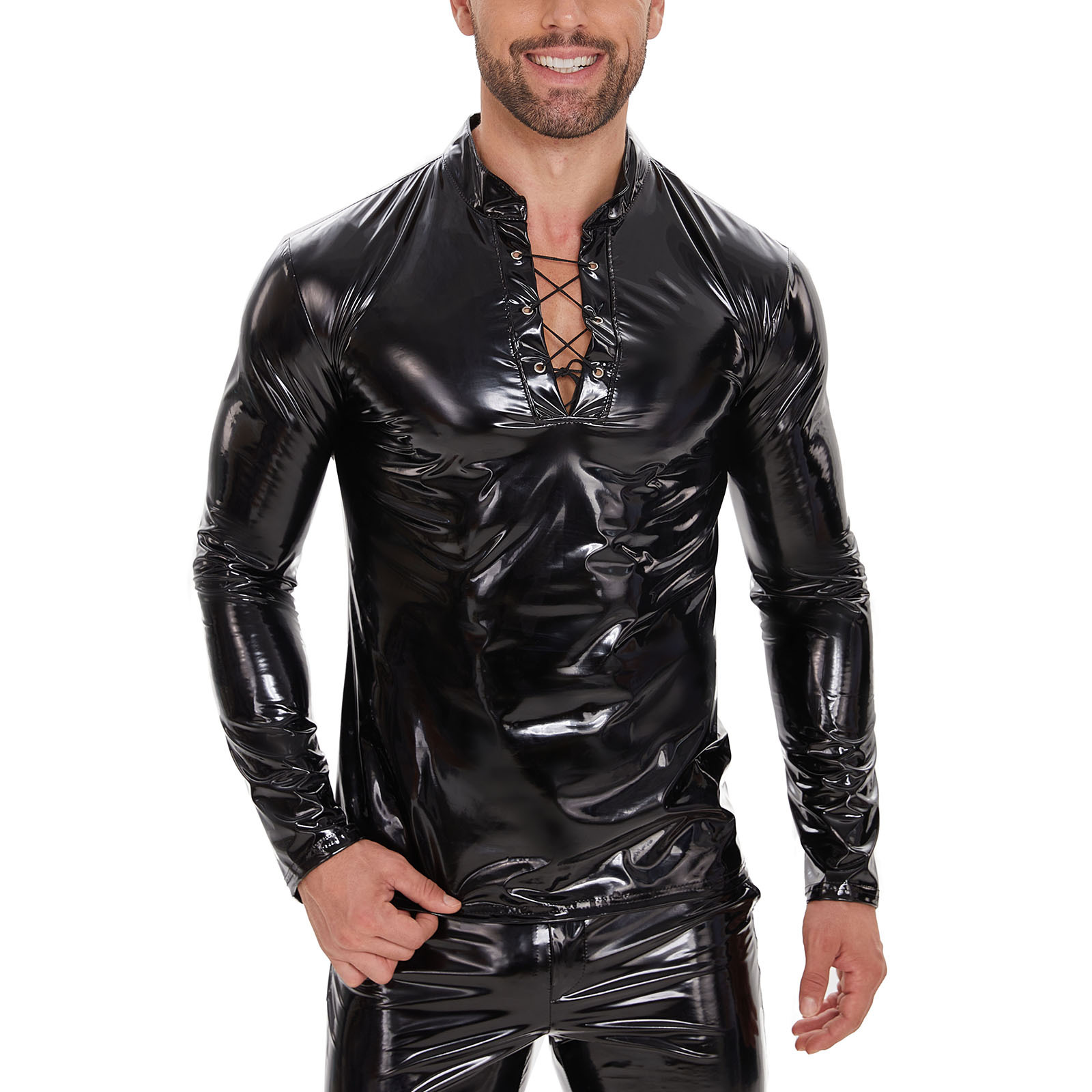국경 간 제품 남성 PU 거울 밝은 가죽 긴팔 캐주얼 재킷 블랙 슬림 핏 레이스 업 칼라 가죽 자켓스토어 가기