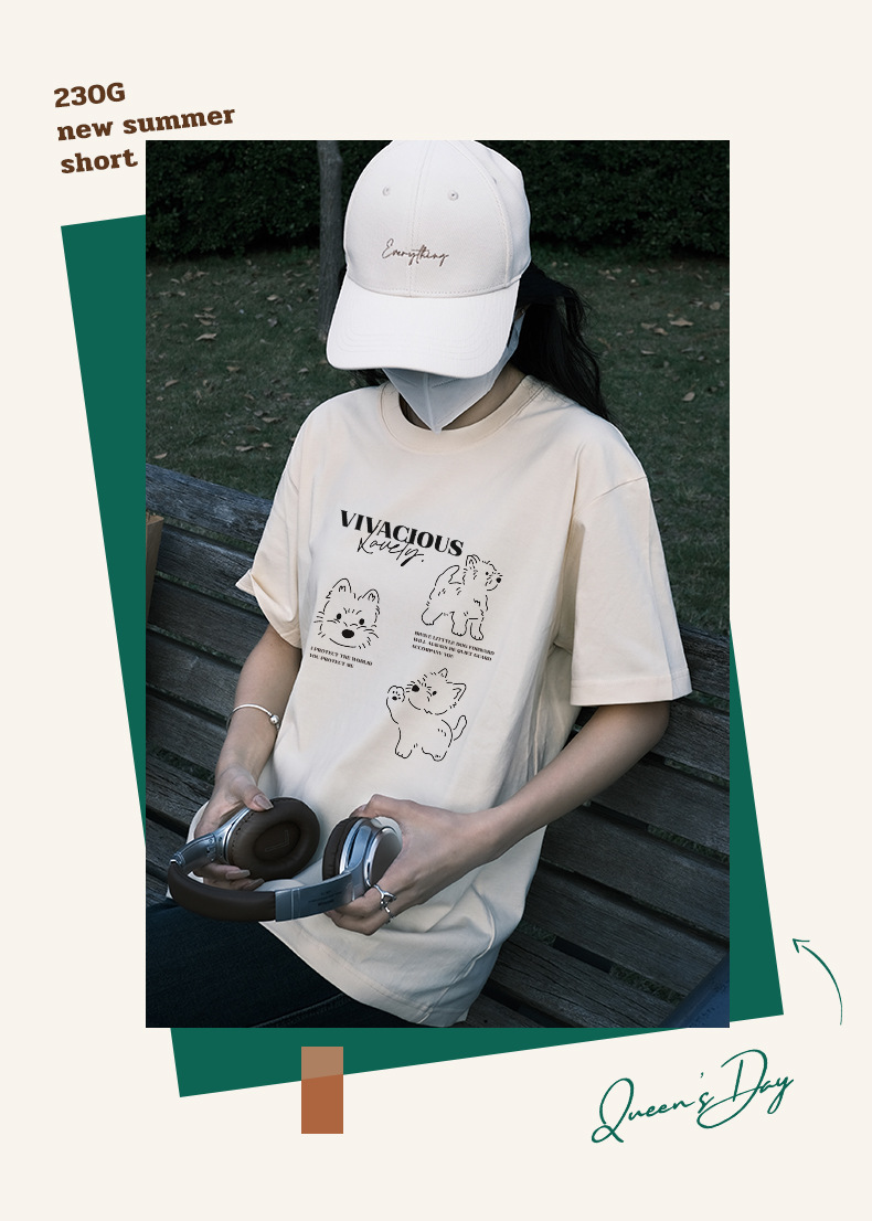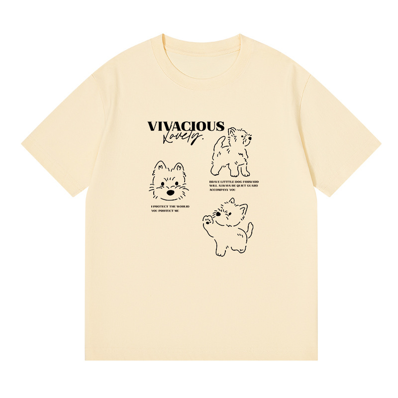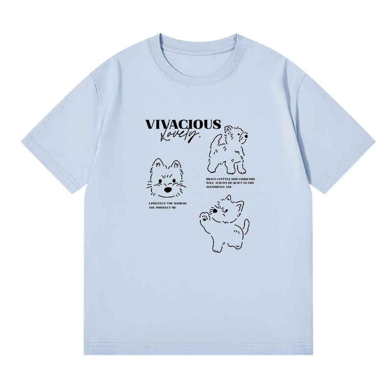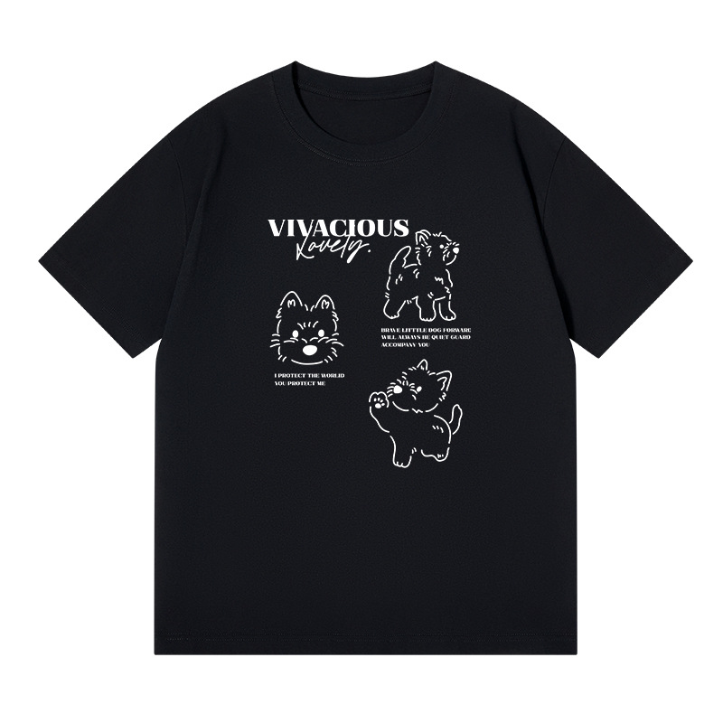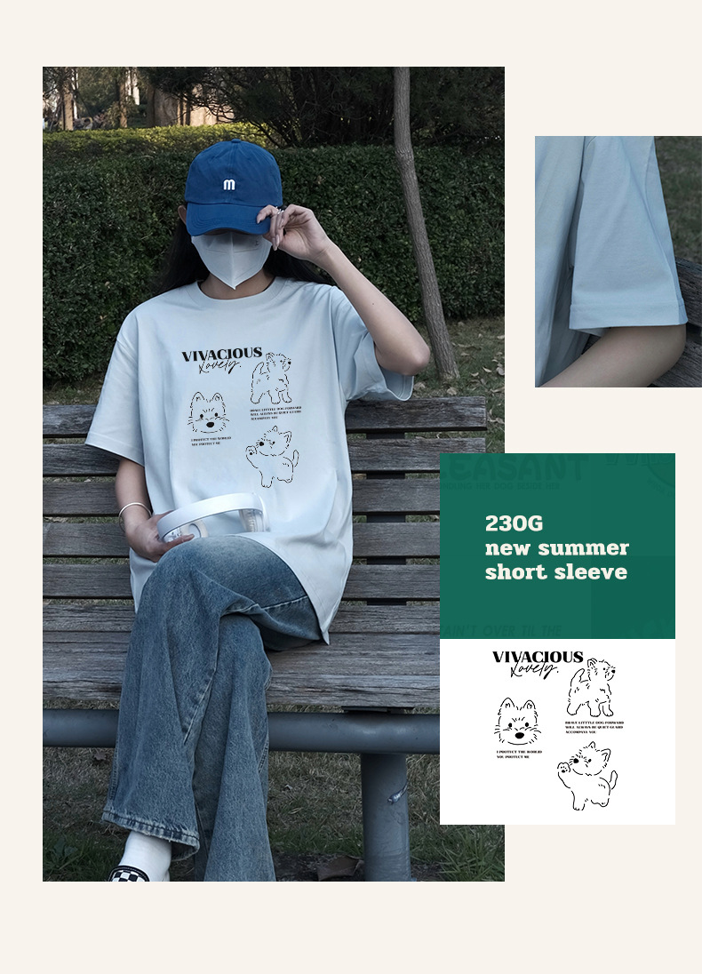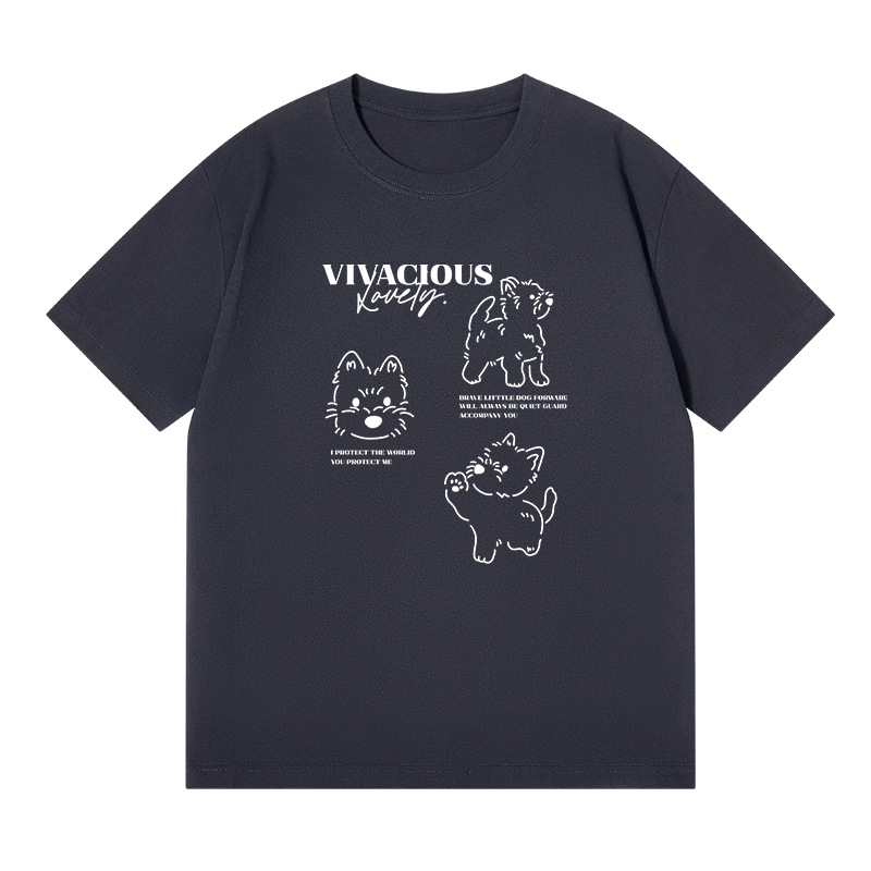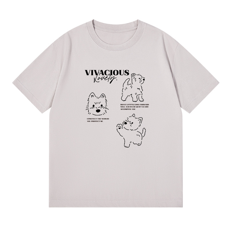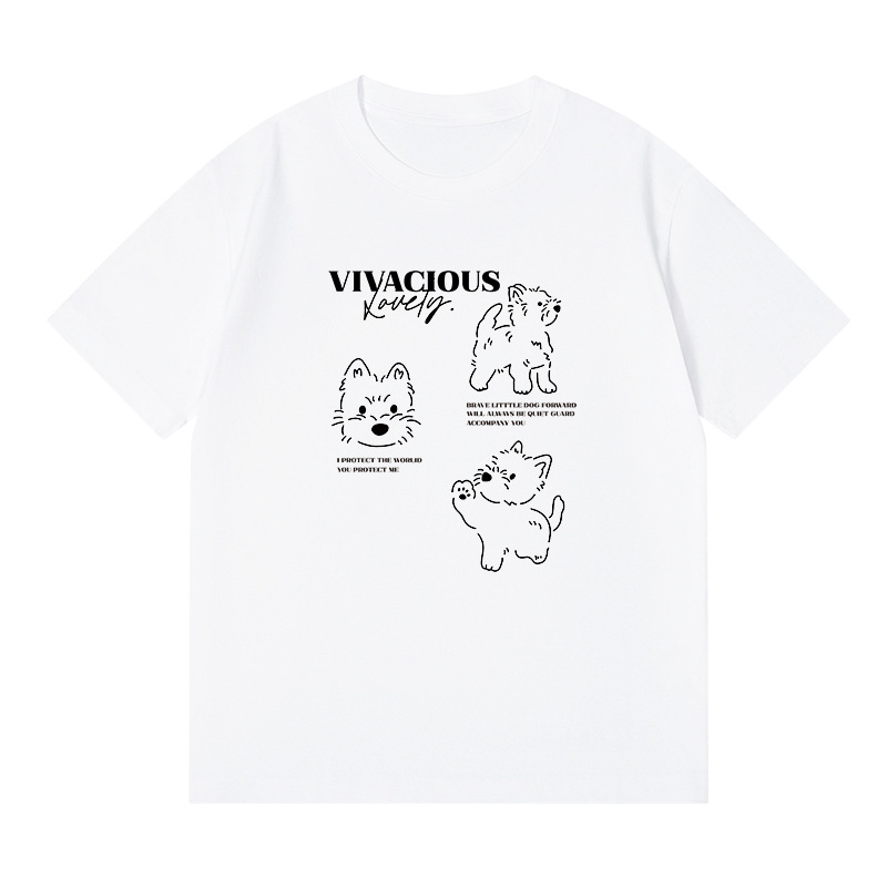 빗질 면화 230g 강아지 인쇄 짧은 소매 여성 티셔츠 여름 새로운 틈새 재미 간단한 느슨한 흰색 t