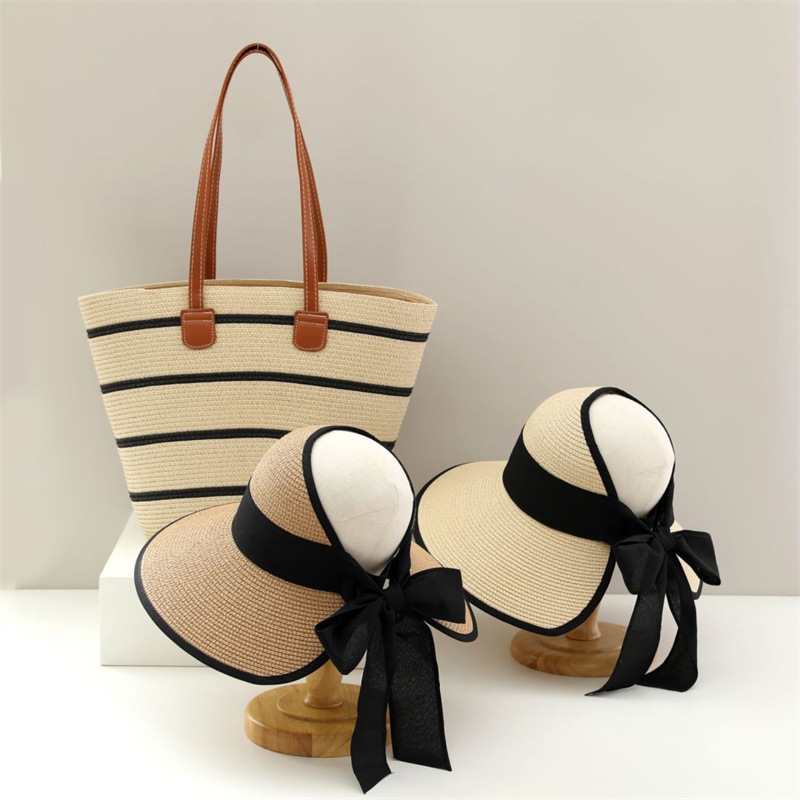 빈 탑 밀짚 모자 여성의 여름 해변 햇빛 선스크린 가방 2 조각 야외 휴가 대용량 어깨 가방