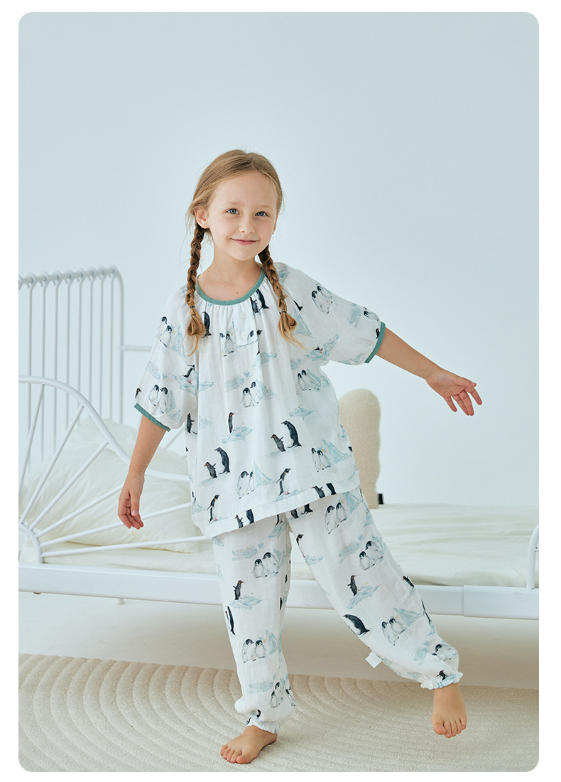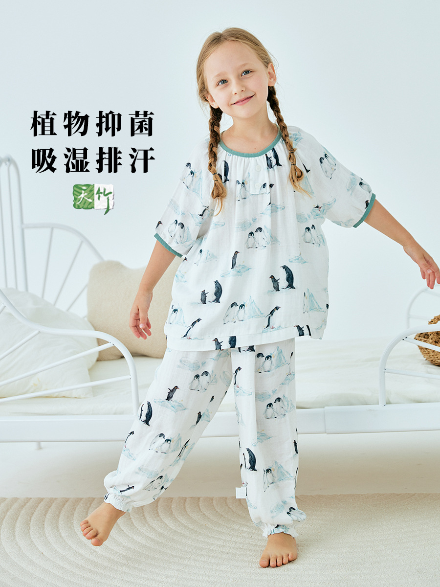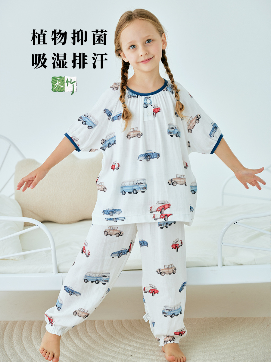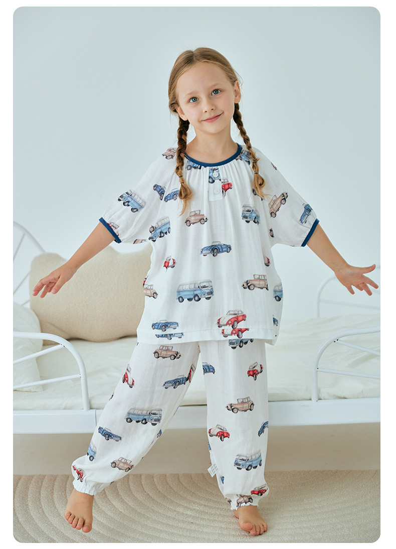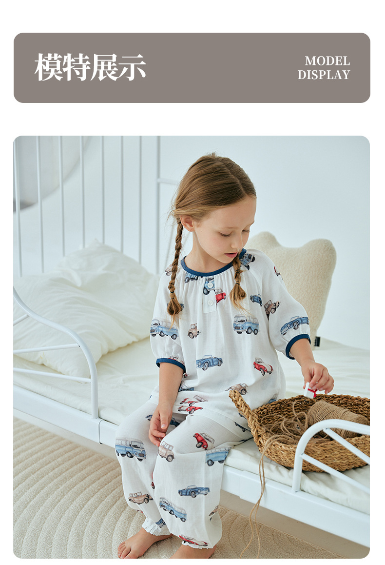 Xiazhu Cotton Gauze 유치원 통기성 에어컨 셔츠 소년의 모기 방지 바지 소녀 어린이 홈 의류 세트스토어 가기