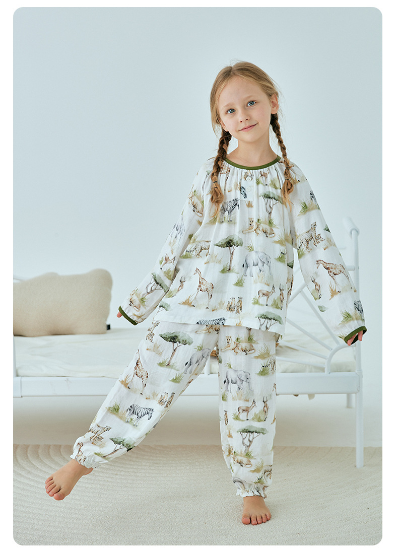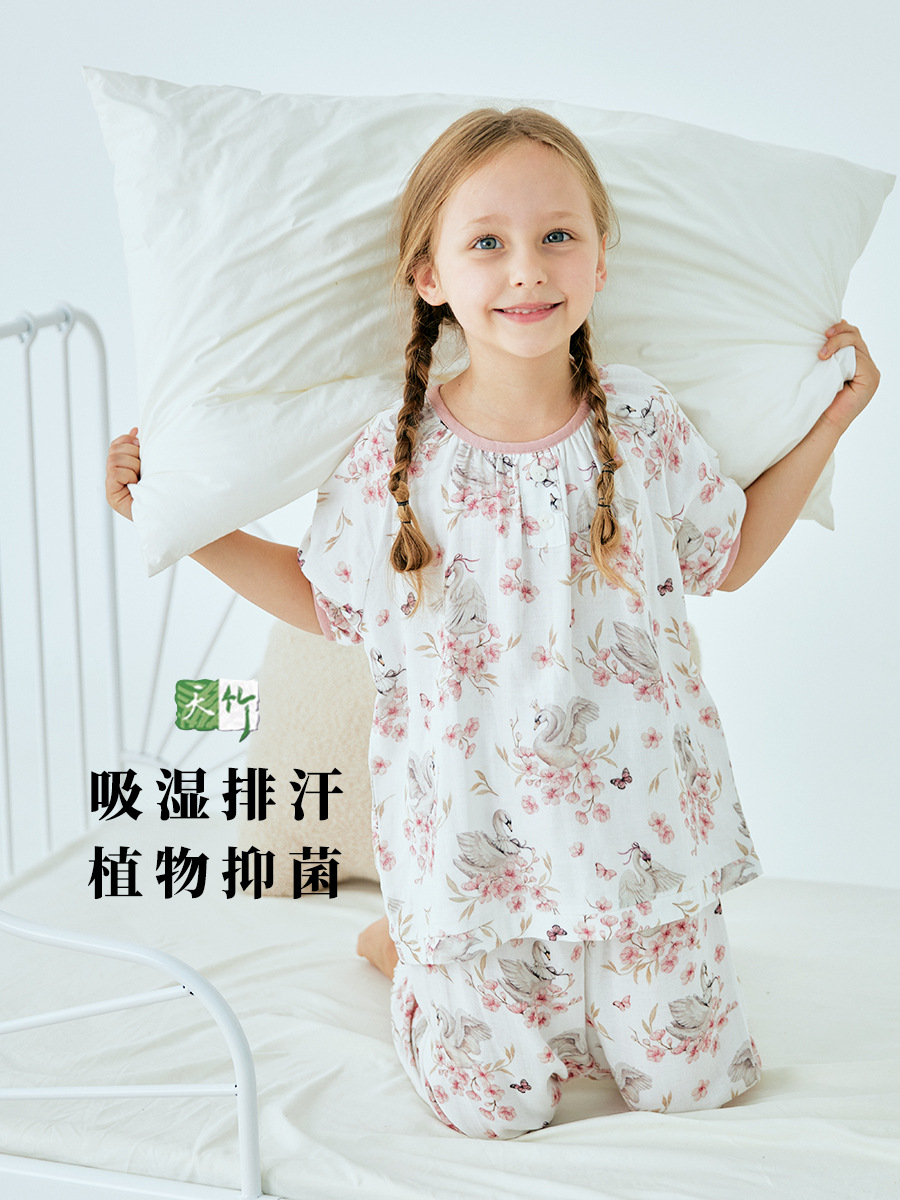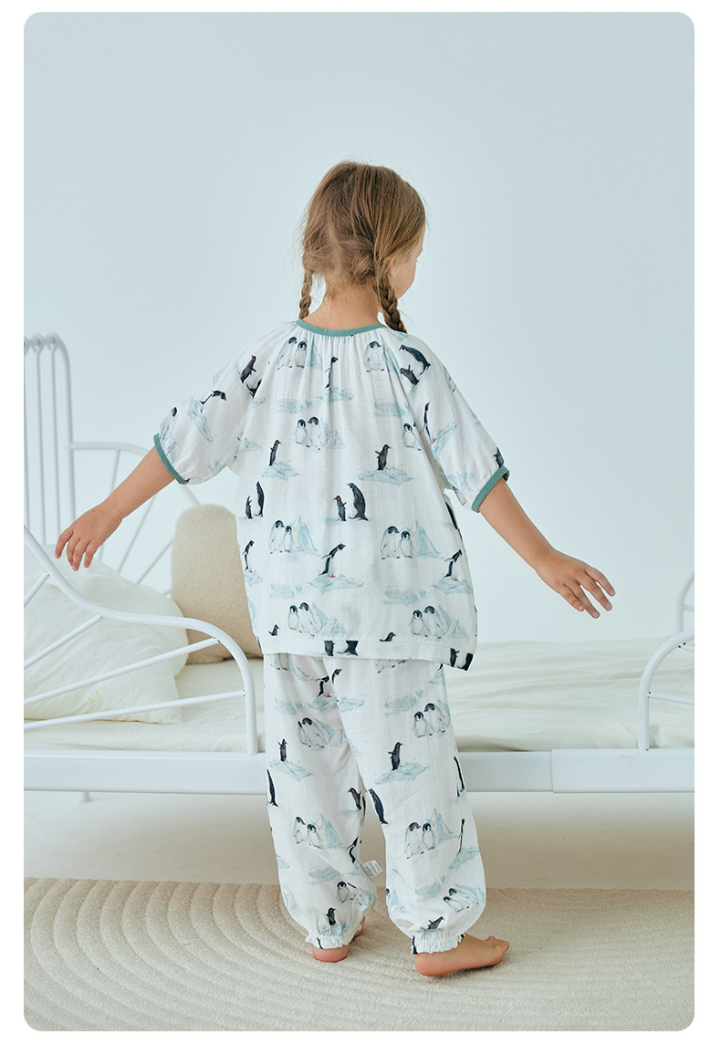 Xiazhu Cotton Gauze 유치원 통기성 에어컨 셔츠 소년의 모기 방지 바지 소녀 어린이 홈 의류 세트