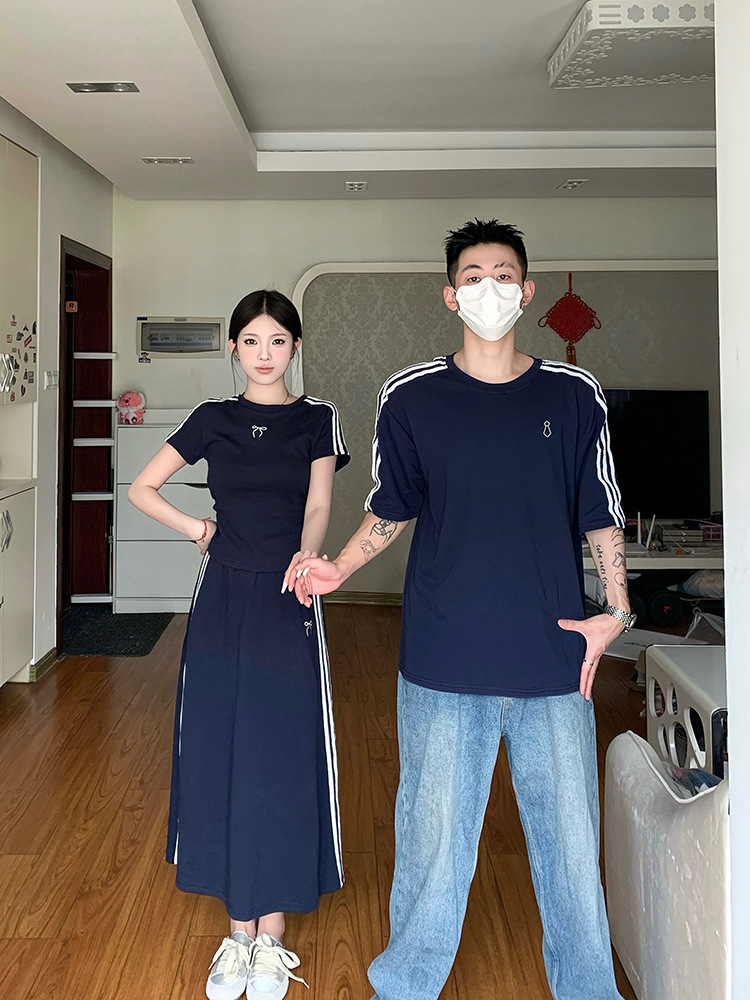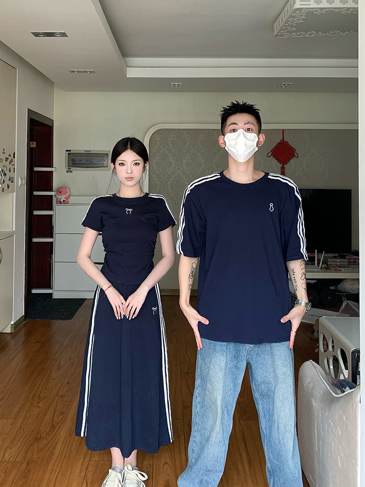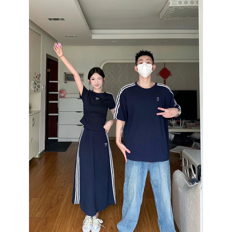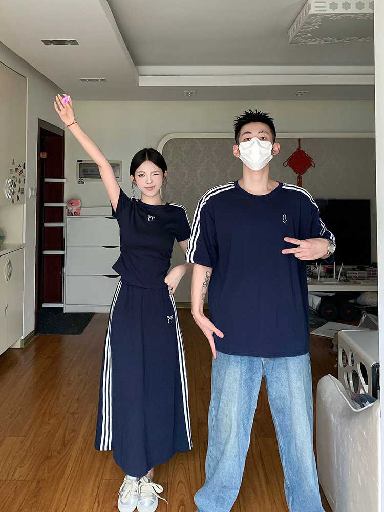 리얼 샷 여름 반팔 티셔츠 커플 니트 세트 코튼 탑 스커트