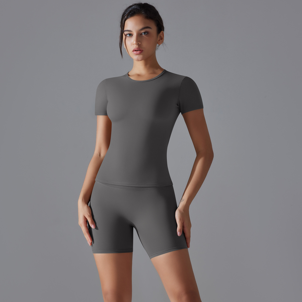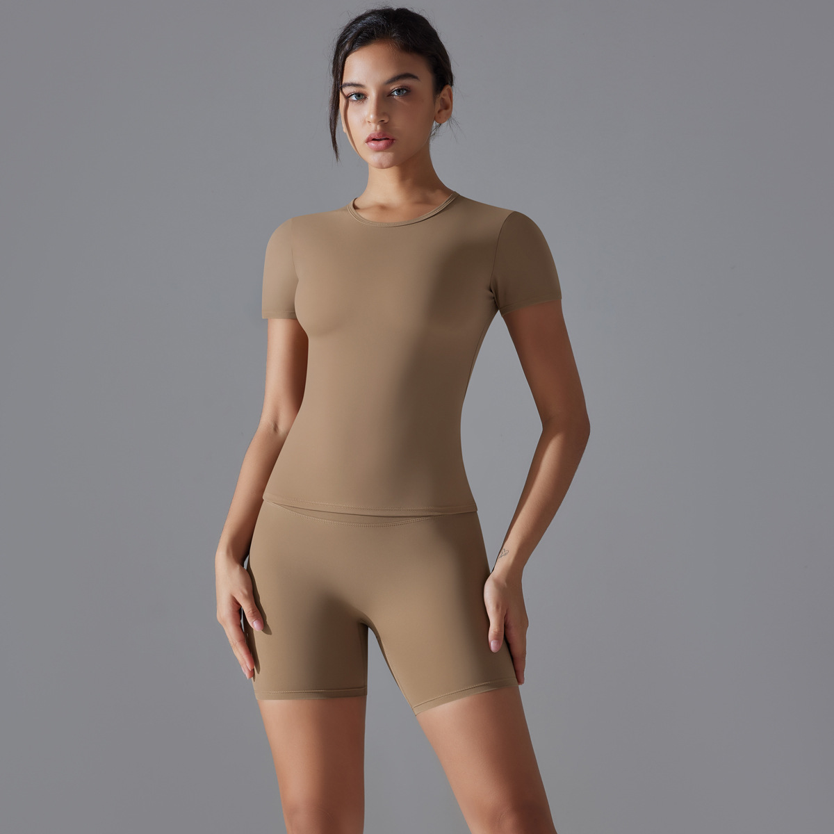 유럽과 미국의 알몸 반팔 티셔츠 요가 의류 세트 높은 허리 엉덩이 리프팅 타이트 반바지 빠른 건조 달리기 스포츠 피트니스 의류스토어 가기