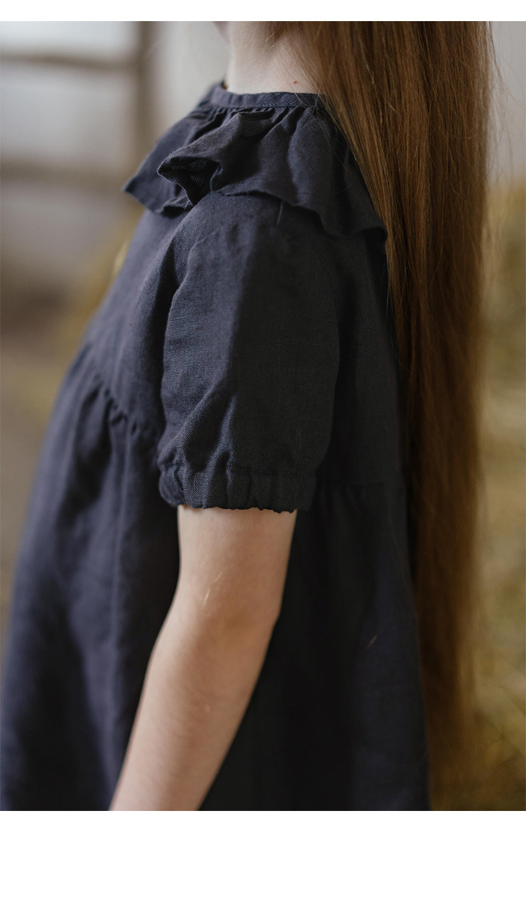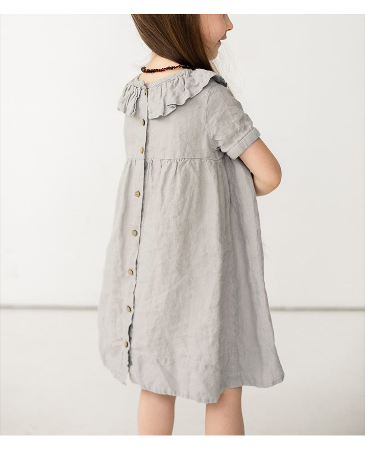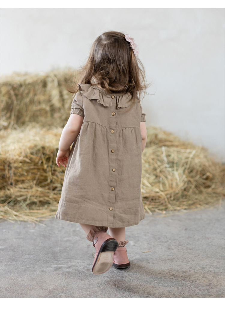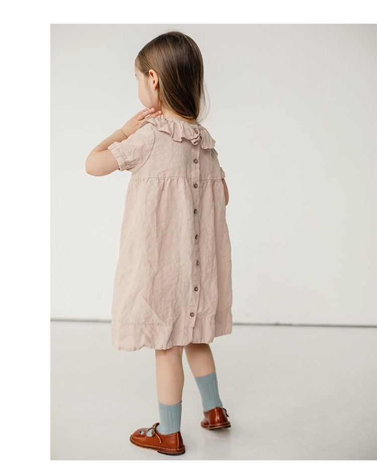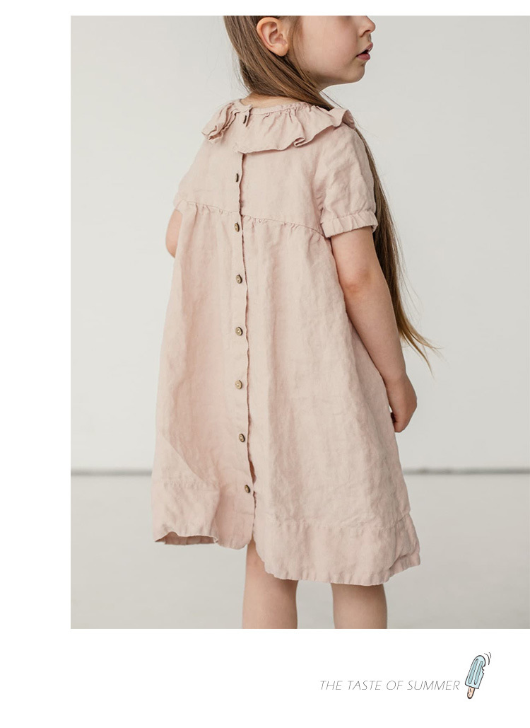 여름면 및 린넨 아동복 러플 크루 넥 허리 주름 스커트 백 나무 싱글 브레스트 버블 슬리브 원피스