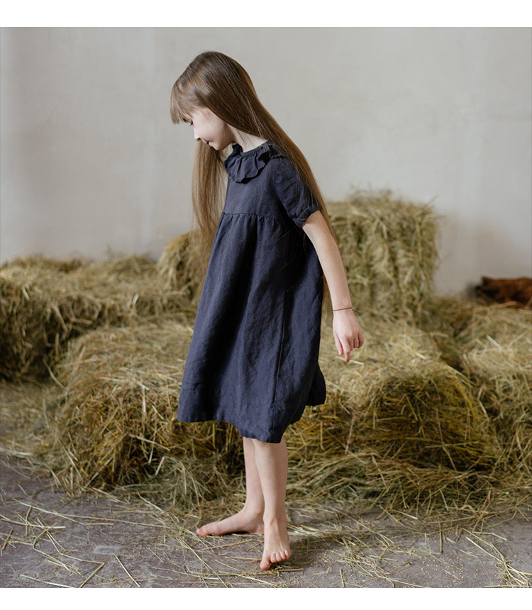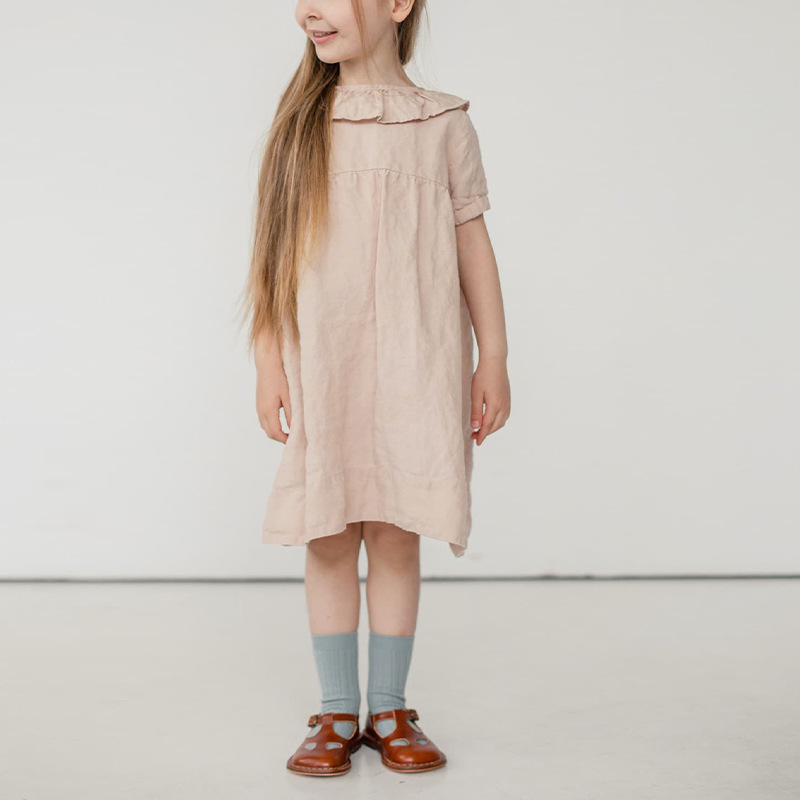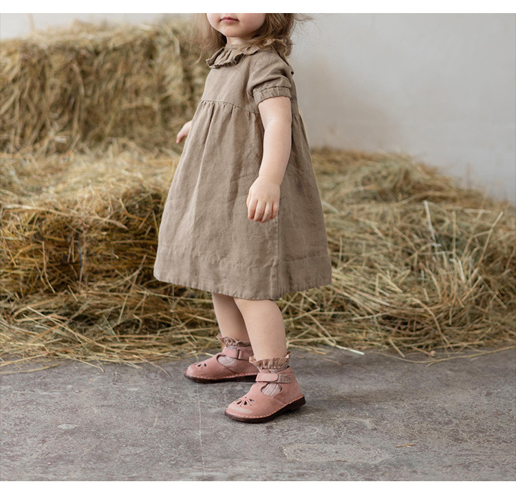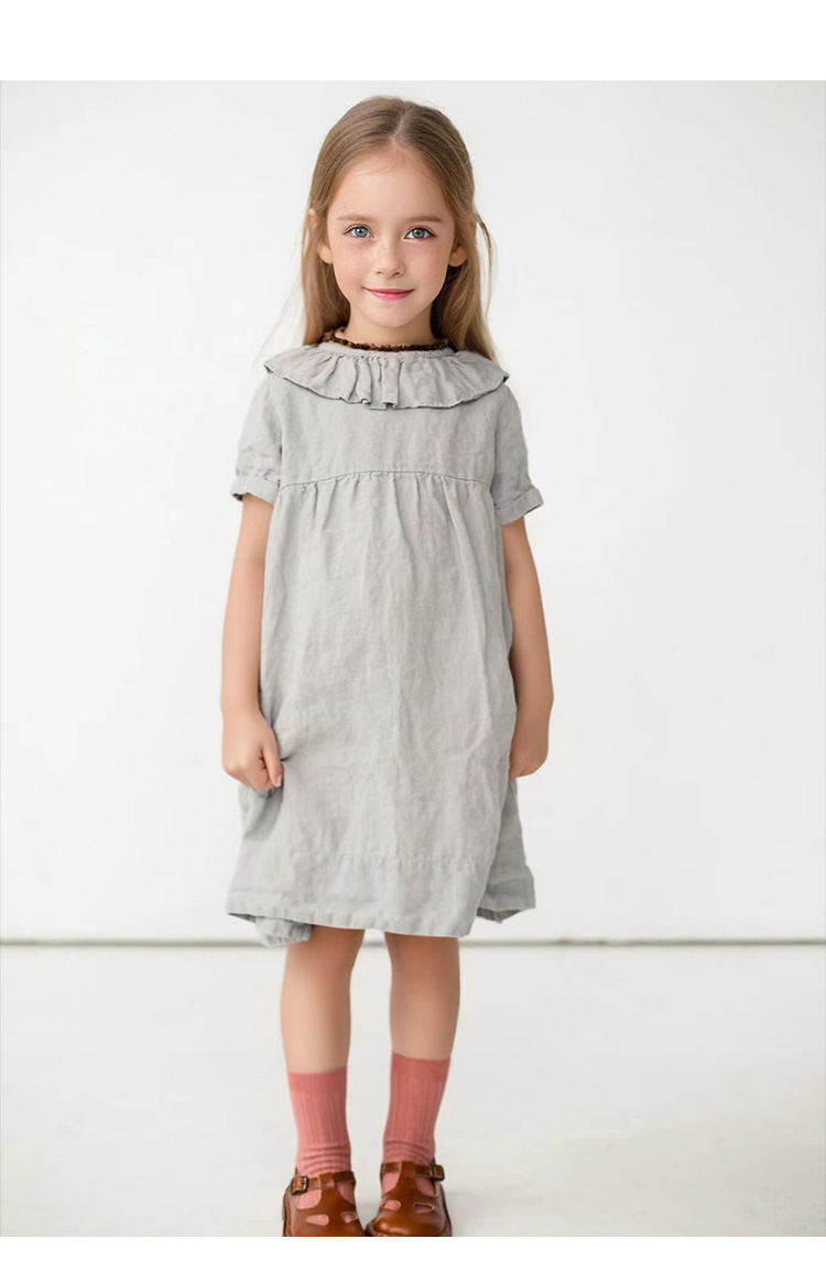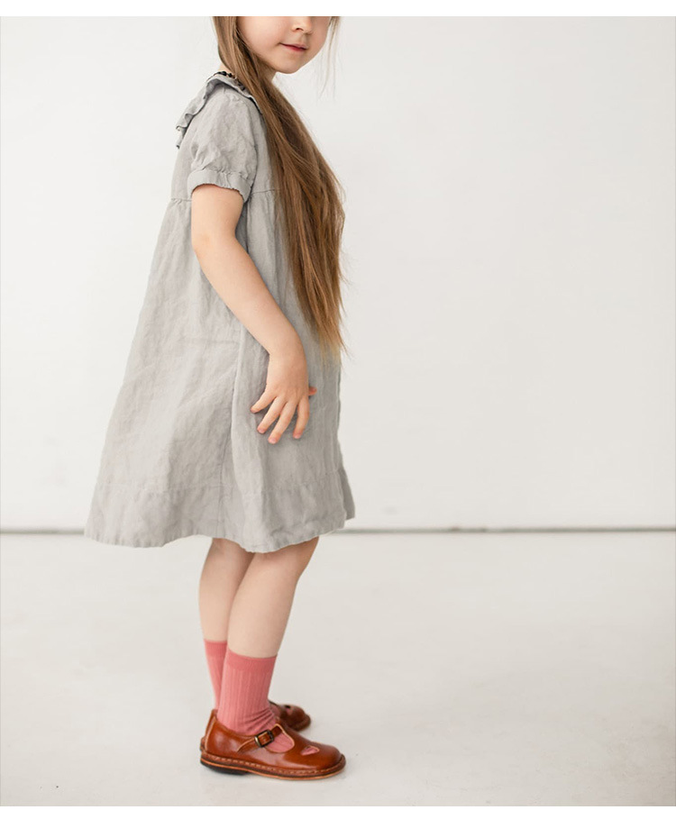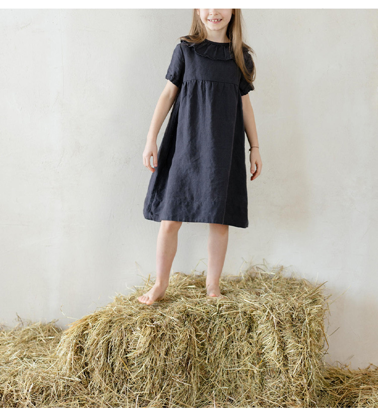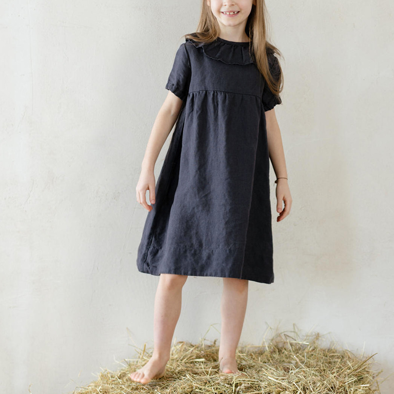 여름면 및 린넨 아동복 러플 크루 넥 허리 주름 스커트 백 나무 싱글 브레스트 버블 슬리브 원피스